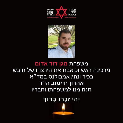 אהרון חיימוב הי"ד, נרצח בידי מחבלים בני עוולה כשהיה בדרכו להציל פצועים במסגרת תפקידו כחובש בכיר במד"א | הותיר אחריו משפחה מפוארת, אלמנה ושני ילדים המבכים מרה את לכתו הטרגי