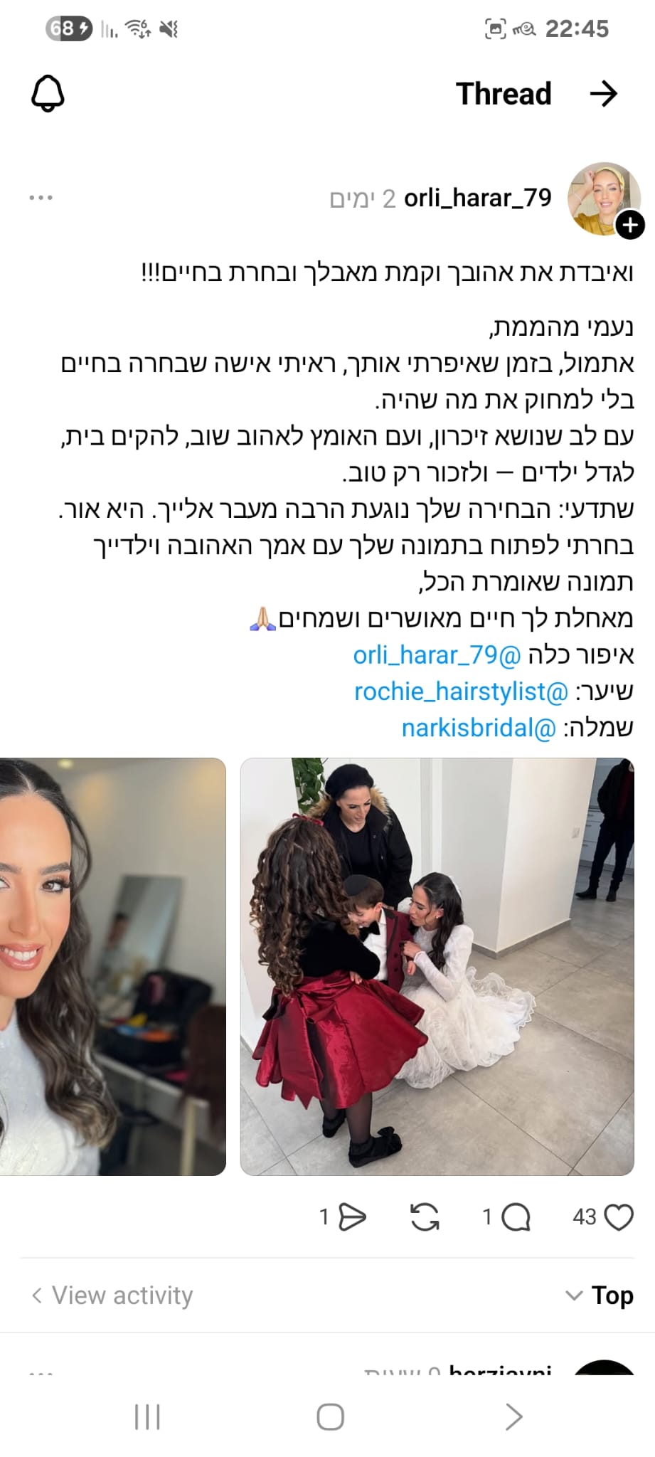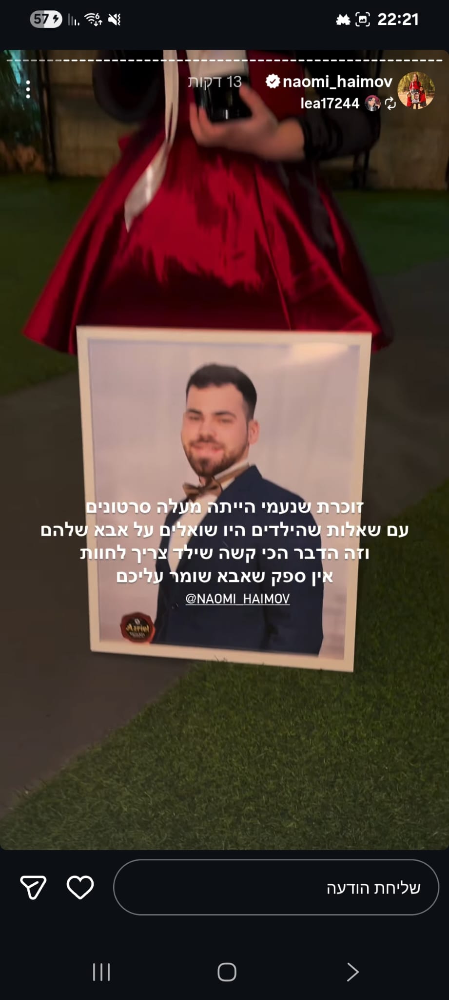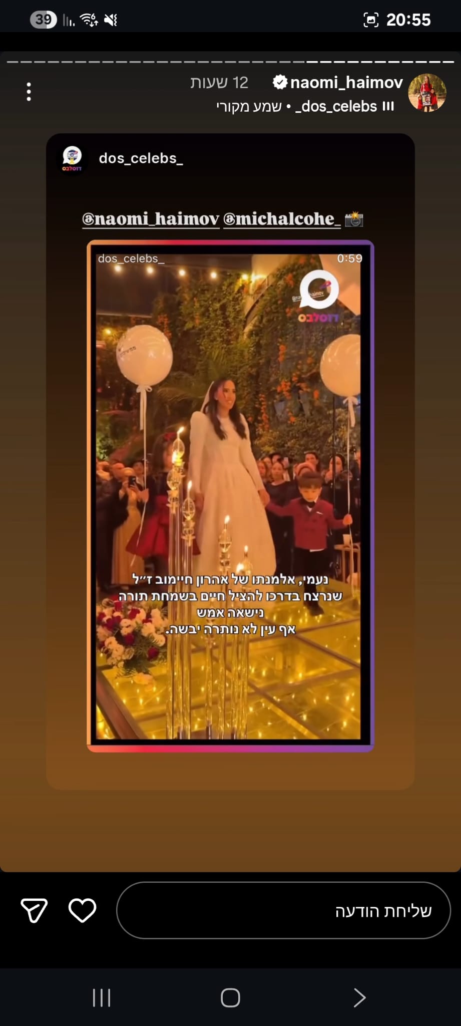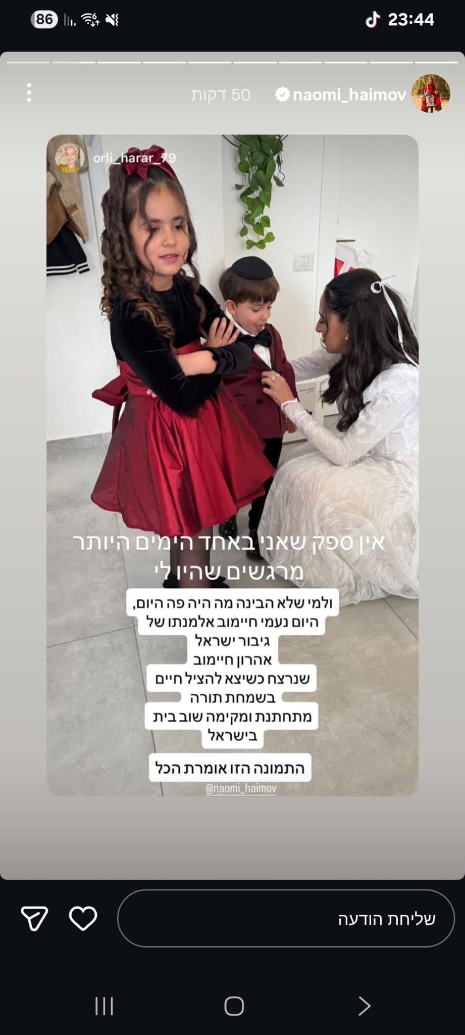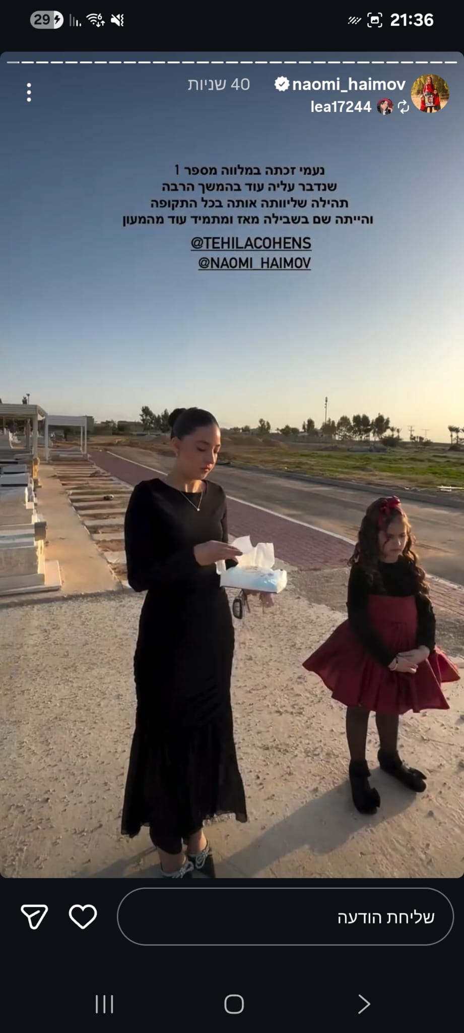 לי ולאהרון חיימוב יש המון חוויות מדהימות ומעצימות ביחד, כאלה שמייחדות אותנו ואת הקשר הדואג שלנו והמכנה המשותף של כולן הוא הלקח לחיים והכלים והערכים שאהרון הקנין בי, מורה לחיים והשראה לכולם, הבן אדם הכי טהור עם הלב הכי ענק שאני מכירה, תמיד בלי ציפייה לתמורה וללא תנאים היה שם לצידי כל פעם ופעם מחדש, תמך בי לאורך כל המכשולים, העליות והירידות, הכווין אותי והנחה אותי בצורה ובדרך שאף אחד אחר לא ידע, היה לו חשוב לשמח, להרים, לעודד, לאהוב, הוא כל כך חסר, יש לו אצלי, אצלנו מקום שרק הוא יכל למלא, אני יודעת שאתה ממשיך לשמור עליי גם שם מלמעלה, אחי הגדול מקווה שאני עושה אותך גאה, מתגעגעת ואמשיך להתגעגע לעד🤍