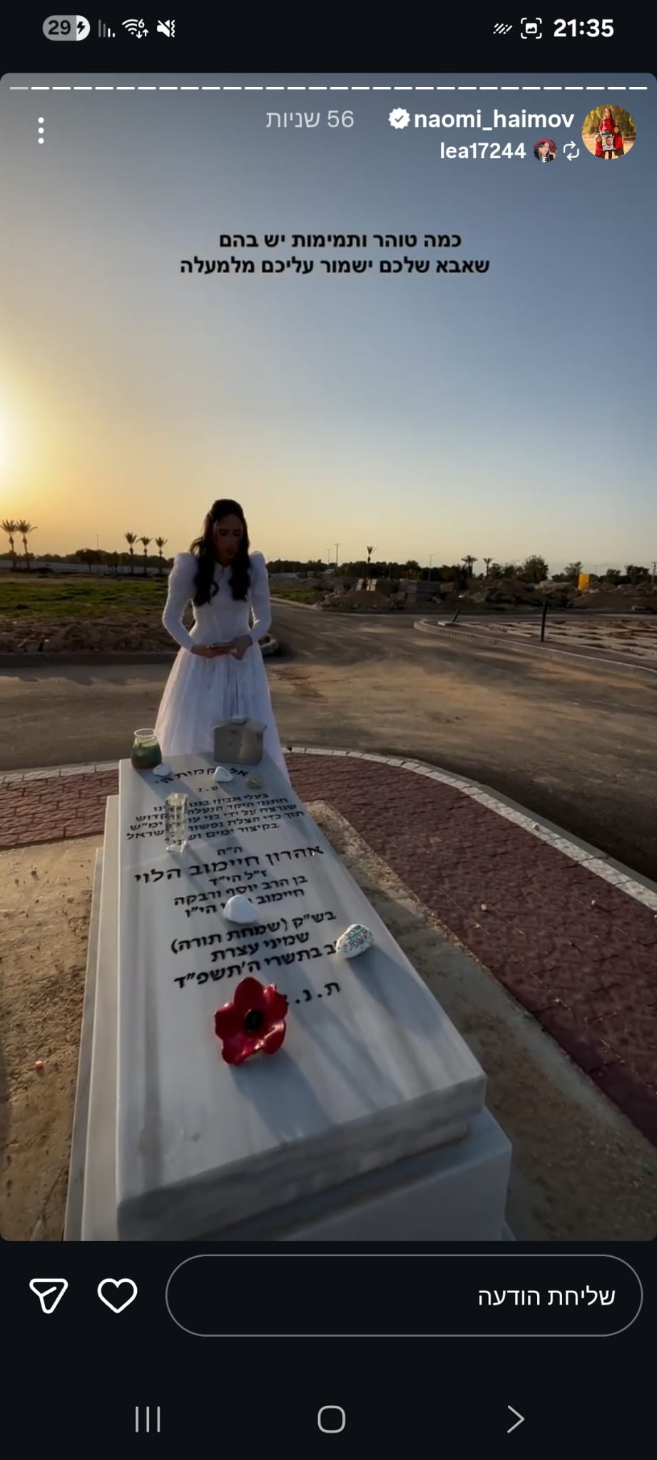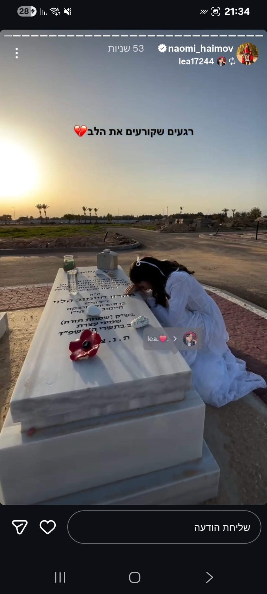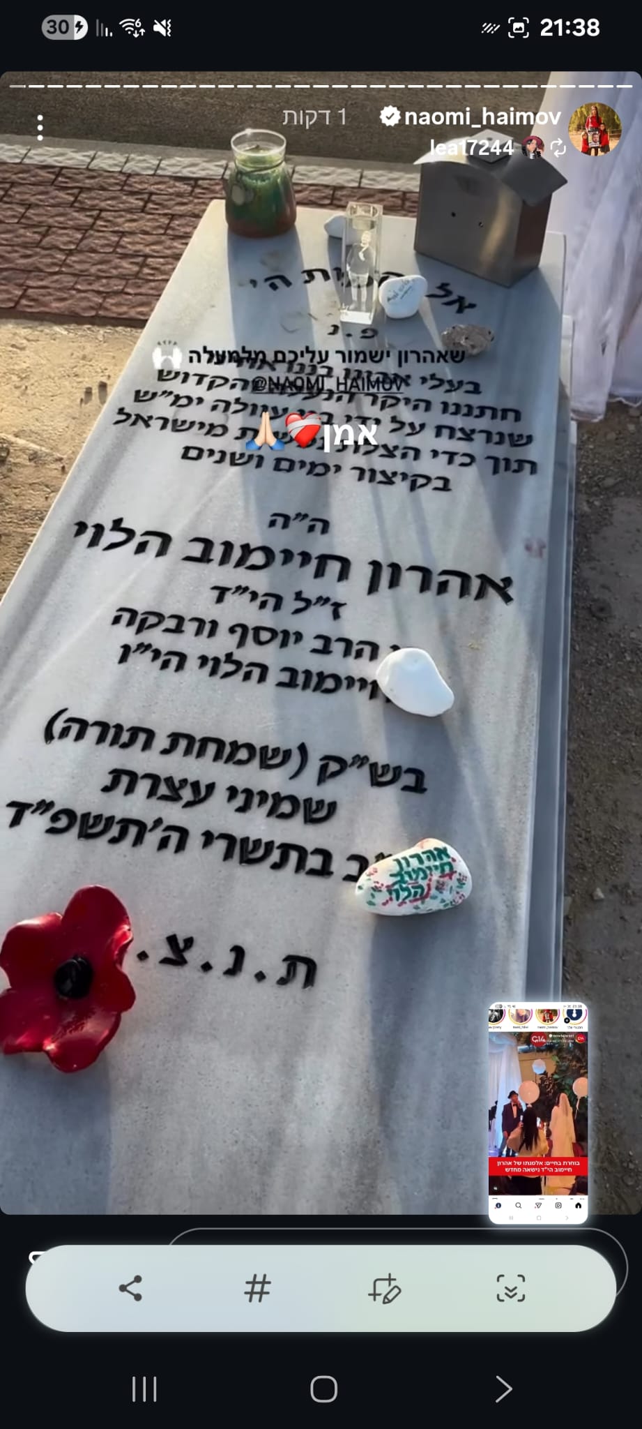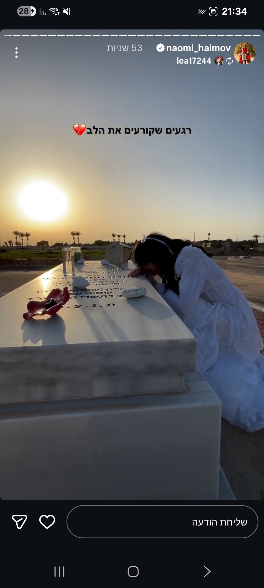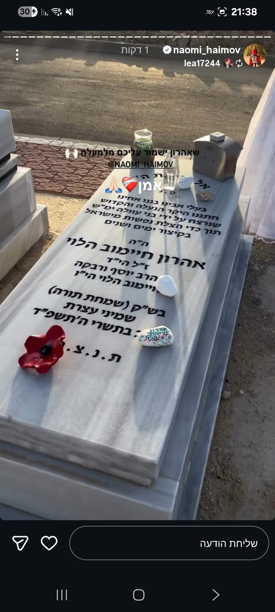 ואז בצחוק אומרת לו "אני ממש רציתי שניפגש בסוכה ונוכל ביחד יהודי דתי וערבייה מוסלמית דתיה אך אילוהים לא רשם לנו את זה" , צחקנו יום שלם על זה אך לא ידעתי שבעוד כמה ימים נאבד אותו ובצורה הזאת 💔 עצוב שובר הלב, נורא חסר לנו בתחנה עם החיוך המיוחד שלו, תמיד אהב לעזור, כולם אהבו אותו, אין בן אדם שפגש אותו ולא התחבר אליו, אהרון היקר הכי לא קשור לפוליטה/שנאה, אחד האנשים הכי טובים שפגשתי בחיי עם לב לבן כמו תינוק ,מלאך 🤍 מתגעגעת מאוד לכל הצחוקים והשירים איתו באמבולנס המשמרות הכי כיפיות.