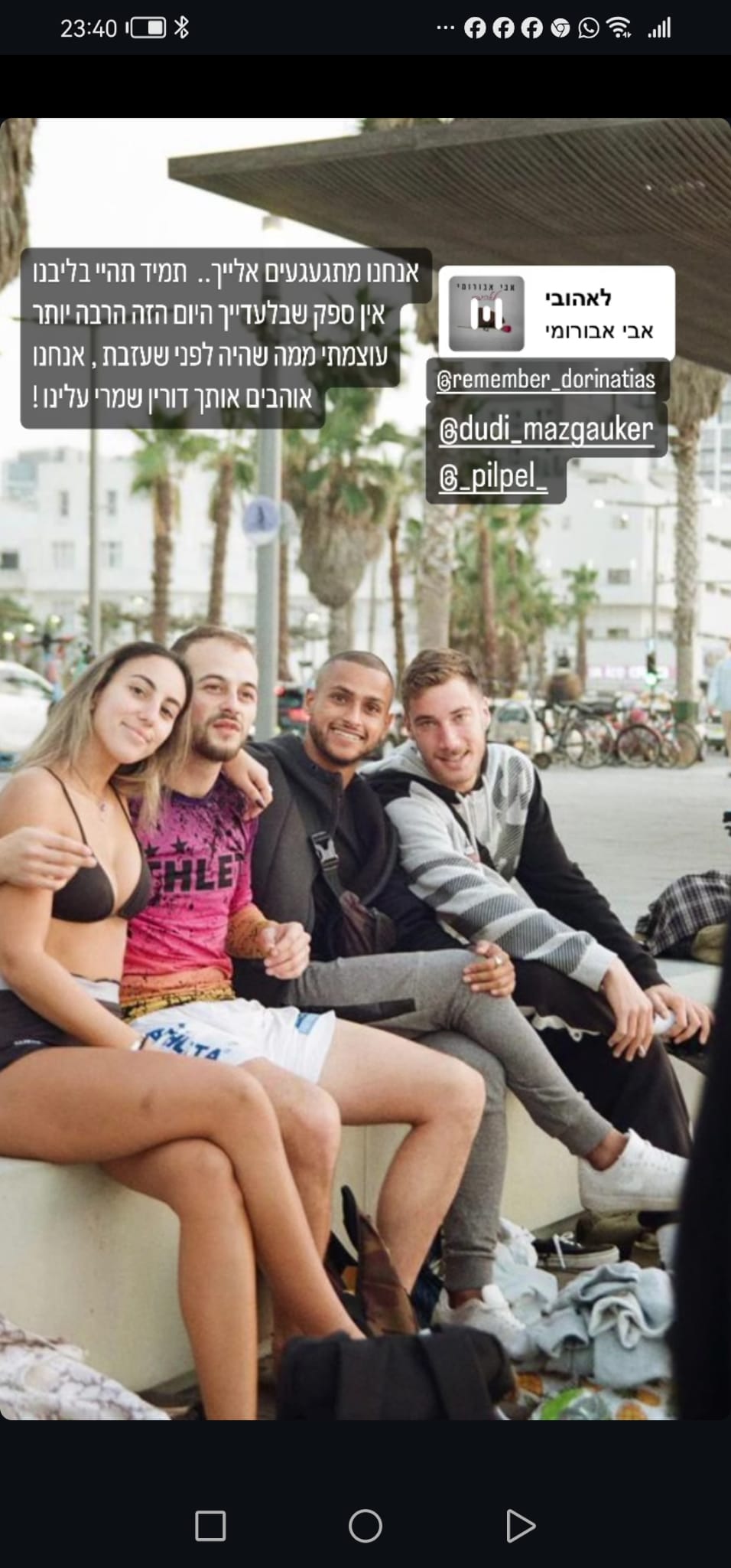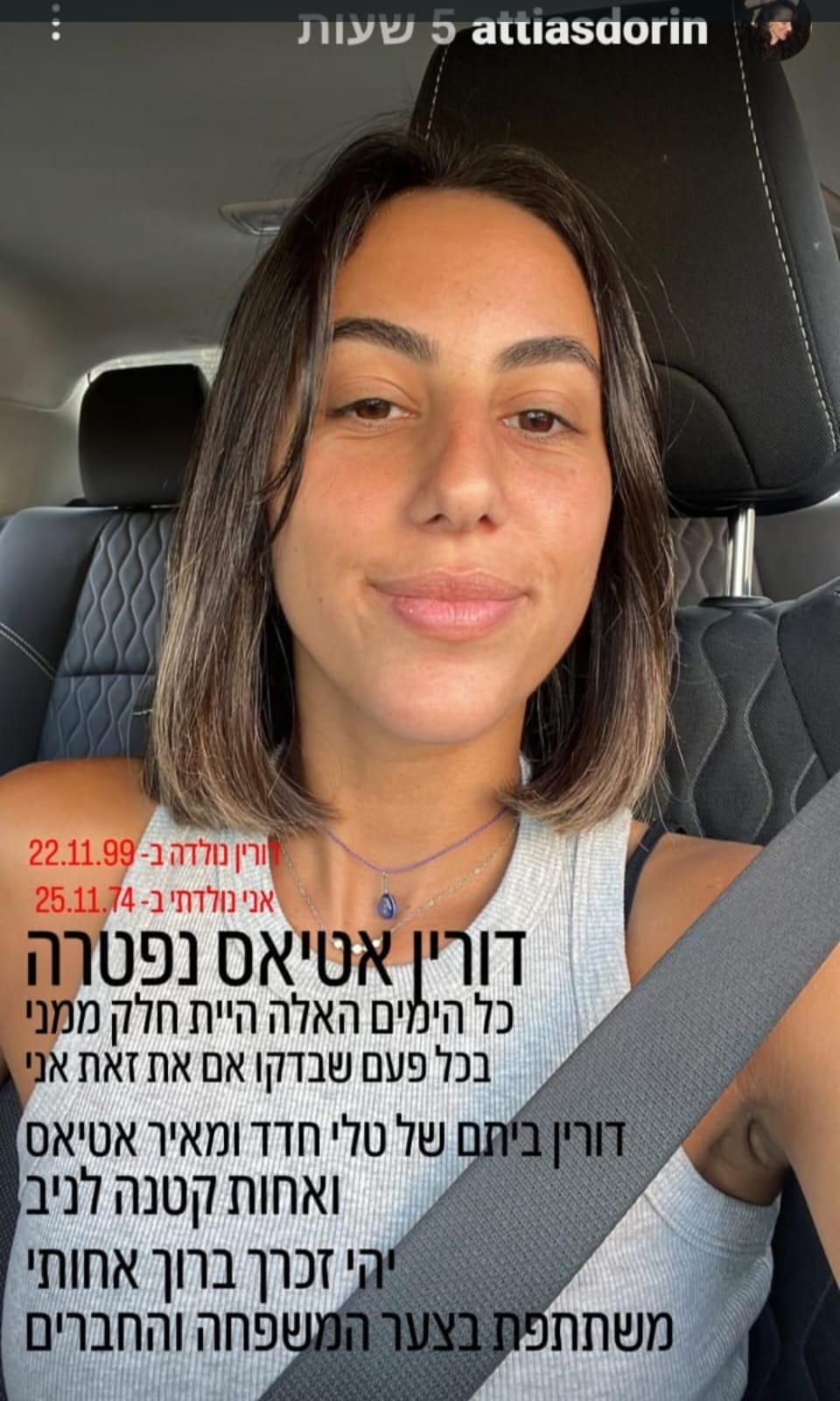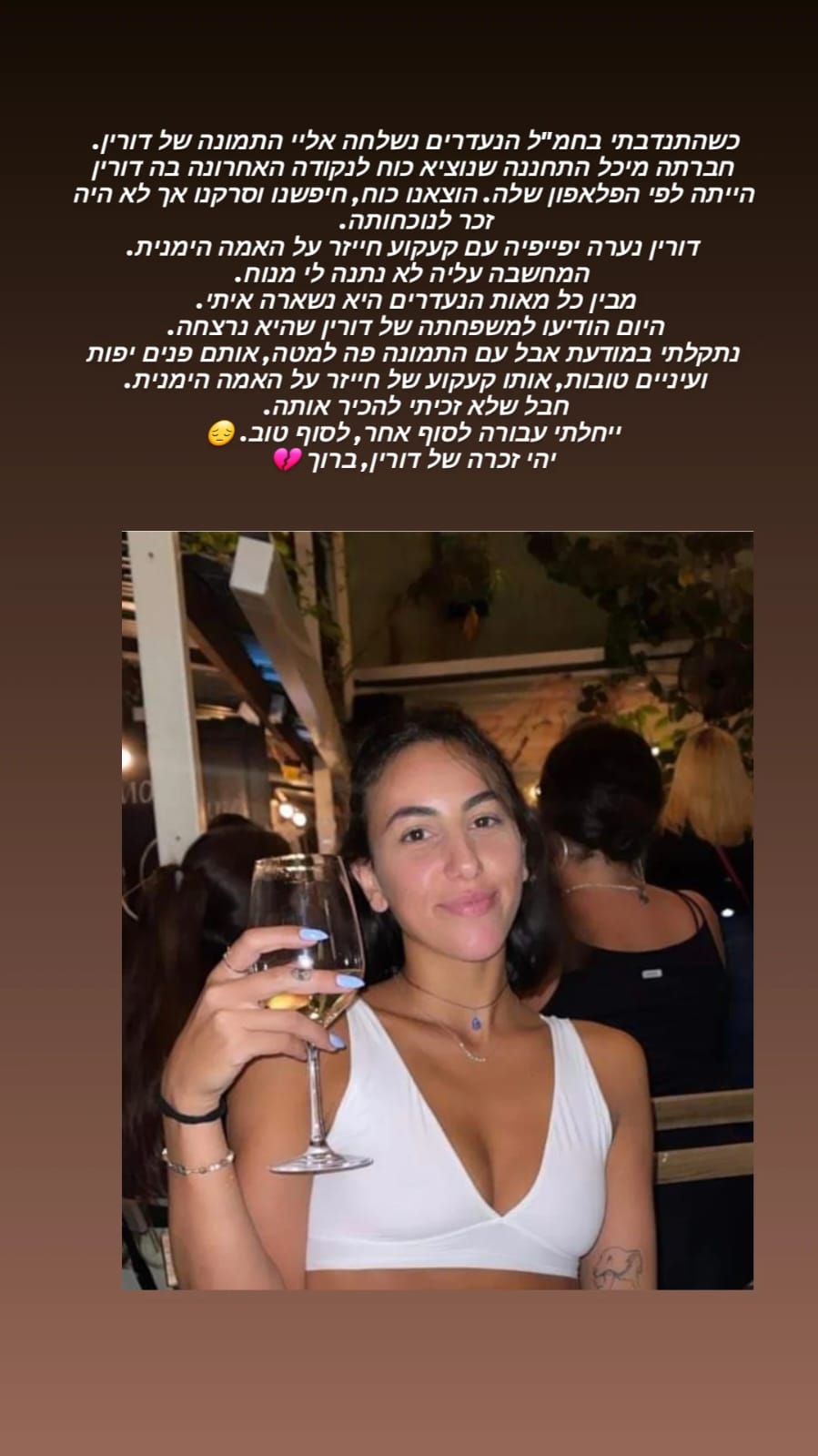 דורין הייתה איתי בנובה, ישבה איתנו בקאנטה על המסיבה, רקדנו ביחד ברחבה כרגיל מחייכת וגורמת לכולם סביבה לחייך. דורין באה לעבוד בנובה בערך 20 דקות לפני שהתחיל האסון. היא הלכה לברר מתי היא עולה לעבוד זה היה 20 דקות שכבר לא ראינו אחד את השנייה…💔