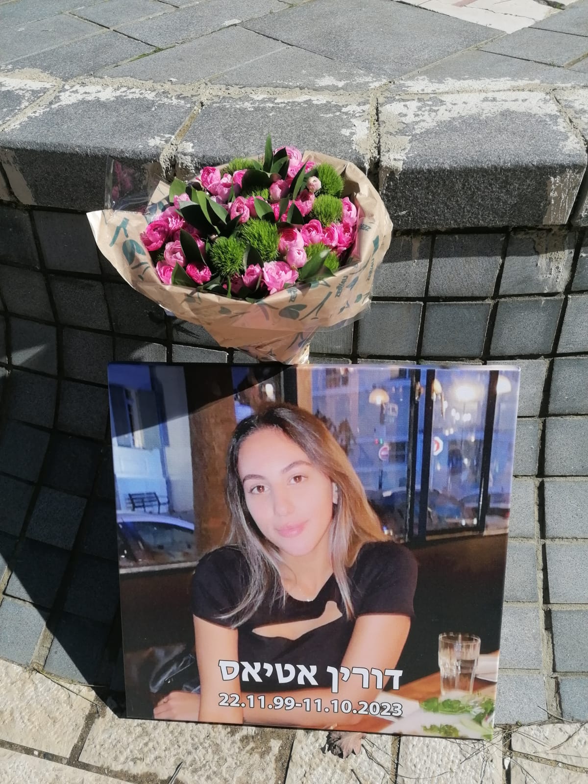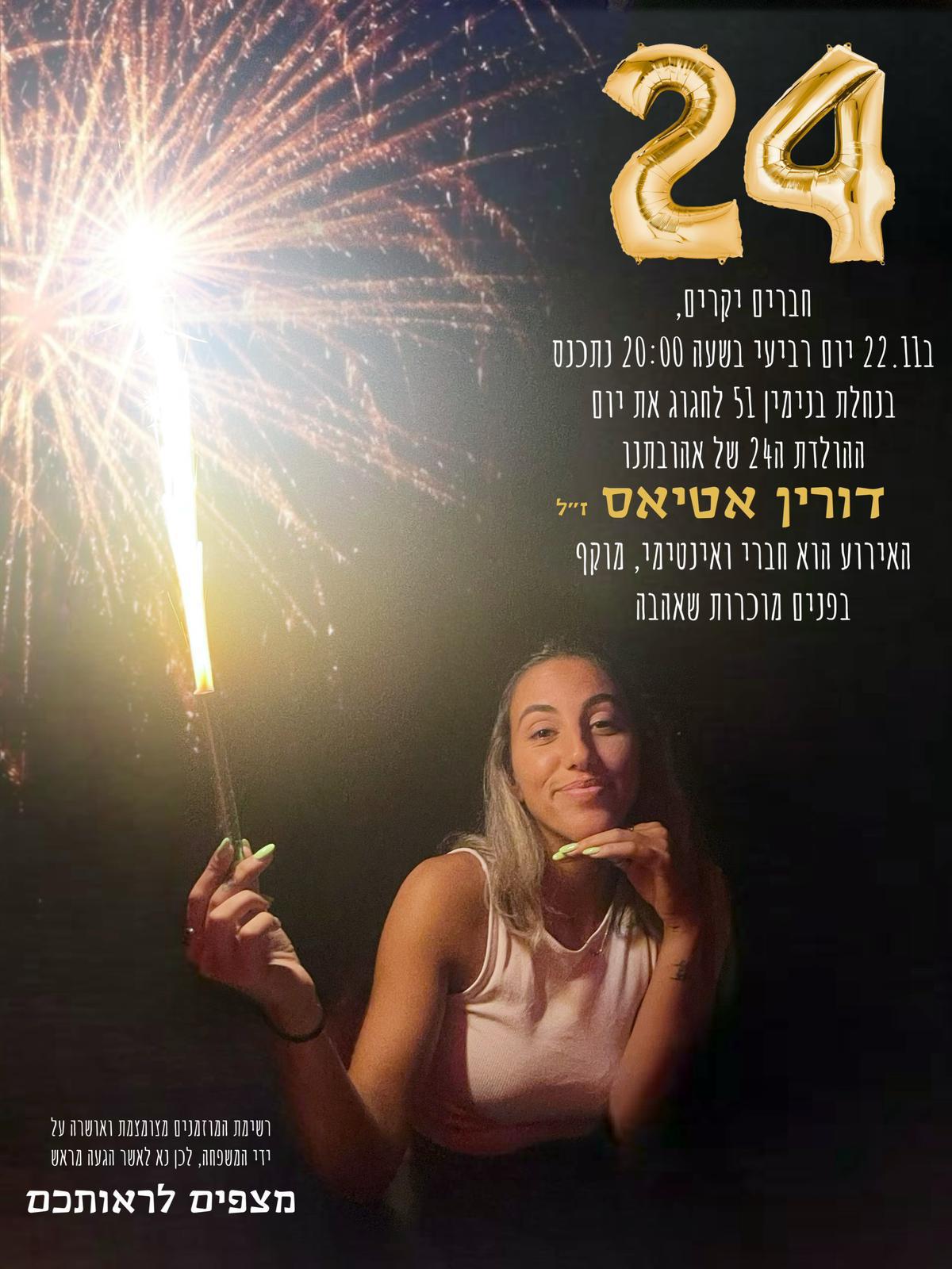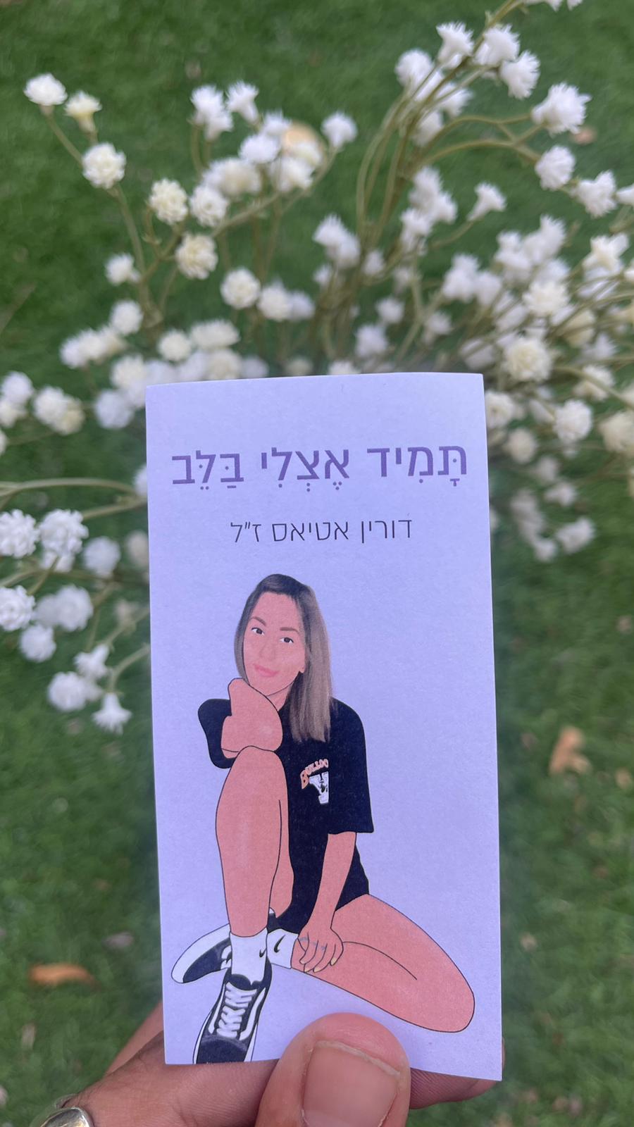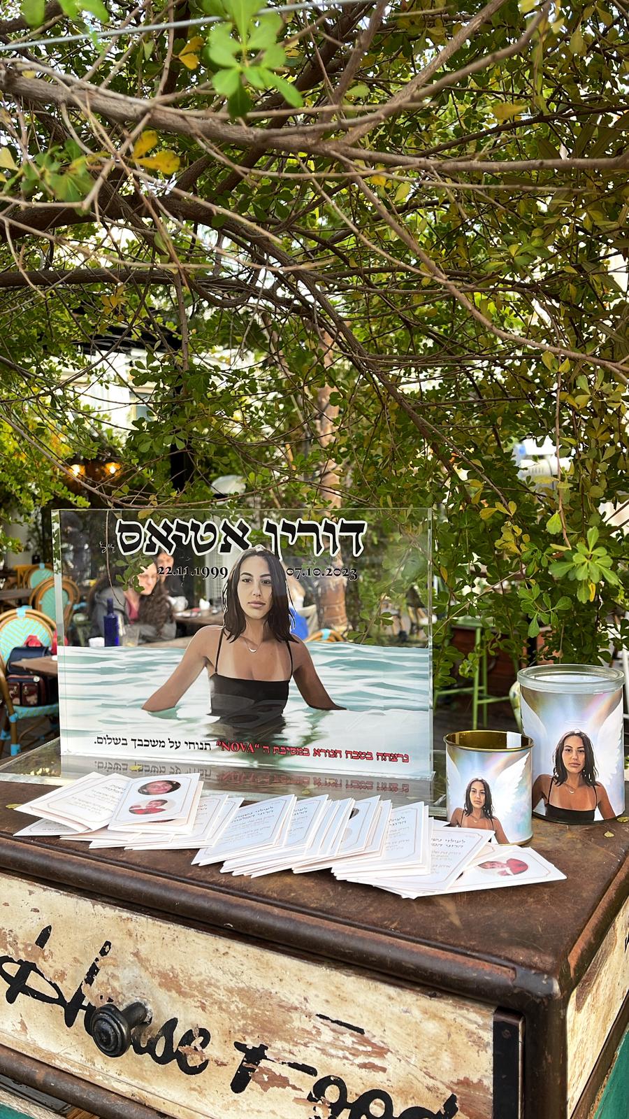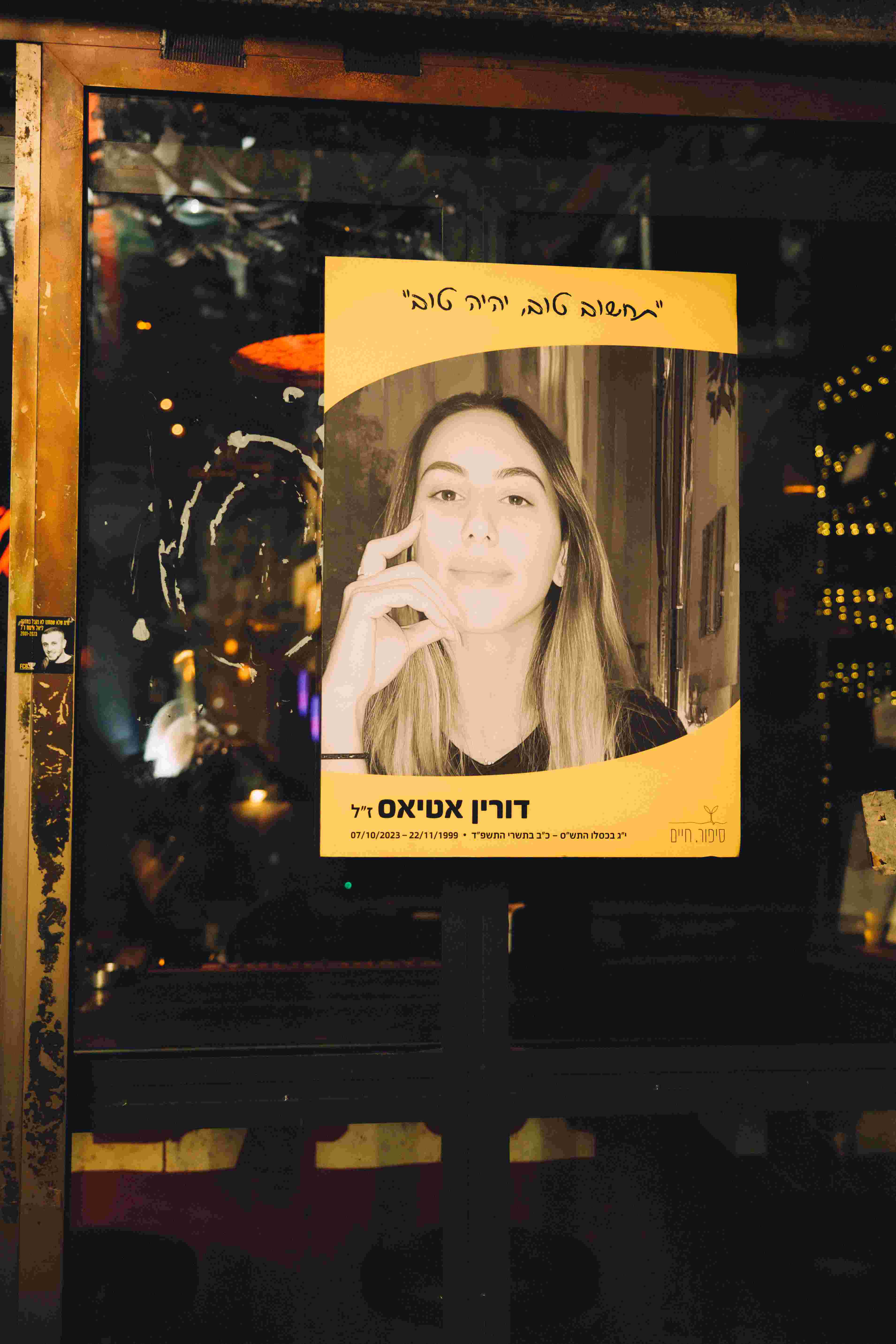 לזכרה של דורין אטיאס ז"ל. ורין, בתם של טלי ומאיר אטיאס, נולדה בי"ג בכסלו תש"ס (22.11.1999) בגני תקווה. אחות צעירה לניב, נרצחה בגיל 23 במתקפה על מסיבת הנובה.
