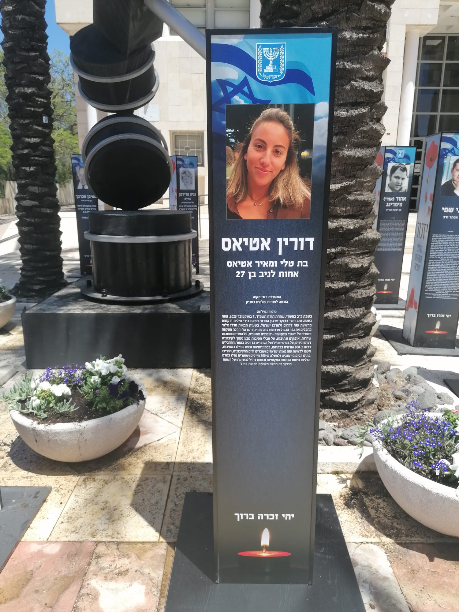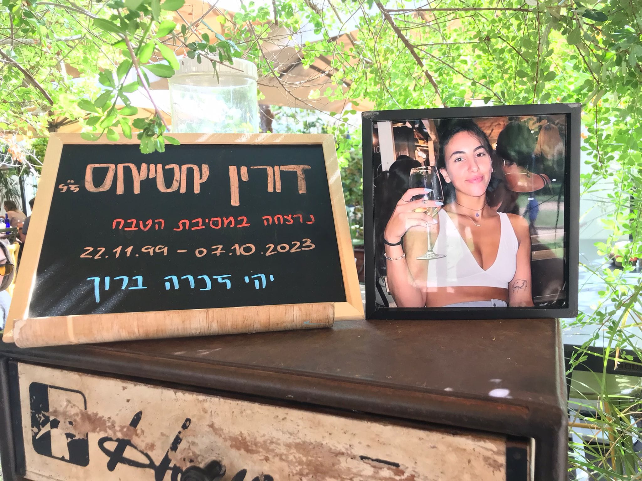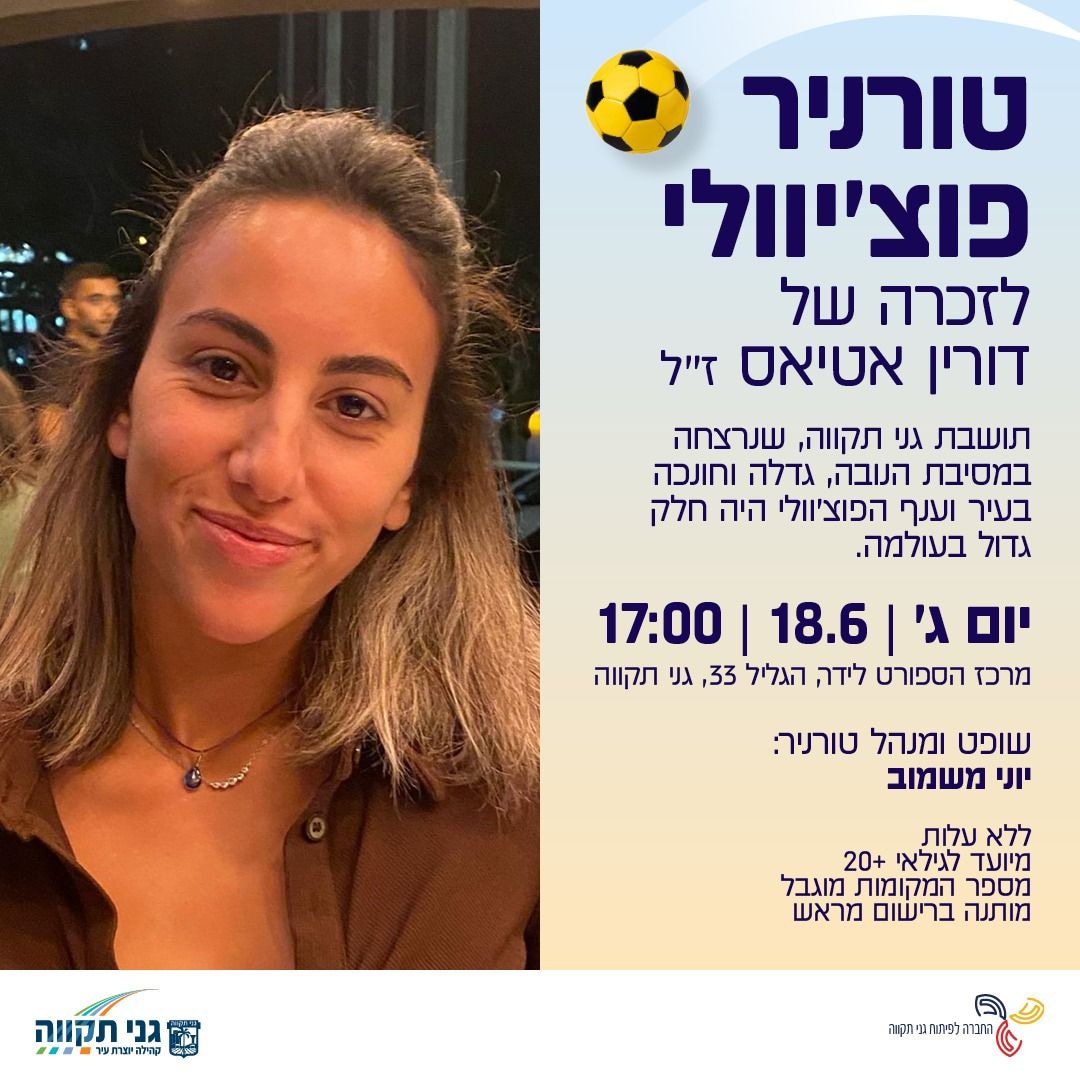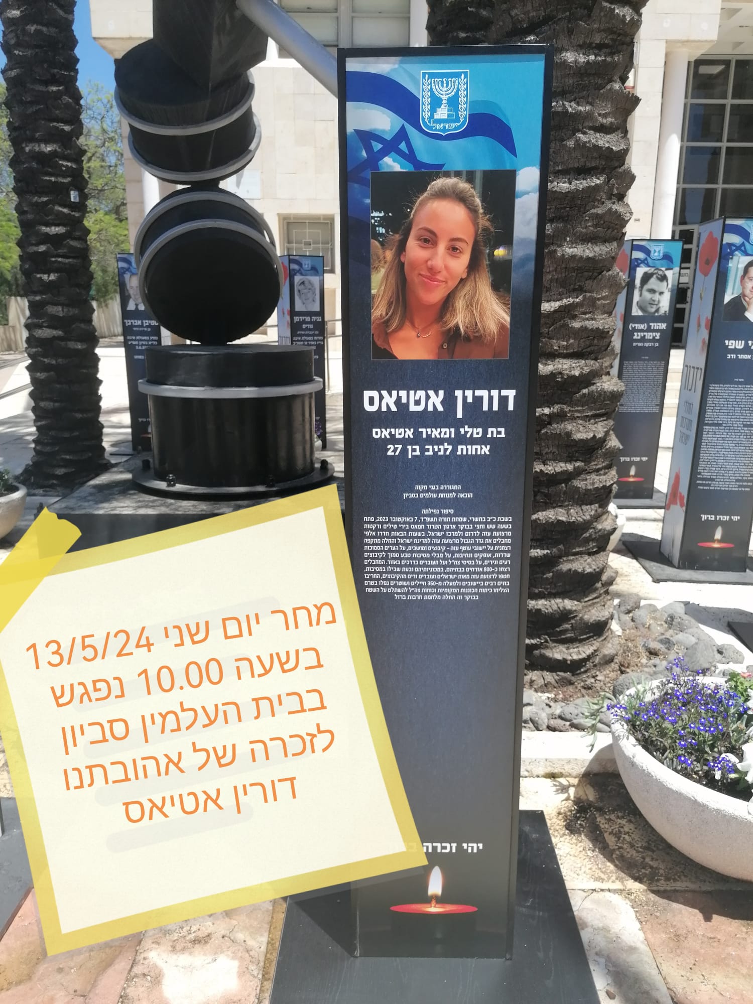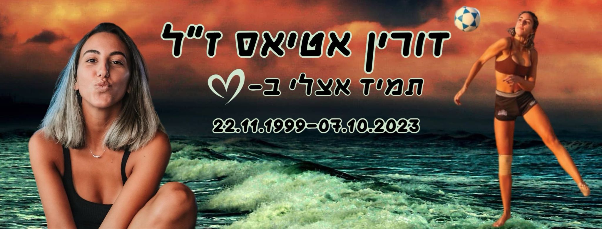 לזכרה של דורין אטיאס ז"ל. ורין, בתם של טלי ומאיר אטיאס, נולדה בי"ג בכסלו תש"ס (22.11.1999) בגני תקווה. אחות צעירה לניב, נרצחה בגיל 23 במתקפה על מסיבת הנובה.