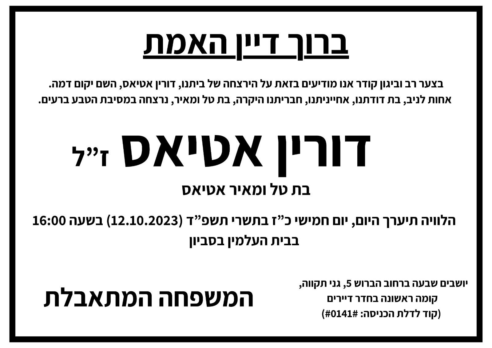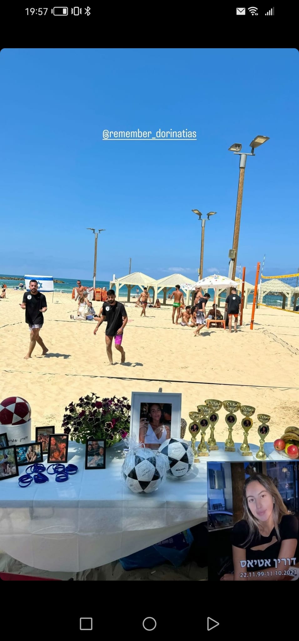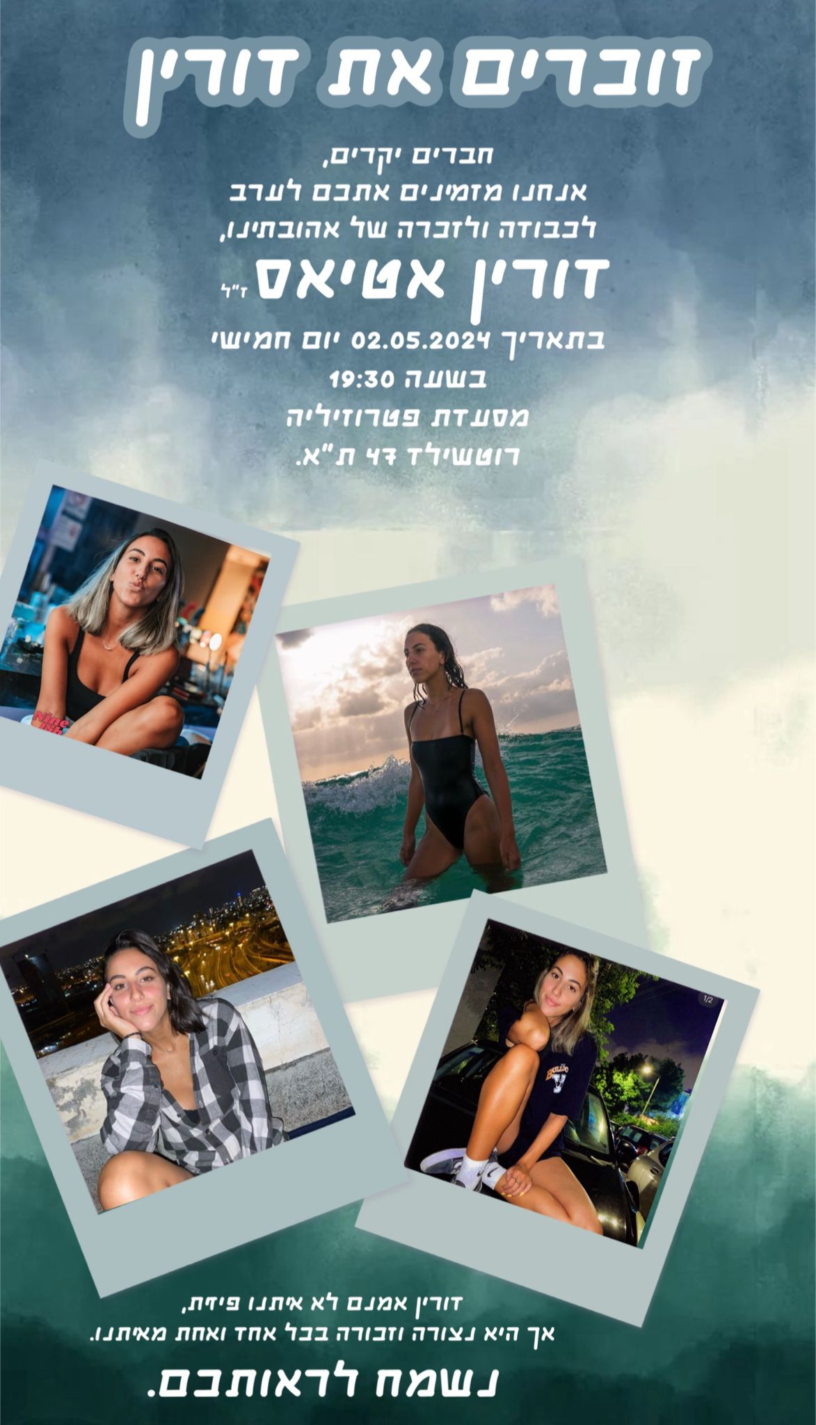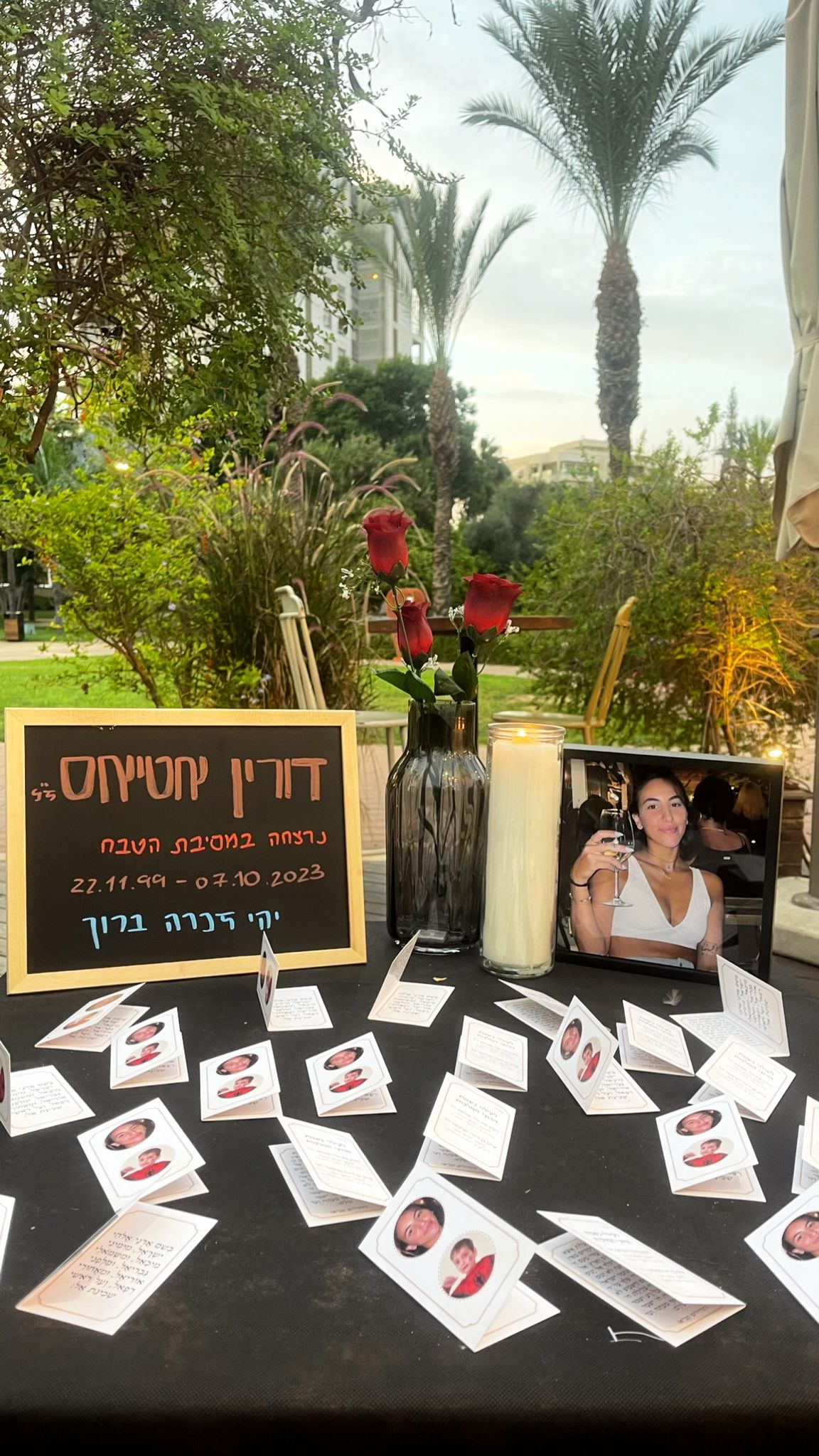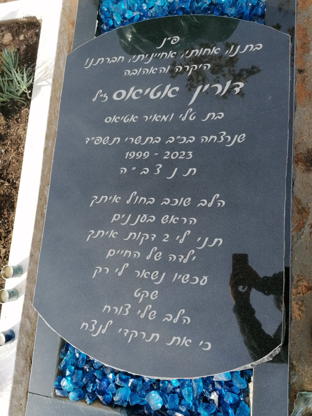 לזכרה של דורין אטיאס ז"ל. ורין, בתם של טלי ומאיר אטיאס, נולדה בי"ג בכסלו תש"ס (22.11.1999) בגני תקווה. אחות צעירה לניב, נרצחה בגיל 23 במתקפה על מסיבת הנובה.