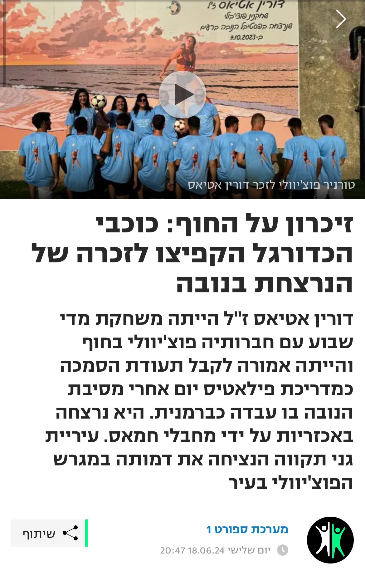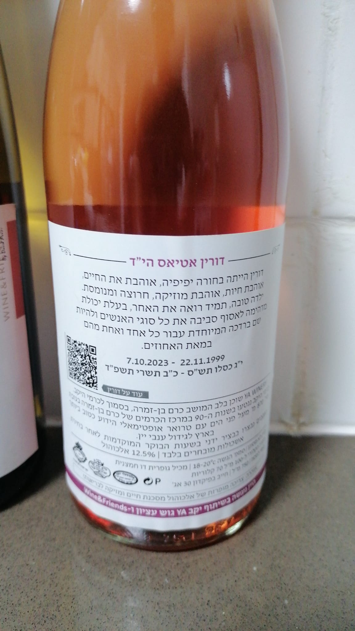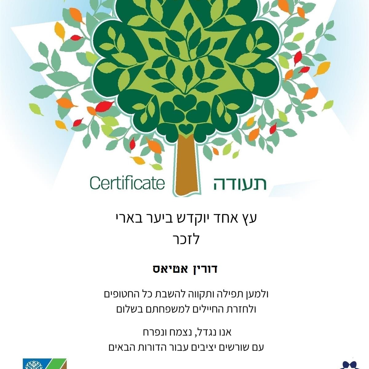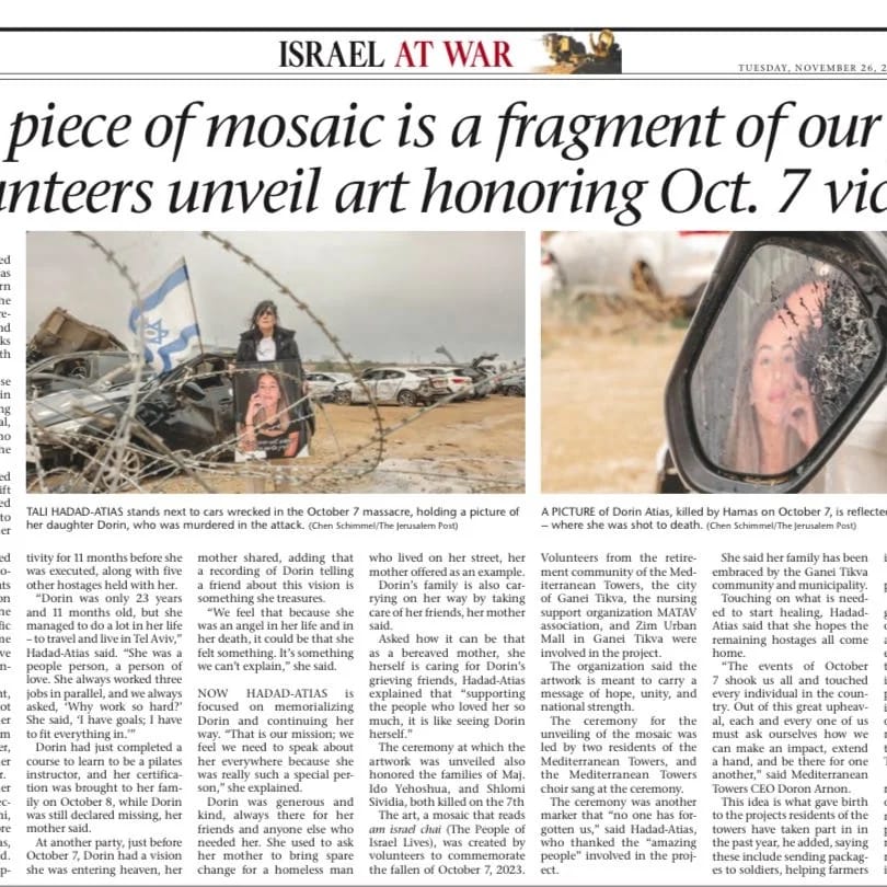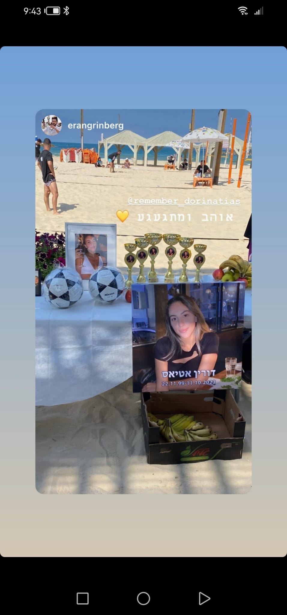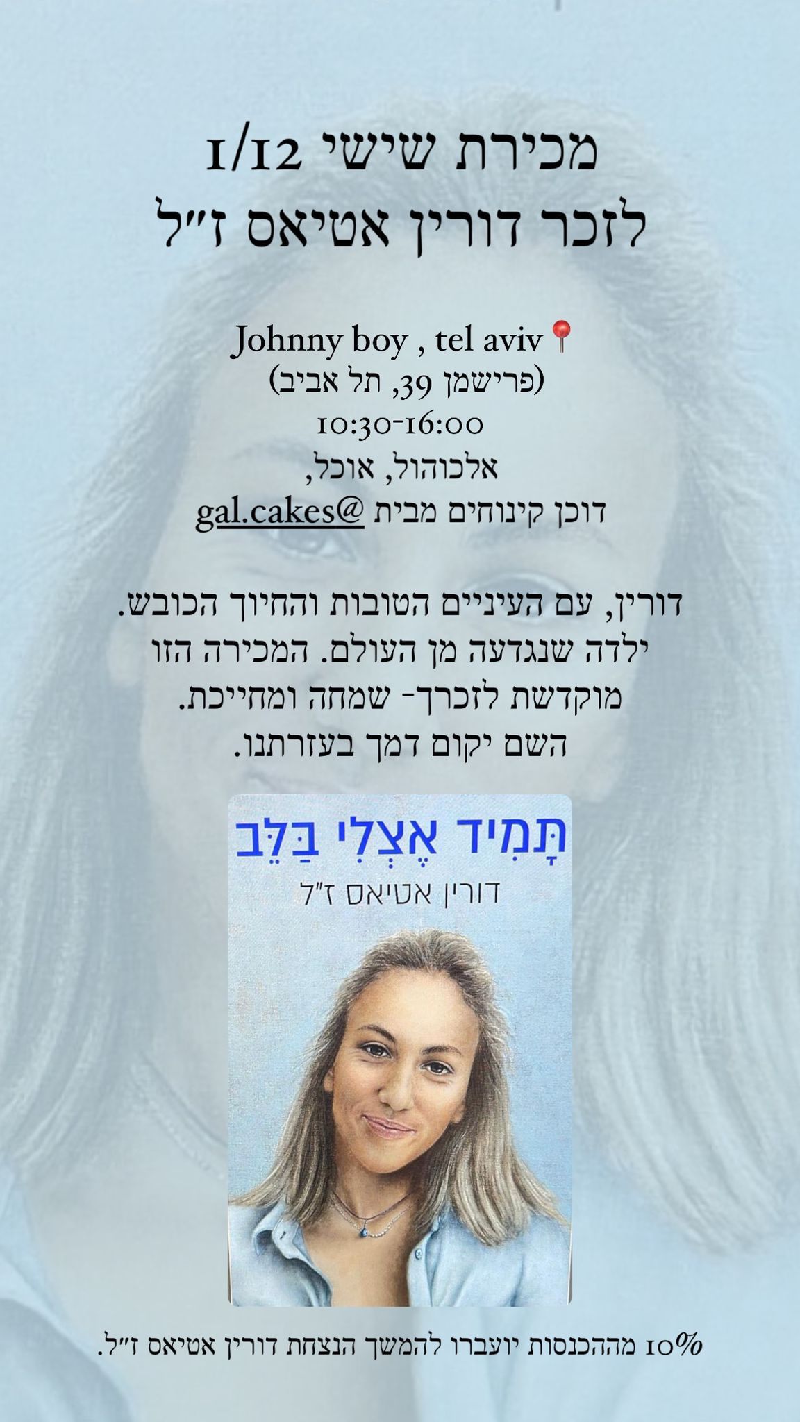 לזכרה של דורין אטיאס ז"ל. ורין, בתם של טלי ומאיר אטיאס, נולדה בי"ג בכסלו תש"ס (22.11.1999) בגני תקווה. אחות צעירה לניב, נרצחה בגיל 23 במתקפה על מסיבת הנובה.