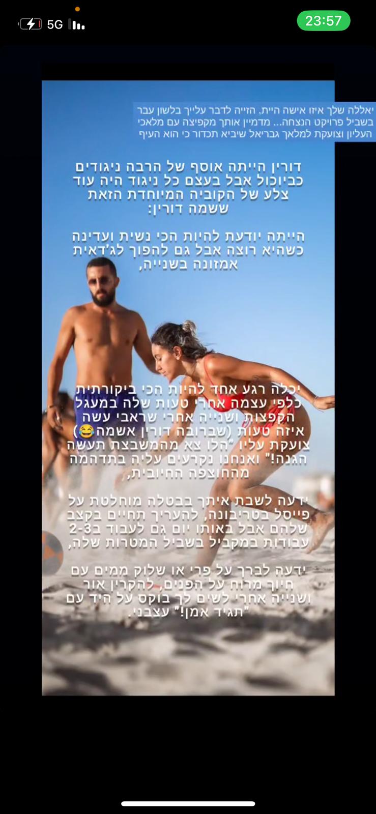 דורין בשבילי היא חברה אמיתית, שתמיד אפשר להגיד לה הכל ותמיד תגיד הכל בפנים. בחורה אמיתית שלא מוצאים כל יום. החוף הייתה פינת המפלט שלנו ממרוץ החיים ושם דורין פשוט לא הייתה מפסיקה לחייך ולהפיץ את האור והאהבה שלה לעולם.