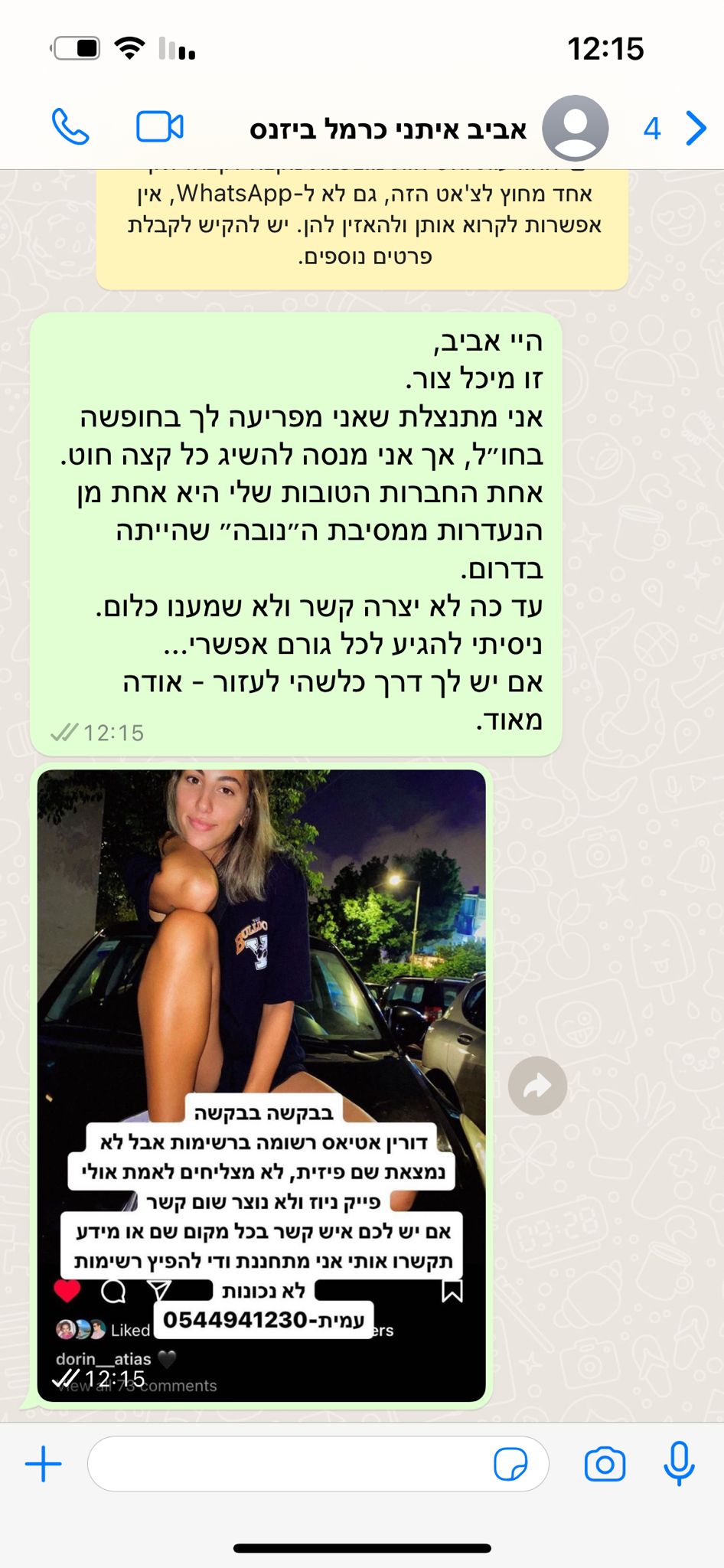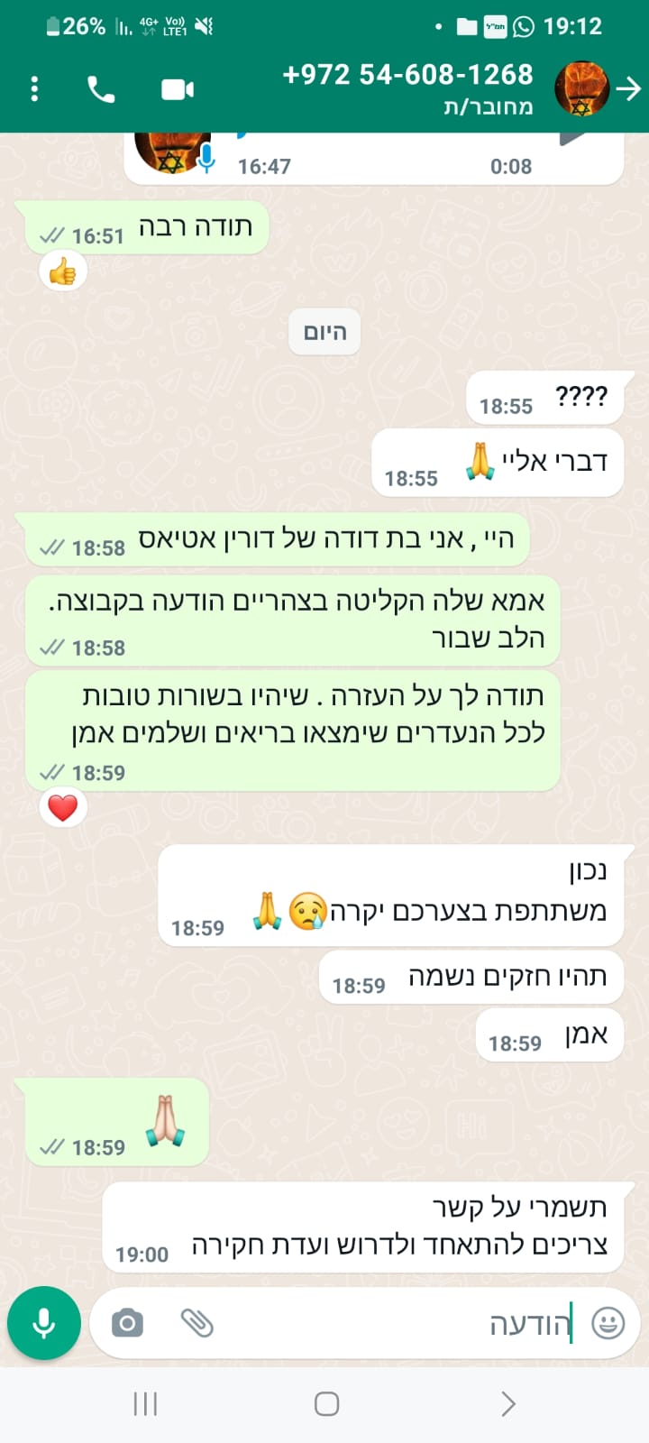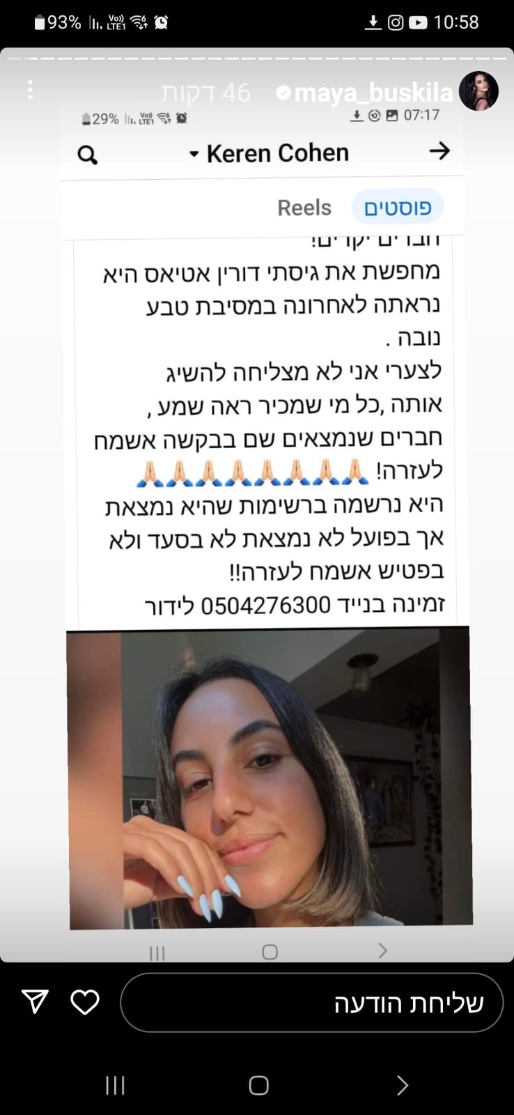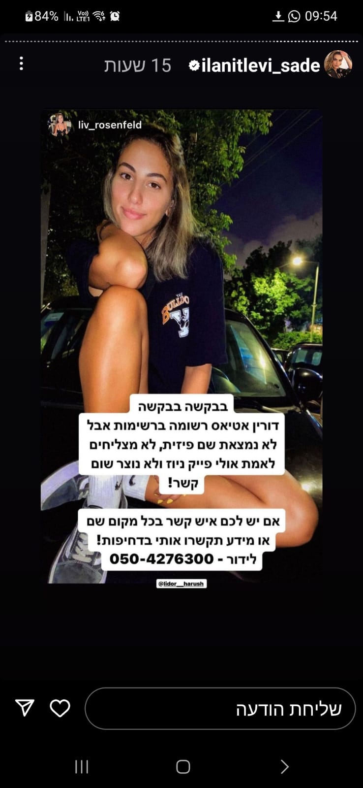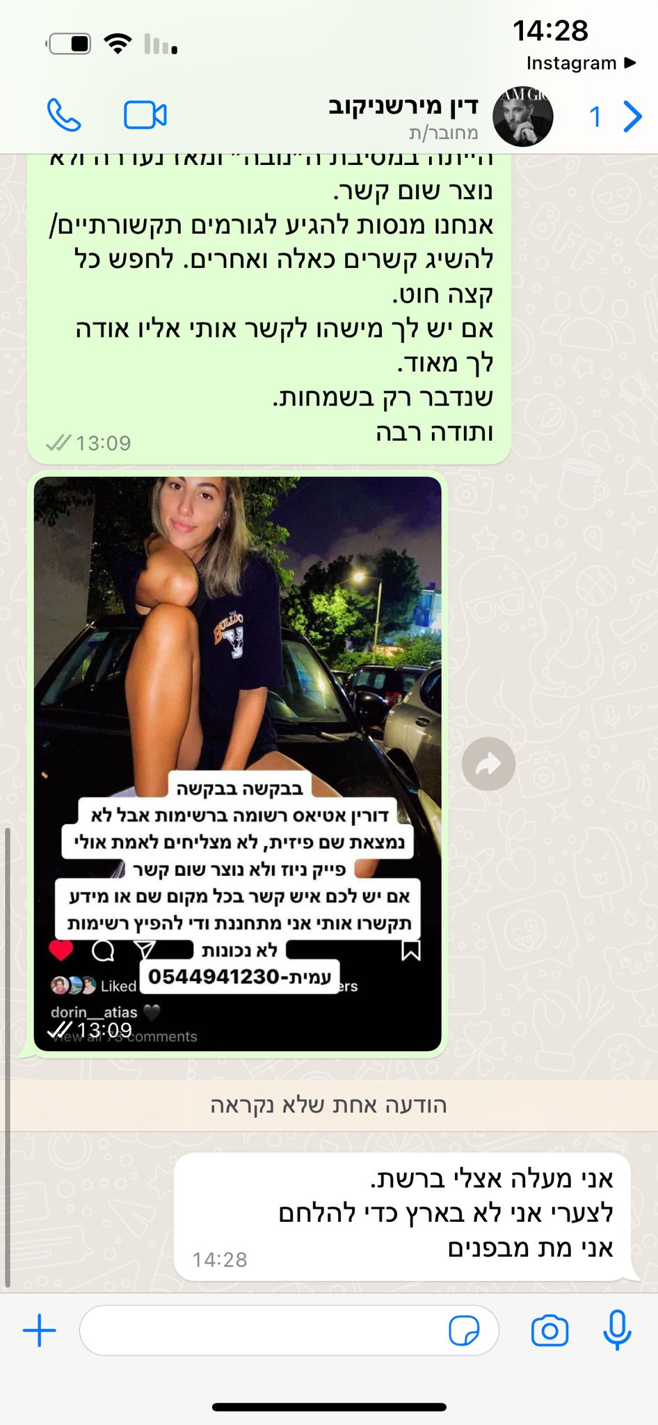 אחרי כמה דקות הודיעה שהיא ברכב בדרך הביתה וביקשתי שתעדכן. צילצלתי בלי סוף, ולא היה מענה.