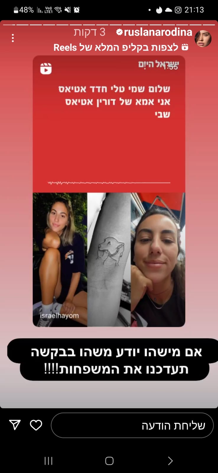 ראיתי את הכלבה ף התרגשתי וחיבקתי אותה יחד עם המשפחה שלי, רקדנו איתה והייתה תחושה כבדה של געגוע, איך דורין לא איתי.