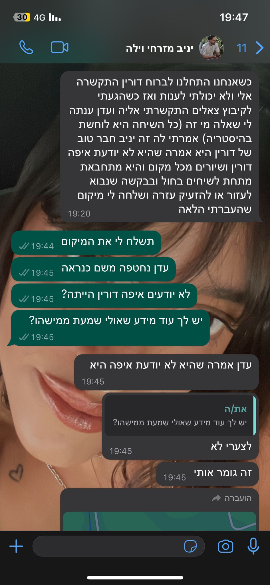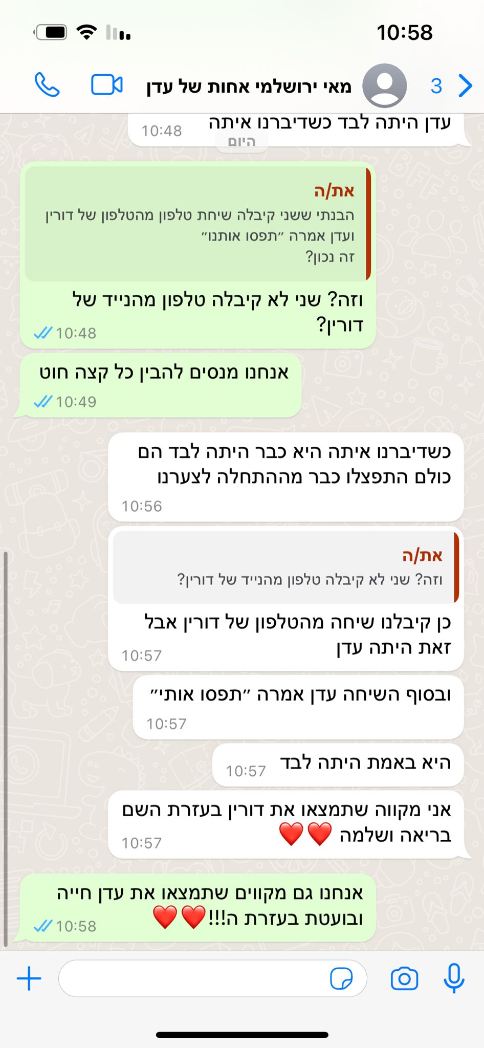 וזהו מרגע זה התקשרתי ללא הפסקה ולא היה מענה עד השעה 8:00 בערך, ואז הטלפון של דורין היה כל הזמן בממתינה , אנחנו מניחים כי אין לנו שום מידע שדורין נהגה וחברתה שישבה לידה נורו ברכב ואז חברה שישבה מאחוריה ברכב הצליחה להסתתר ולצאת מהרכב ולקחה איתה את הטלפון של דורין ודיברה עם משפחתה בערך כשלוש שעות בלי לענות לשיחות מהמשפחה והחברים של דורין עד לרגע חטיפתה.