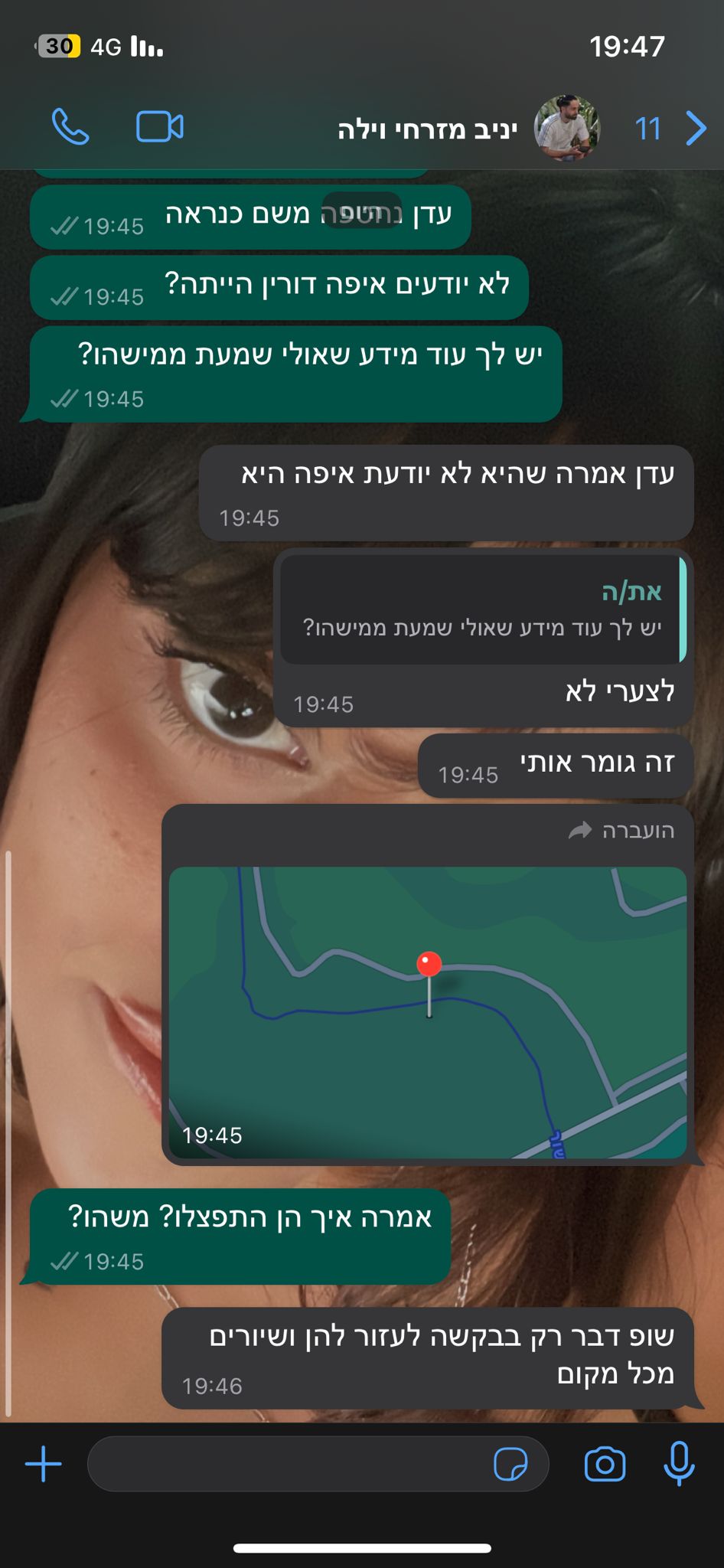 בשעה 6:40 היא התקשרה להגיד שסוגרים את המסיבה והמאבטחים מלויים את כולם לרכבים, היא שלחה מיקום בשעה 7:02, הקליטה הודעה קולית שבה היא אומרת שפינו את כולם, והן מחכות ליד האוטו והיירוטים לא מפסיקים והיא לא רוצה להתעכב בתוך הרכב כשיש יירוטים.