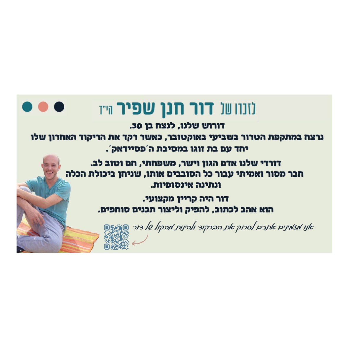 דור חנן שלנו, בן 30, נרצח עם אהובת ליבו סביון חן קיפר כשיצאו לרקוד את החיים במסיבת הפסיידאק. חבר אמת, ישר וצנוע, רודף צדק, קשוב, רגיש ותומך מתנה לאנושות שתישאר בלבנו לעד.