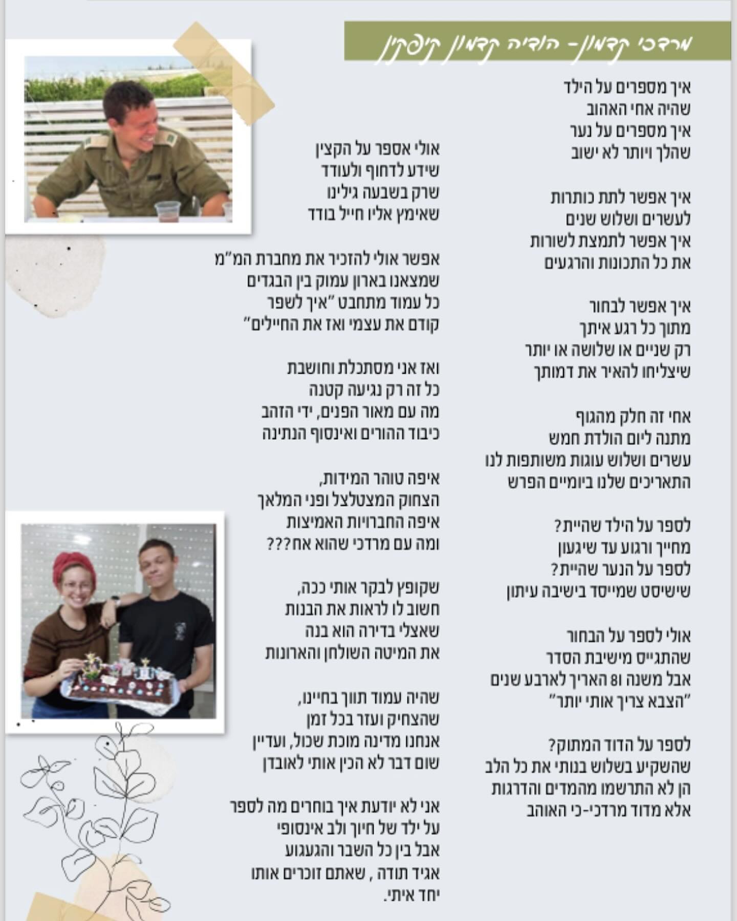 אמרתי לך את זה פעם, אבל לא נראה לי שהסברתי מספיק כמה אני מעריך ואוהב אותך, ב4 שנים האחרונות ניצלת כל דקה וכל שנייה מהחיים שלך, אם זה בצבא, אם זה בבית ואם זה זמן עם חברים כל הזמן חיפשת איפה לתרום ואיפה לתת, לא עצרת לנוח, את הכל עשית מתוך חיוך וענווה שמיוחדים רק לך, עם המתיקות הזו שלך שאי אפשר באמת להסביר בטח לא במילים.