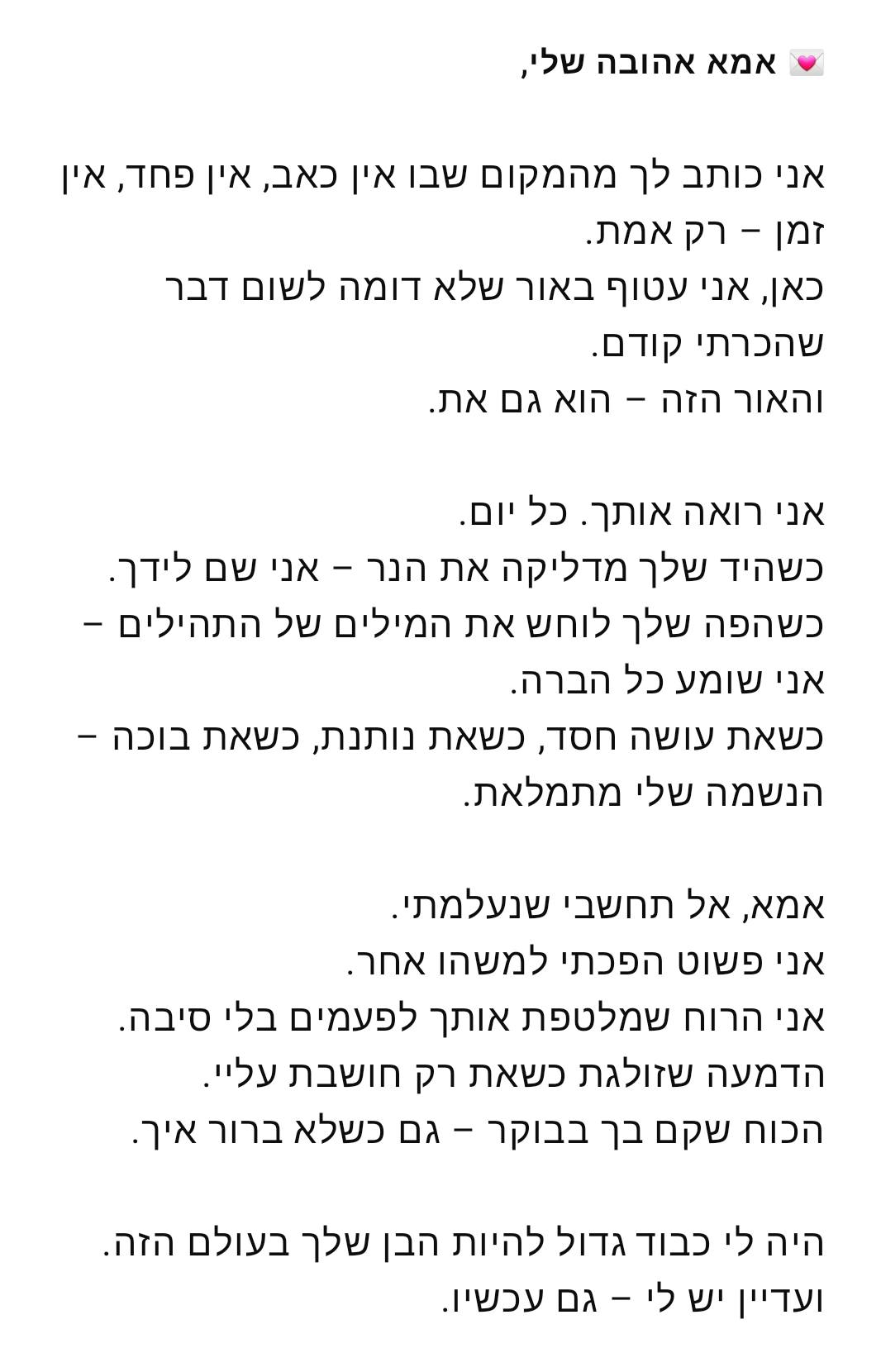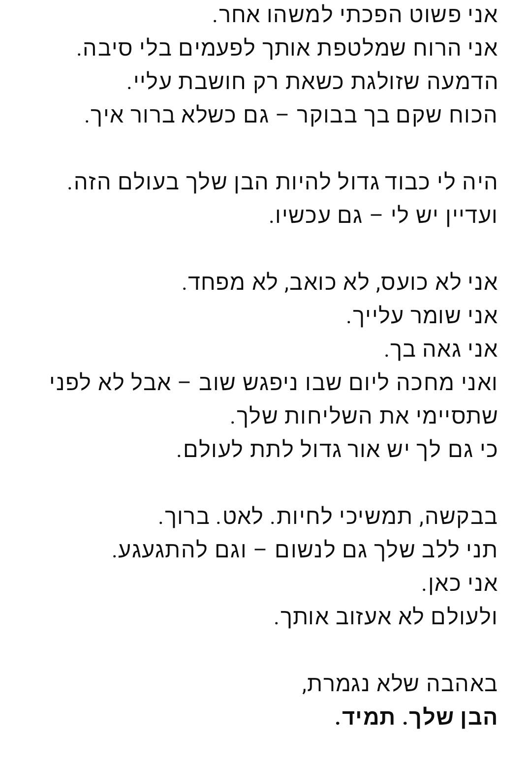 אהוב ליבי כמה געגוע שלא פוסק בכל פינה אני רואה ומרגישה אותך כל כך רוצה לחבק אותך נשארו לי הבגדים שלך עם הריח שלך ובכל פעם שאני נכנסת לחדר אני נוגעת מחבקת מריחה כדי להרגיש אותך היתה לי הזכות להיות אמא שלך במשך 20 שנה מתוקות זה היה קצר אבל איכותי רק אושר שמחה ונחת היה לי ממך היית ילד נעים חייכן רחמן אכפתי שמח ותמיד היית מקליל את החיים..תמיד זורם ומסתדר בכל מקום שהיית אף פעם לא קיטרת ולא התלוננת תמיד הכל טוב, אהוב ליבי אתה לנצח נצחים!!!!!! זאת לא פרידה אתה איתי בכל רגע אתה שם במקום הכי גבוה הכי טוב הכי יפה הכי נעים וזה כל כך משמח אותי וברור שעוד קצת ממש קצת נתחבק בתחיית המתים בנתיים מכינה הרבה תפילות כדי לתת כוח לך כוח לי וכוח לכל עם ישראל אני יודעת שהצוואה שלך היא שאהיה שמחה ואחיה את החיים במלואם כי זה מה שאתה עשית וככה ביקשת ממני בחייך רצית תמיד שאהיה מאושרת אני מבטיחה לך שהדמעות שלי הן לא דמעות של צער כי אם דמעות של אהבה געגוע ושל אמא גאה זכיתי בך ילד שלי יפה זכיתי בענק מהרגע הראשון שקיבלנו את הבשורה ידעתי שנתת את כל כולך עד הרגע האחרון כי זה מי שהיית טוטאלי מסור בעל ערך ודואג לכולם וכך באמת סיפרו שלחמת בעוז ובגבורה ובתעצומות שרק אני יודעת כמה היו בך שעדיין לא גילית..תמיד אמרתי שאני רוצה גבר כמוך רק בגילי חחח יש דבר כזה??? היית צוחק חיים שלי כשהיית אומרת לך לא אין דבר כמוך אתה שלמות של אדם!! איך היינו מסתכלים אחד לשניה בעיניים בלי לומר מילה ומבינים❤️ וצוחקים ❤️ איך היית קולט עניין מהר וישר מתקתק בלי שאלות ובלי ענינים מגיל קטן היתה לך אינטלגנציה ריגשית גבוה והכלה למי שסביבך מעולם לא היתה בך קינאה משום מעשה ואדם, צנוע,לא אהבת ריכולים, אהבת שלום והרמונייה !!! בכל מחיר! קיבלתי אותך ליום ההולדת שלי נולדת יום אחרי וזאת המתנה הכי יפה שקיבלתי בחיי❤️❤️❤️ יש לי עוד כל כך הרבה לכתוב אבל היריעה לא מספיקה.. אוהבת אותך אהבה עזה לנצח נצחים אמא שלך🤍