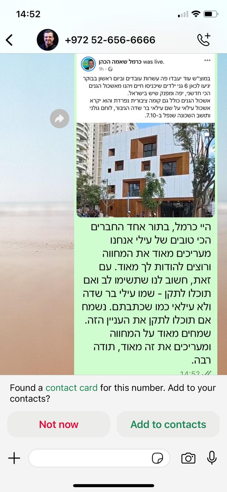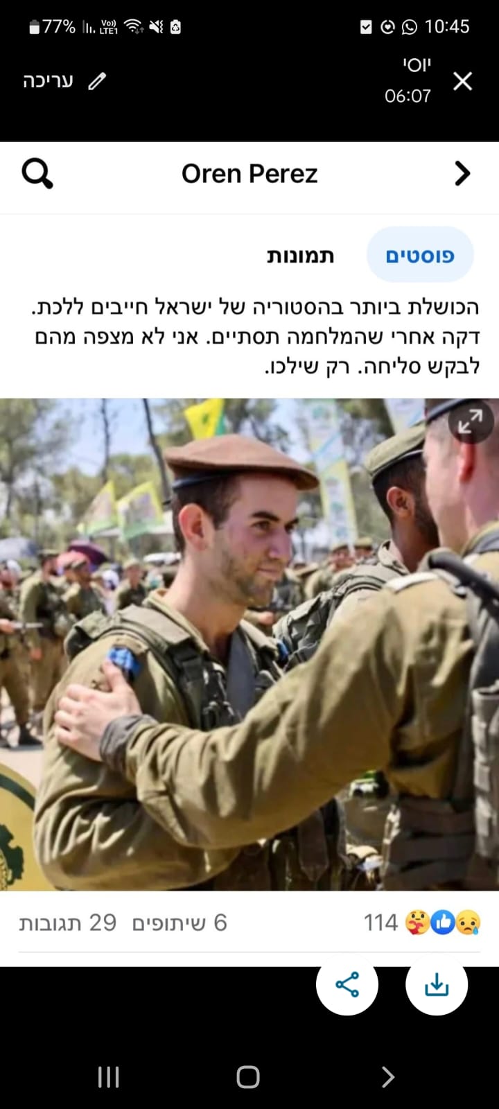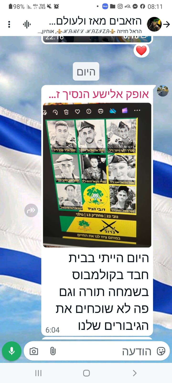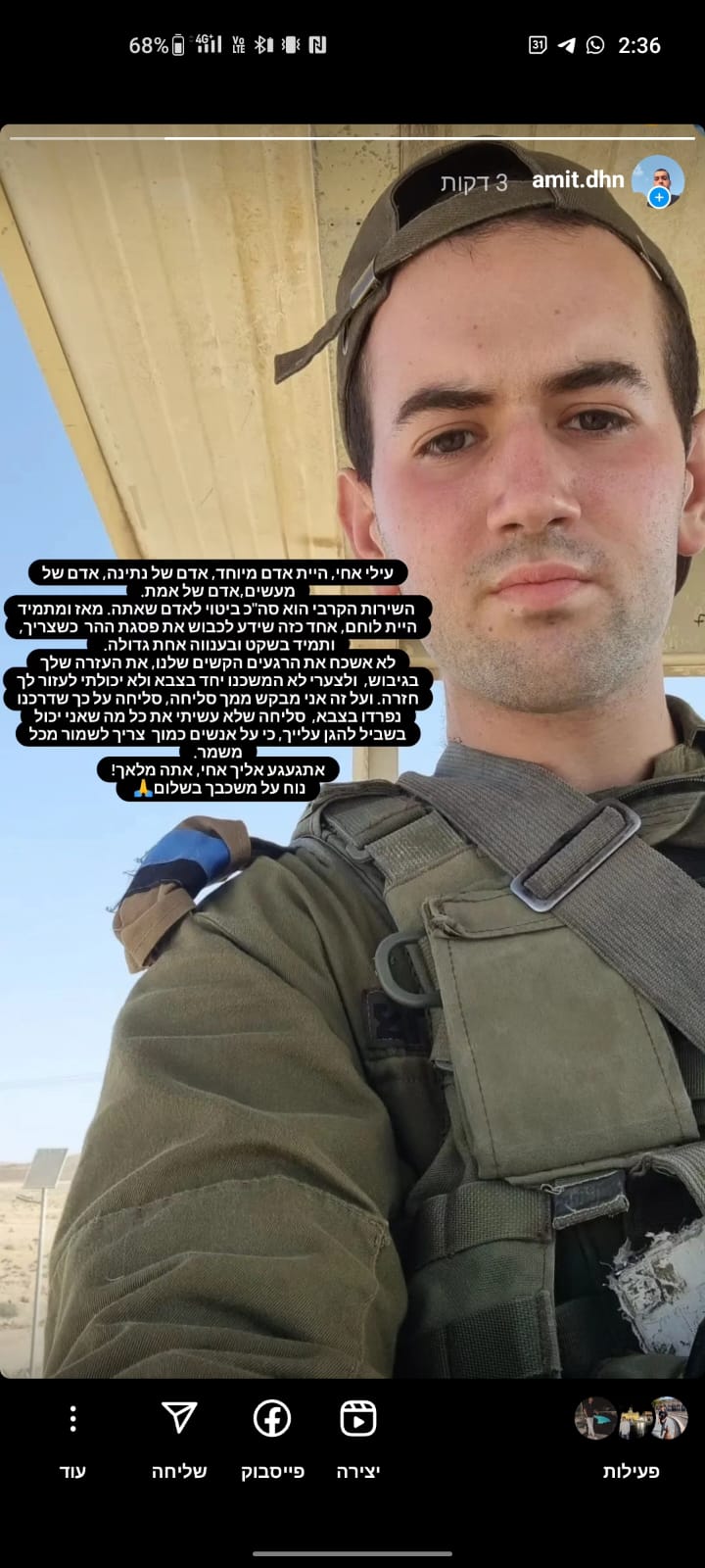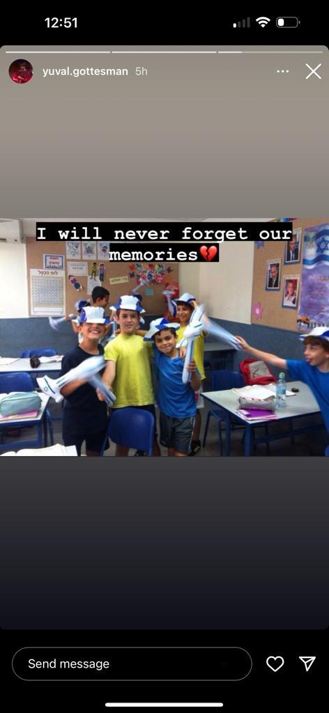 הוא שלח לי הודעה אחרי כמה שבועות שהוא עשה קעקוע וסיפר לי כמה טוב לו בגולני ושיש איתו אנשים טובים. כשהתחילה המלחמה חשבתי עליו שלחתי לו הודעה כדי שיעדכן לשלומו