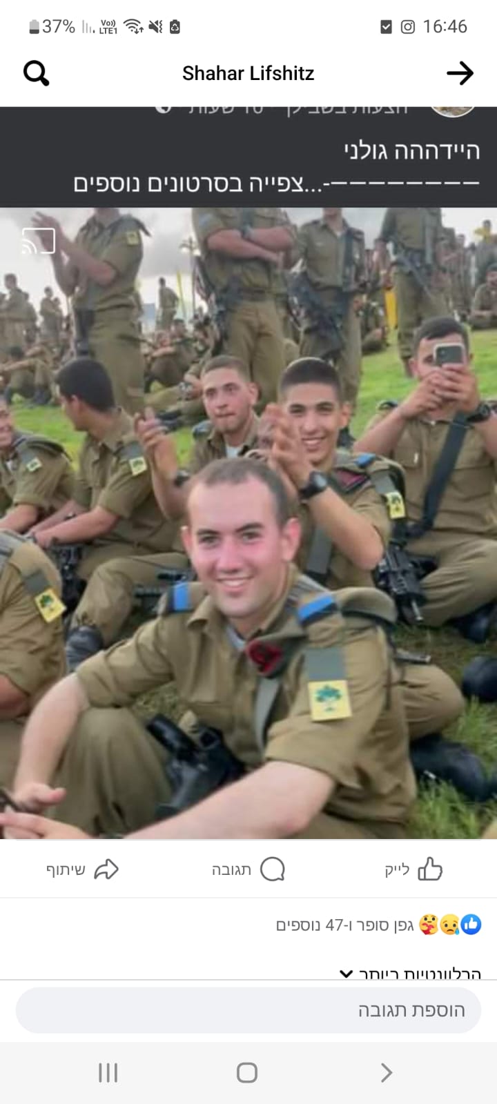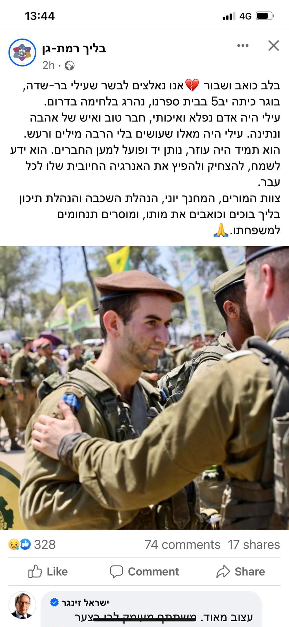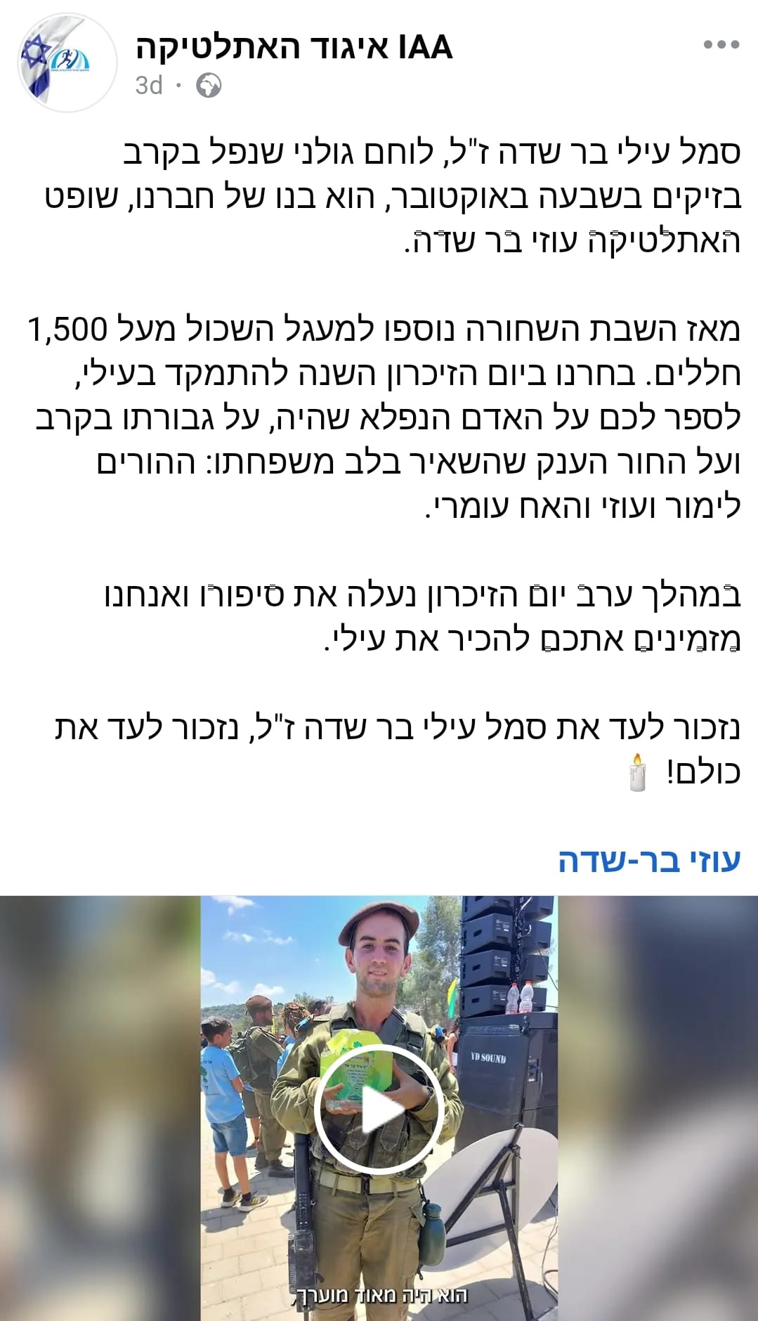 אני זוכר שבבית ספר בכל פעם שהיינו חולפים זה על פני זה תמיד היינו מחייכים וצוחקים גם אם לא הייתה סיבה, כי זה עילי, מקור של צחוק ואושר. בשבת בבוקר התעוררתי מרעש האזעקות בזמן שאני מחכה לשמוע דיווח מהחדשות על המצב ראיתי שהעלת לאנסטגרם תמונה שאתה בשמירה בעוטף ומאז לא הפסקתי לחשוב עלייך, על זה שאתה בחזית שומר עלינו. לאחר שהתקבלו דיווחים על חדירות מחבלים לעבר יישובי העוטף החרדה בי עלתה בנוגע למצבך. פחדתי לשאול אותך אם הכל בסדר ואם אתה מוגן. מהחרדה אני התהלכתי בבית שעות עד שאזרתי אומץ ושאלתי אותך על מצבך, מאז לא ענית לי.. משתתף בצער משפחת בר-שדה