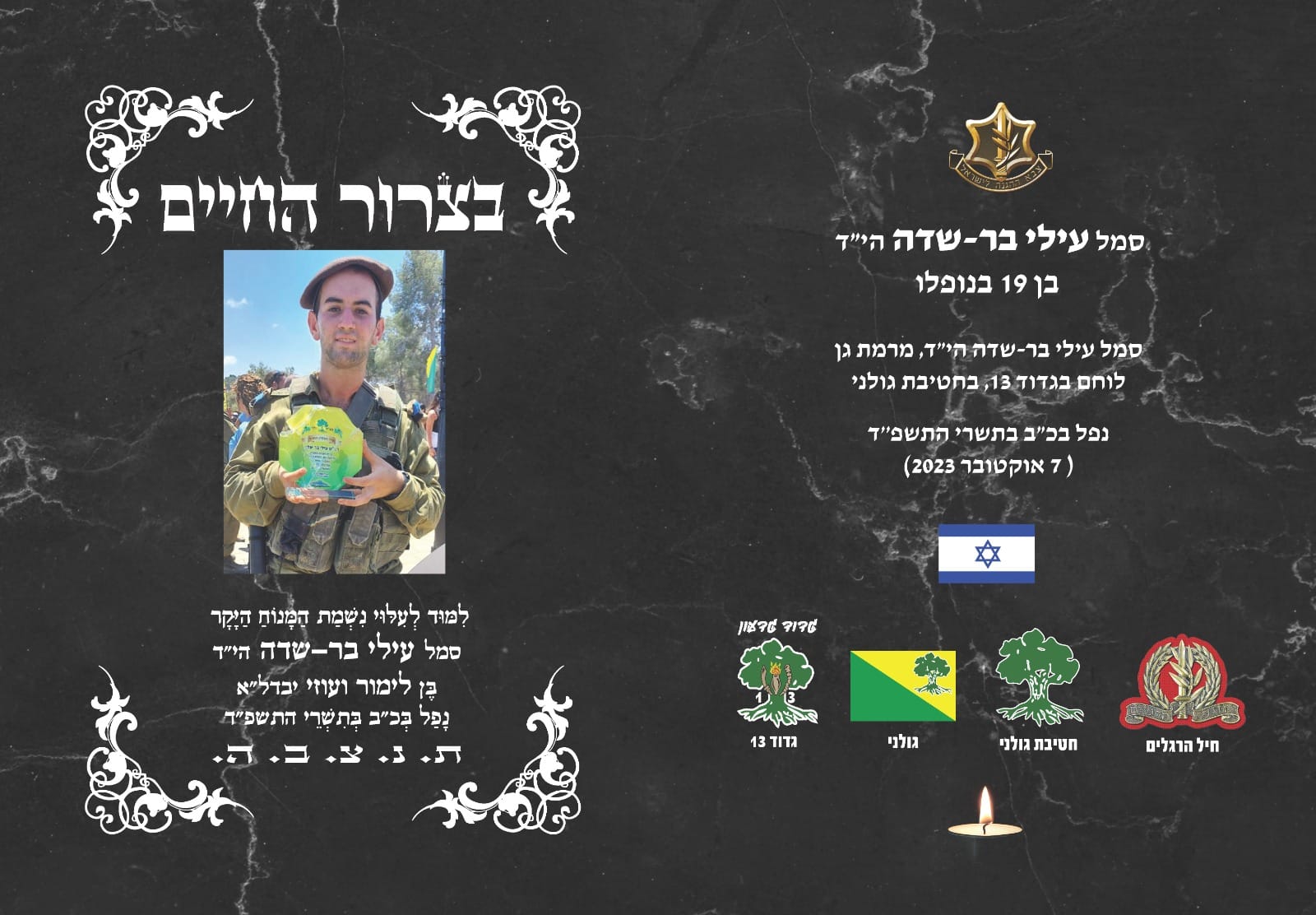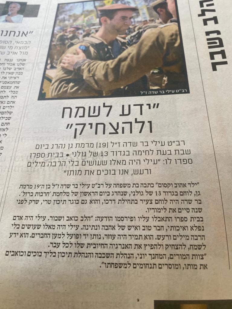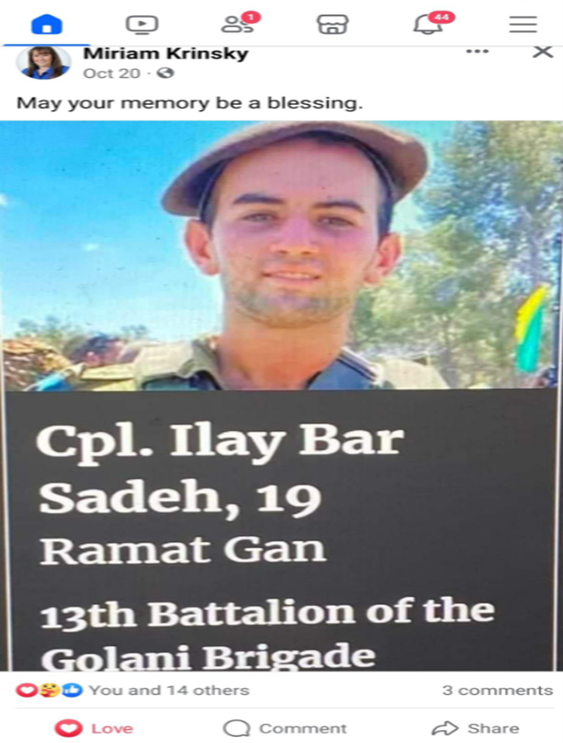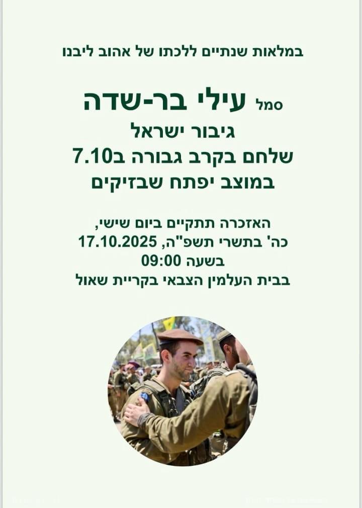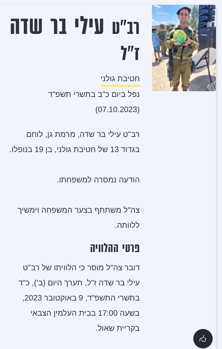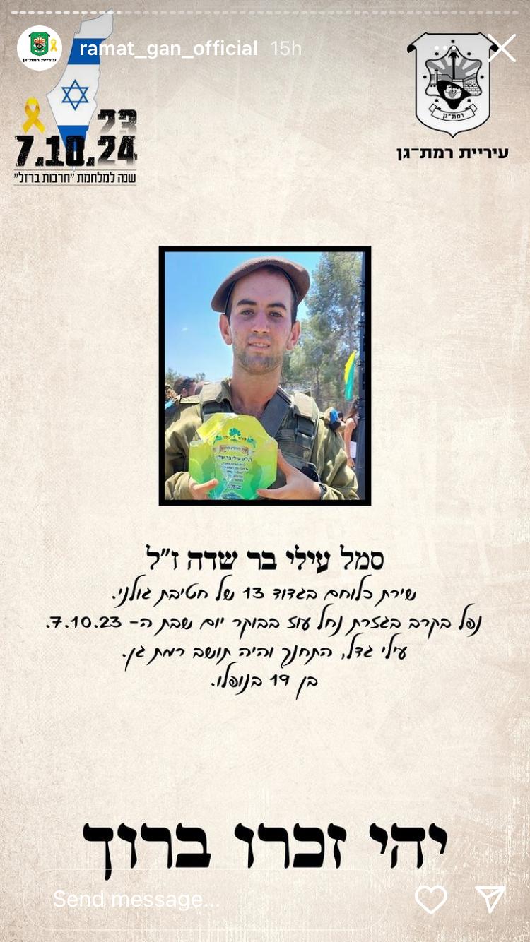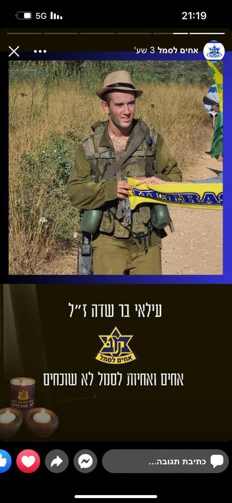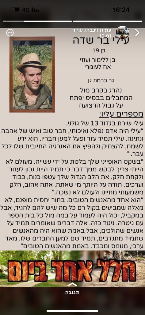 עילי בר שדה בן דודתי לוחם מצטיין בגדוד 13 בחטיבת גולני, נפל בקרב במוצב זיקים-יפתח בשבת הנוראית 07.10.2023, בן 19 בלבד.