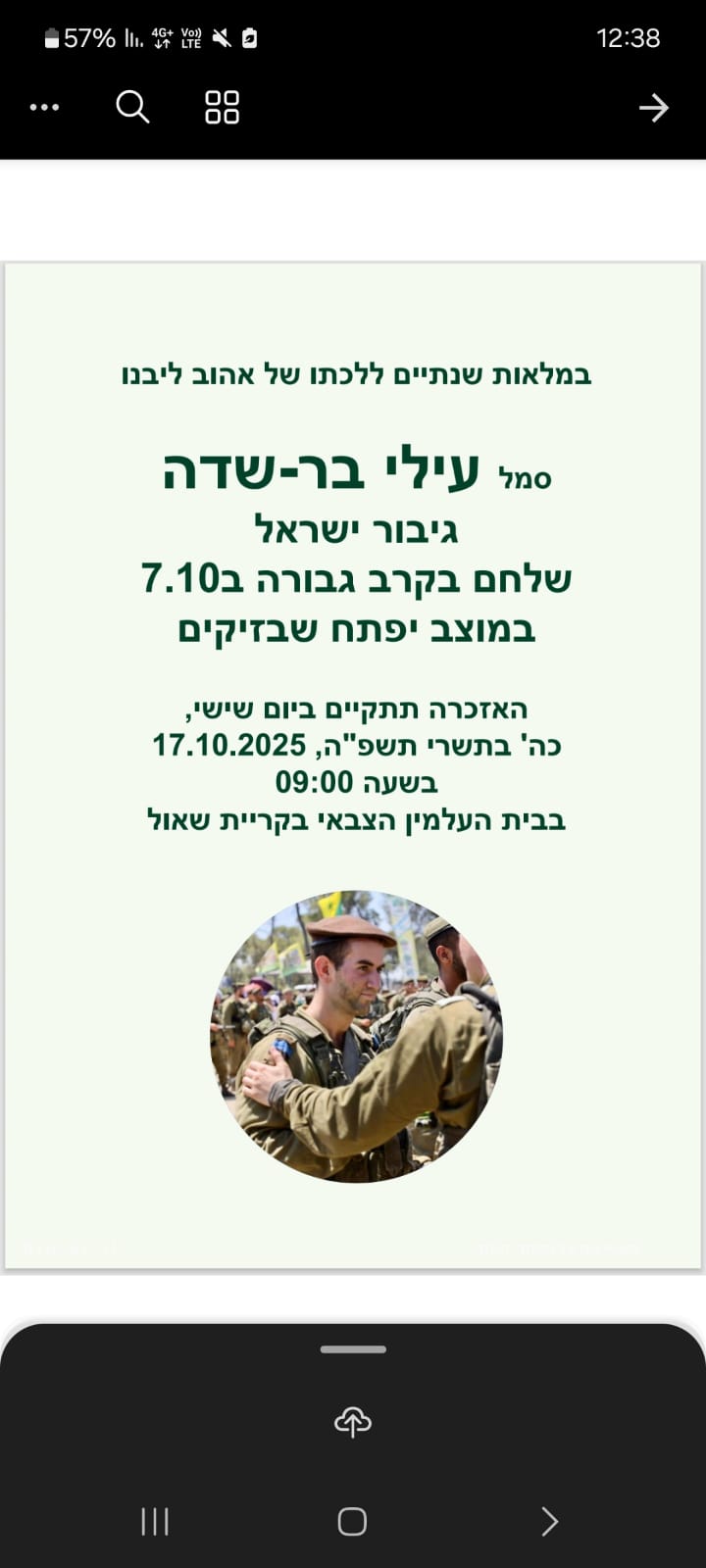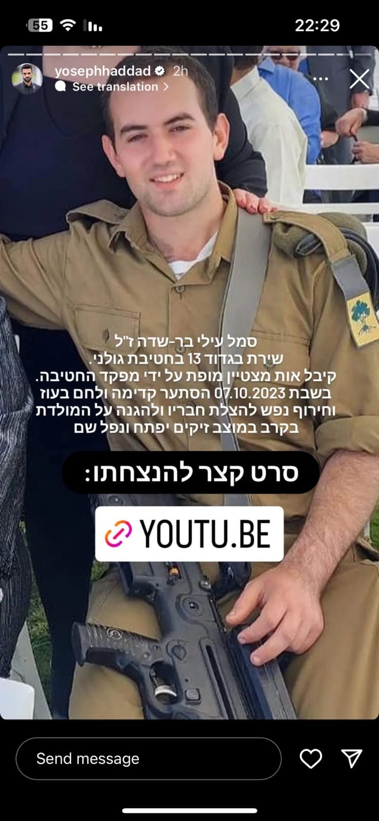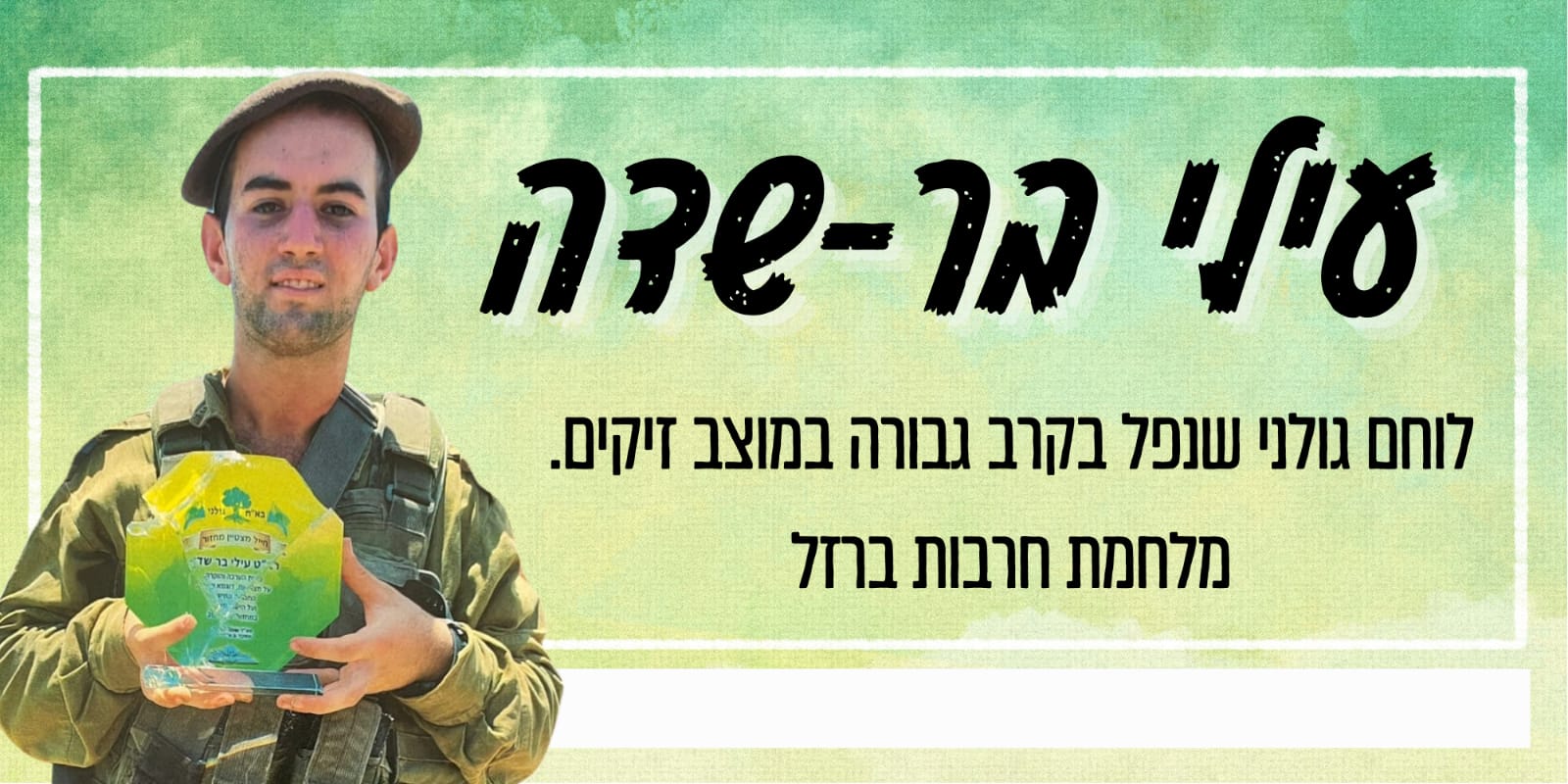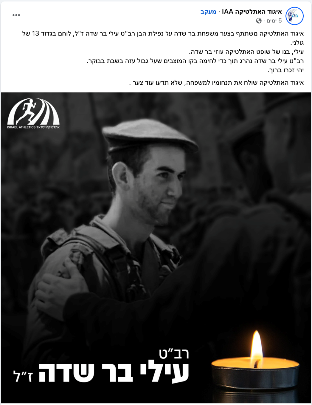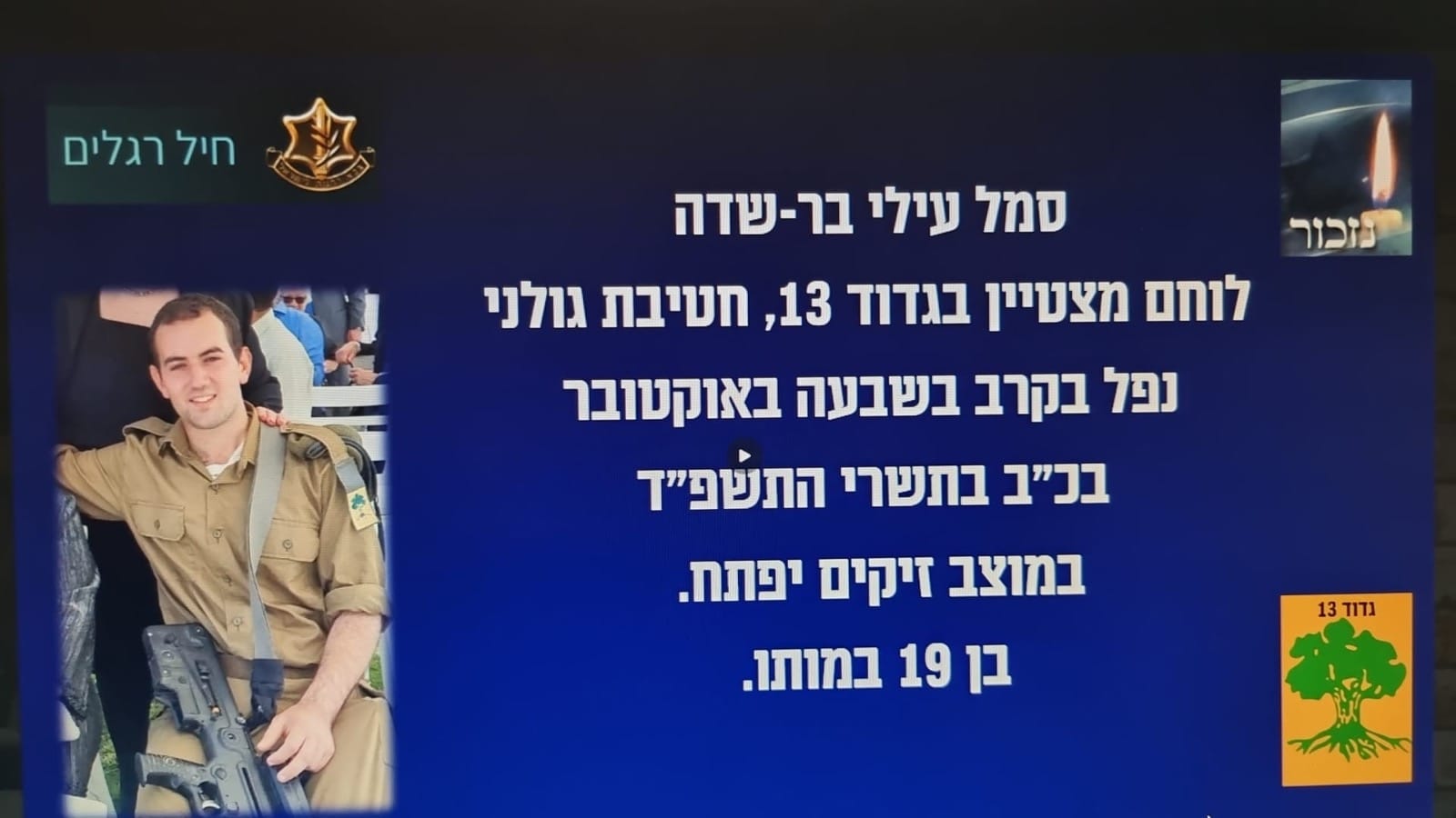 עילי בר שדה בן דודתי לוחם מצטיין בגדוד 13 בחטיבת גולני, נפל בקרב במוצב זיקים-יפתח בשבת הנוראית 07.10.2023, בן 19 בלבד.
