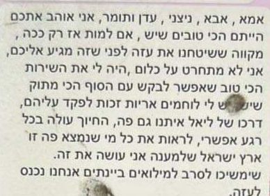 עילי, היום ביקרתי לראשונה בבית הוריך הנפלאים, לימור ועוזי. הכרתי גם את עומרי אחיך הגדול, והרגשתי מתוך קירות הבית את כל הערכים שלמדת שם ובעיקר את כל הטוב שבך: איך לראות טוב, לחשוב טוב, להיות טוב, טוב כל כך, הכי טוב בעולם!