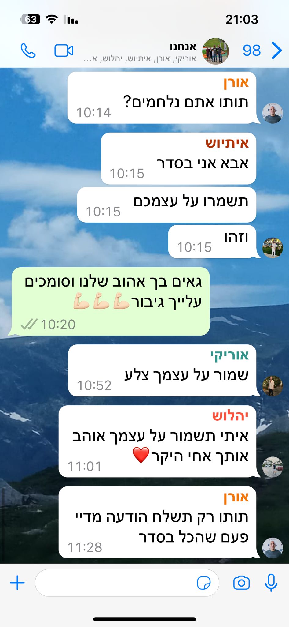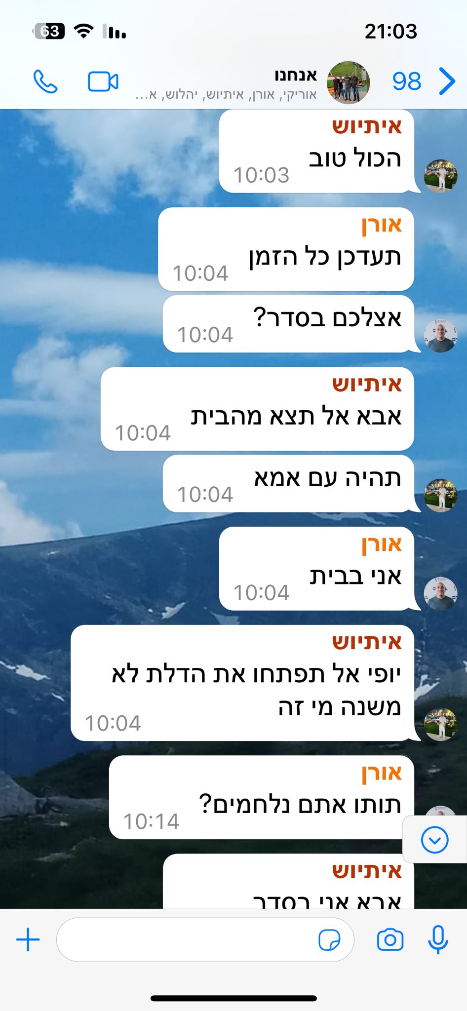 בהודעות בקבוצה המשפחתית איתי כותב ב10:04 בבוקר: "אל תצאו מהבית", "אל תפתחו את הדלת ולא משנה מי זה" וכשאבא שלו שואל אותו אם הם נלחמים הוא עונה "אבא, אני בסדר, תשמרו על עצמכם. וזהו".