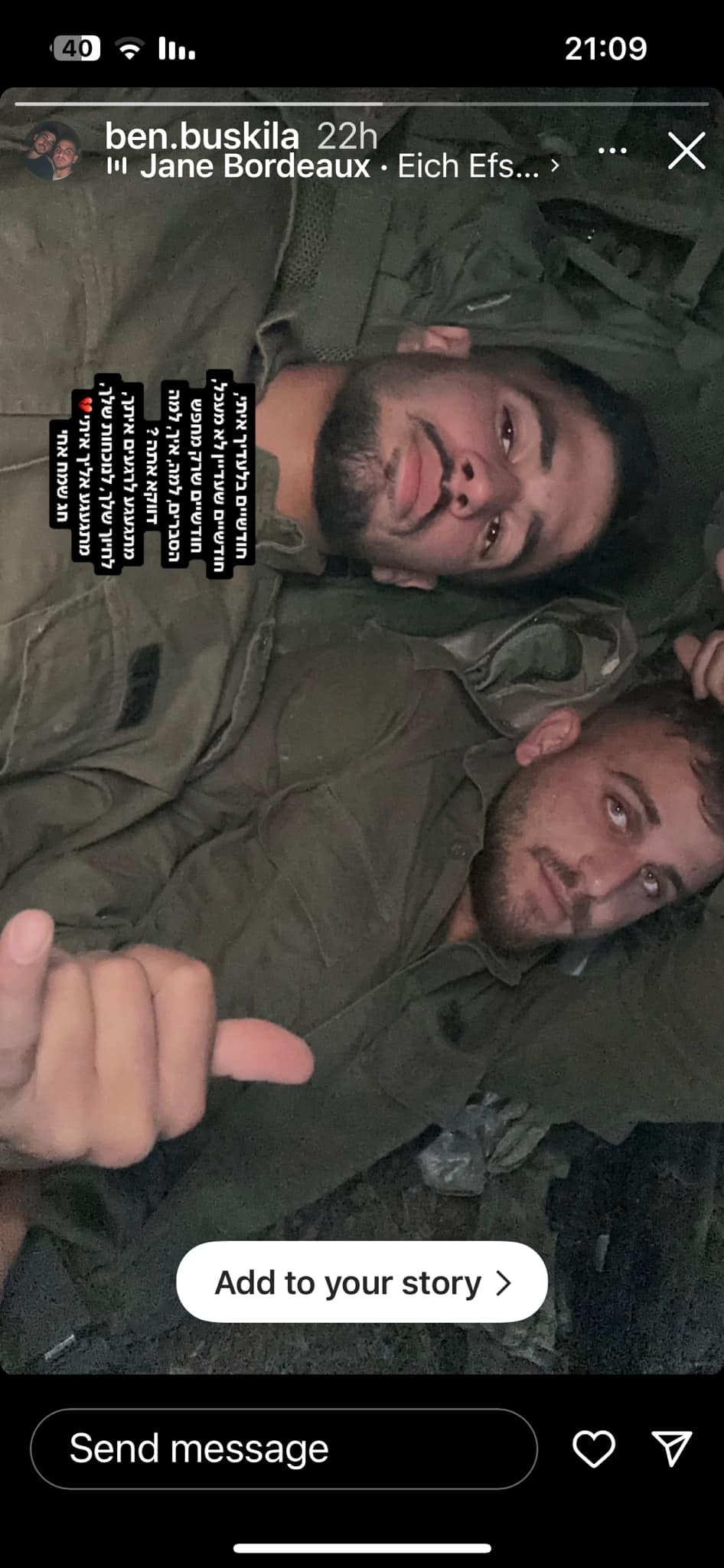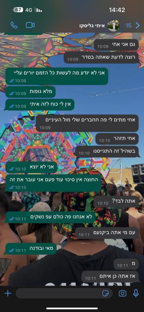 ותוך כדי מספרת ליאת, הוא גם דואג לחברים אחרים שלו, ששרדו את הטבח ב"נובה" ובודק מה שלומם. "אחי מתים לי פה חברים שלי מול העינים", זו אחת השורות בהתכתבות.