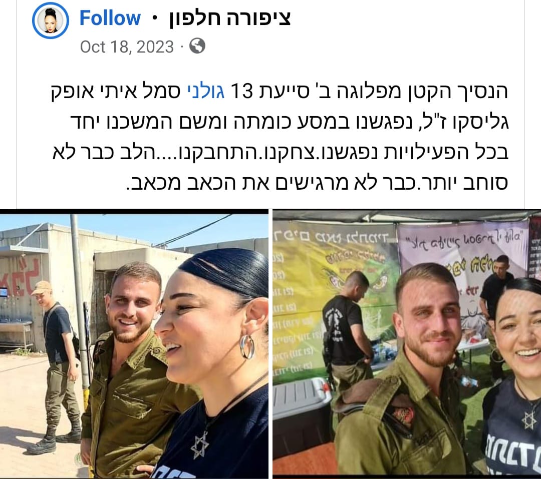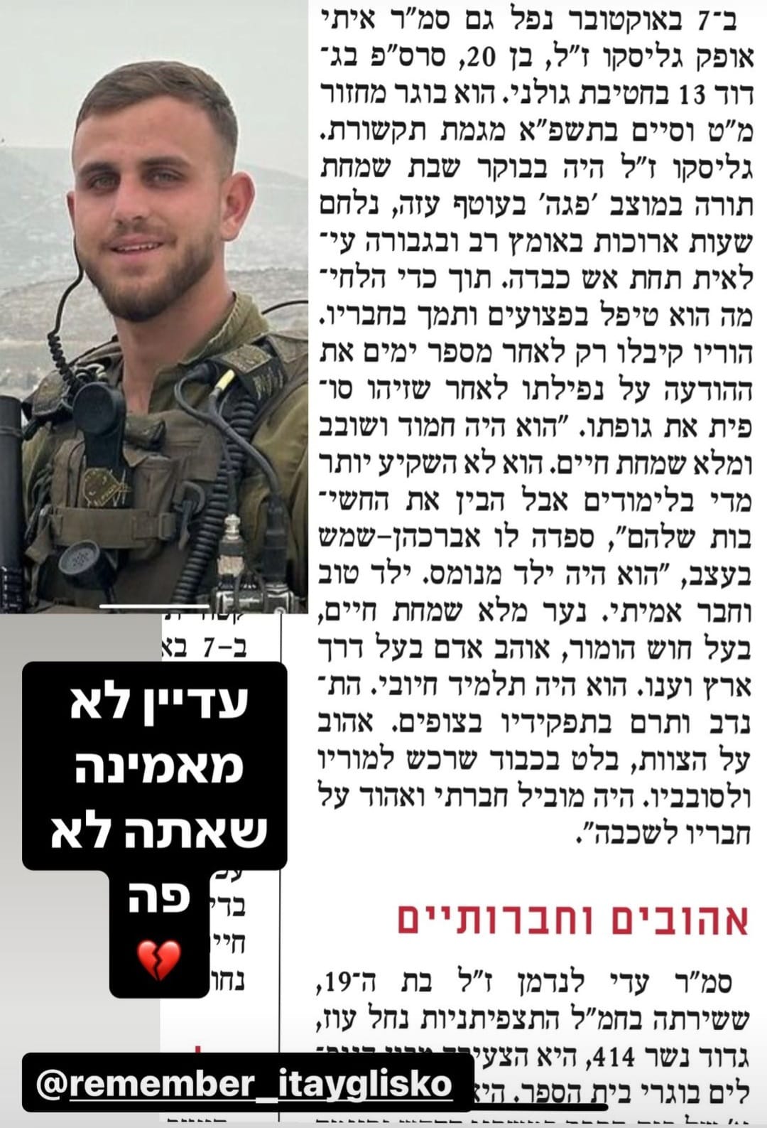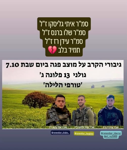 כל כך התגאת כשהתגייסת לגולני ועוד לגדוד 13, היית חוזר מאובק עם הריח הזה של לוחם...לוחם אמיתי שרק מחכה לרגע הזה. אז הרגע הזה הגיע בסוף ואתה נתת את כל כולך, הגנת עלינו ועל החברים שלך, הבנת בדיוק מה קורה במדינה ביום הארור ההוא...הרגת כמה חלאות אבל נשארת לבד שם מול עשרות מחבלים וכנראה שלא היה סיכוי...כזה היית, דואג לכולם ורק אחר כך לעצמך. לעולם לא אשכח אותך❤️בכל הזדמנות אנציח אותך ואספר עליך❤️אתה כל כך חסר לי❤️הלוואי והיית פה לחיבוק אחד אחרון כשאני על קצות האצבעות מנסה להגיע לצוואר שלך לתת לך נשיקה❤️