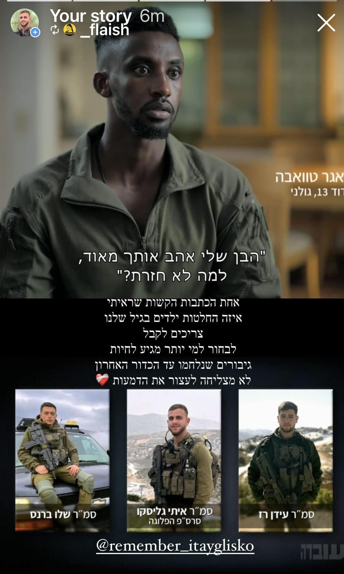 "באיזשהו שלב איתי קרא לחילוץ למפקד שלו והוא לא נענה וזה הורס לי את הלב ברמות מטורפות של חמלה ושל מחשבות עליו שם. על מה הוא חשב ומה הוא הרגיש והתמונות שהוא ראה ועל החברים שלו מול העיניים של בזמן שהוא מנסה להציל אותם. כולנו כאן גם בזכות לוחמים כמו איתי שלי והחברים שנפלו איתו: עידן רז, שלו ברנס ויקיר לוי. כולם היו גיבורים שם"