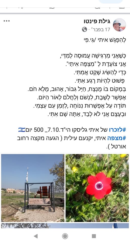 רק ארבעה ימים אחרי השבעה באוקטובר קיבלה משפחת גליסקו את ההודעה המרה על נפילתו של איתי. "אנחנו עוד הלכנו וחיפשנו אותו בשדות, חשבנו שאולי הוא פצוע, אולי בהלם קרב? כי לא האמנו וכי הוא גיבור וחזק. והלב שלי יוצא אליו כל הזמן. וצריך לזכור את הערבות ההדדית שמסמלת את הלחימה שלו ושל והחברים האחרים במוצב הזה. ואנחנו לא יודעים עד כמה הם ידעו מה קורה בחוץ, סביר להניח שלא ידעו, כי אף אחד לא ענה באותו בוקר. אבל חשוב לי שידעו שמוצב פגה לא נכבש ולא נחטפו ממנו חיילים וזה גם בזכות איתי והחברים שלו".
