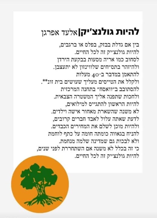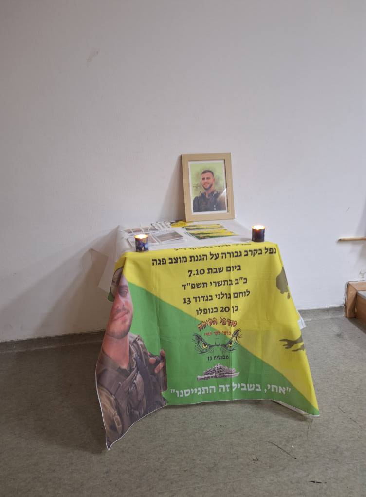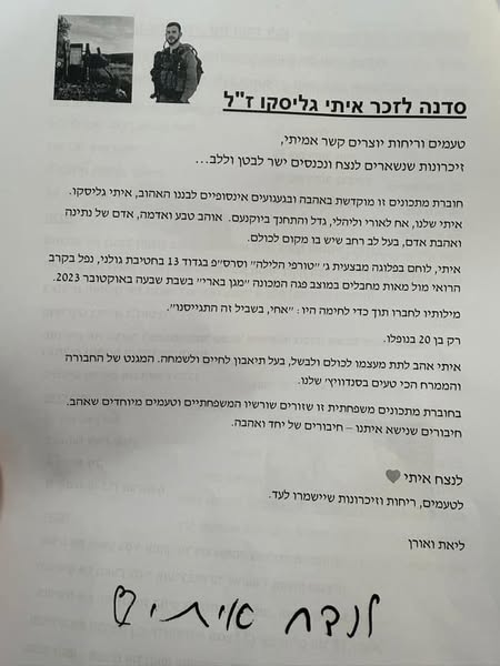 אנחנו שולחים מכאן כוחות לחברייך הגיבורים מפלוגה ג מבצעית של גולני 13 ״טורפי הלילה״ ולכל חיילי צה״ל . החלמה מהירה לפצועים. מבקשים מפלוגה ג ומהחברים מהבית להמשיך את דרכך המיוחדת ולרגע לא לשכוח אותך: את האהבה לכולם, החברות, הצחוקים והשובבות, אומץ הלב, הנתינה והערבות ההדדית.