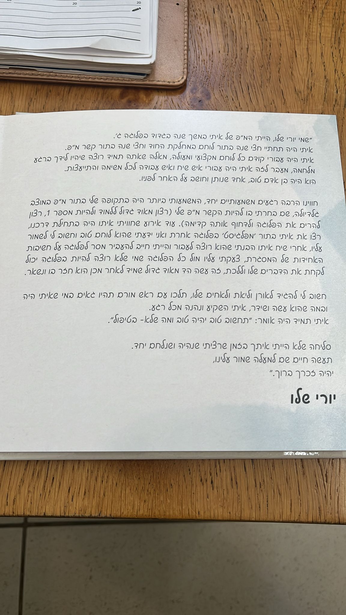 אני מתרגשת כל פעם מחדש נוכח סיפור הלחימה במוצב כשאני שומעת על אומץ הלב שלך שם, כשנותרתם בסוף ללא מפקד, אחרי שעות רבות של לחימה, כשכוחות הרשע הציתו את חדר האוכל בו טיפלתם בפצועים ומשם נלחמתם, תפשת פיקוד, ובקור רוח ונחישות השמורים רק לגיבורים כמוך הובלת יחד עם עוד 2 לוחמים את האש אלייך. כך הצלת בחייך את חבריך שנותרו במוצב. המחשבה עלייך שם בלחימה קורעת אותי מבפנים. הלוואי ולא היית כזה אמיץ וגיבור..