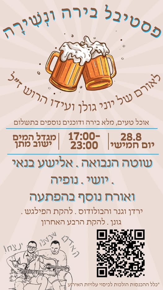 קוראים לי יהלי, אני והמחזור שלי מהמכינה הקדם צבאית, “מנשרים קלו” מארגנים בפעם השנייה ערב “בירה ונשירה” ב-28.8, לזכר שני חברים אהובים שלנו – עידו הרוש ויוני גולן ז״ל, שנפלו ב-7.10.