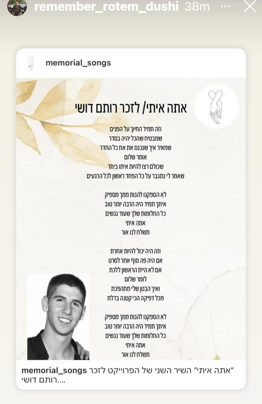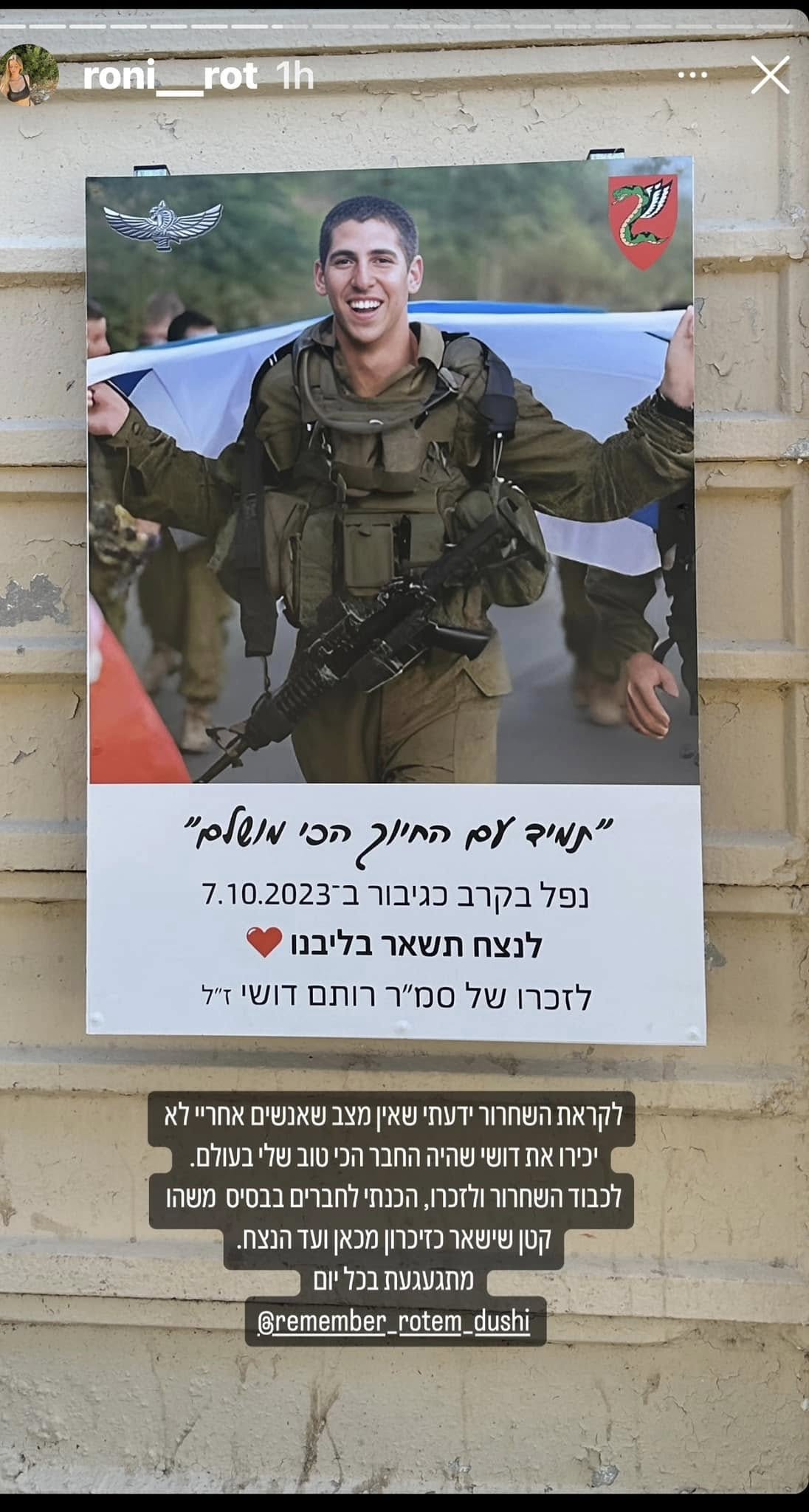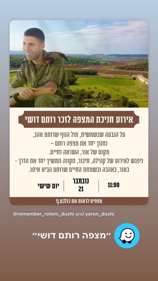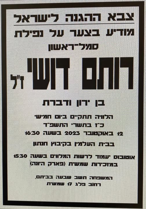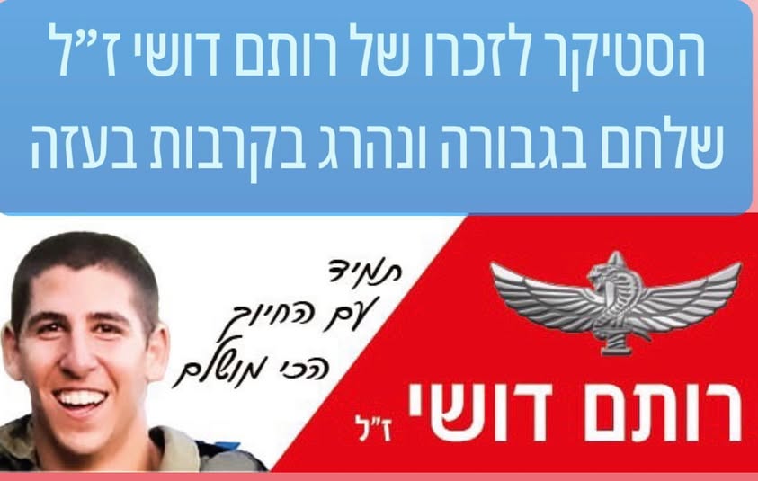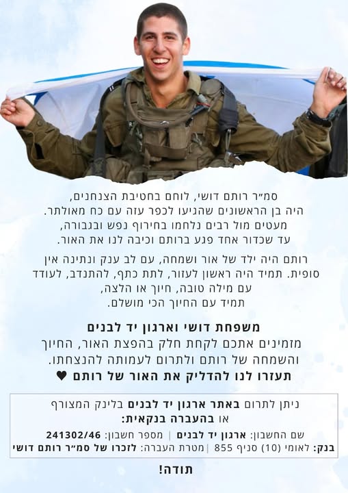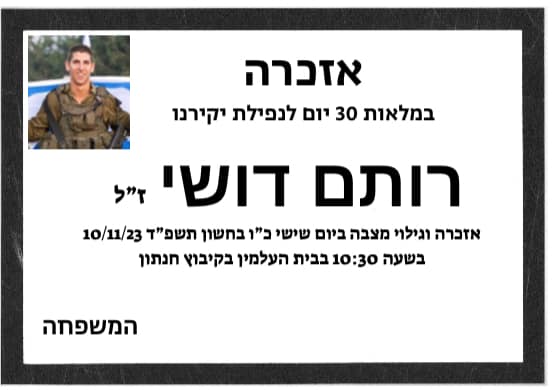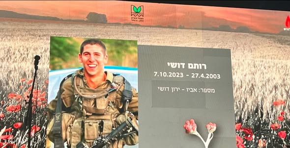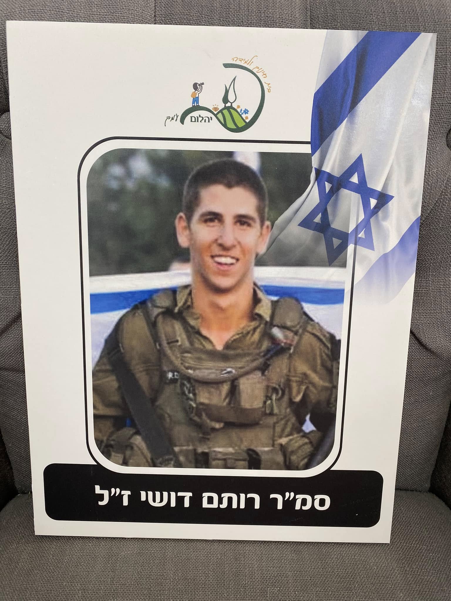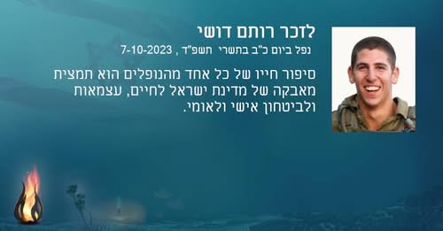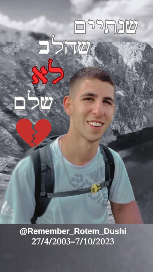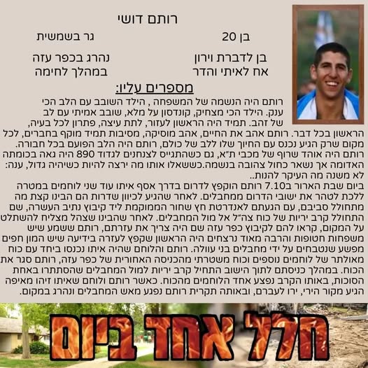 סמ״ר רותם דושי לוחם בחטיבת הצנחנים, נפל בשבת הארורה ב 7 לאוקטובר כשנלחם להגן על תושבי כפר עזה. רותם היה הנשמה של המשפחה , הילד השובב עם הלב הכי ענק. הילד הכי מצחיק, קונדסון על מלא, שובב אמיתי עם לב של זהב. רותם אהב את החיים, אהב את מכבי תל אביב, אהב מוסיקה, מסיבות תמיד היה מוקף בחברים, לכל מקום שרק הגיע נכנס עם החיוך שלו ללב של כולם, רותם היה הלב הפועם בכל חבורה, הלב של כולנו ! כששאלו אותו מה ירצה להיות כשיהיה גדול, ענה: לא משנה מה העיקר להנות. עכשיו הלב נדם, נותרנו המומים ושבורי לב, נפער לנו בור ענק בנשמה! אנחנו מתגעגעים ומתחייבים, נדאג שכל העולם יכיר את החיוך שלך, יכיר את הלב שלך. כולם יכירו את רותם שלנו! תודה גיבור שלנו ! זכרך לא ימוש מליבנו לעולם ועד!