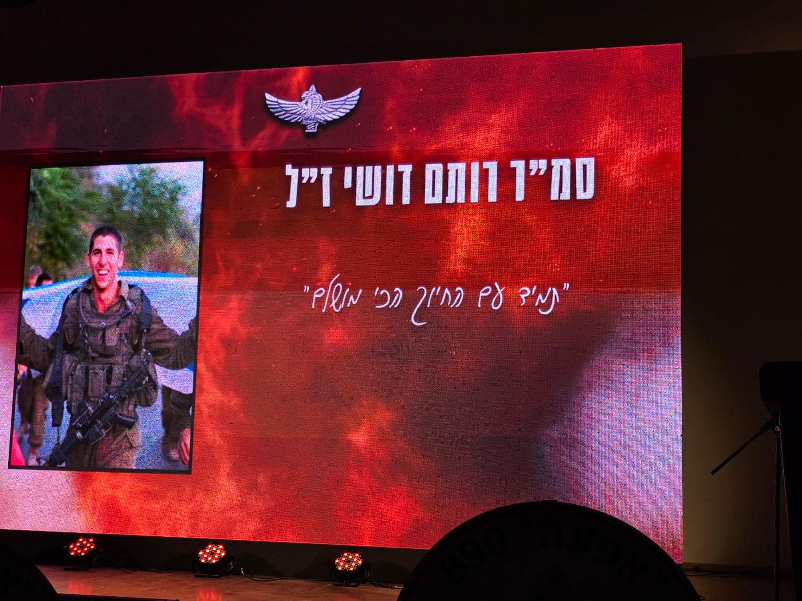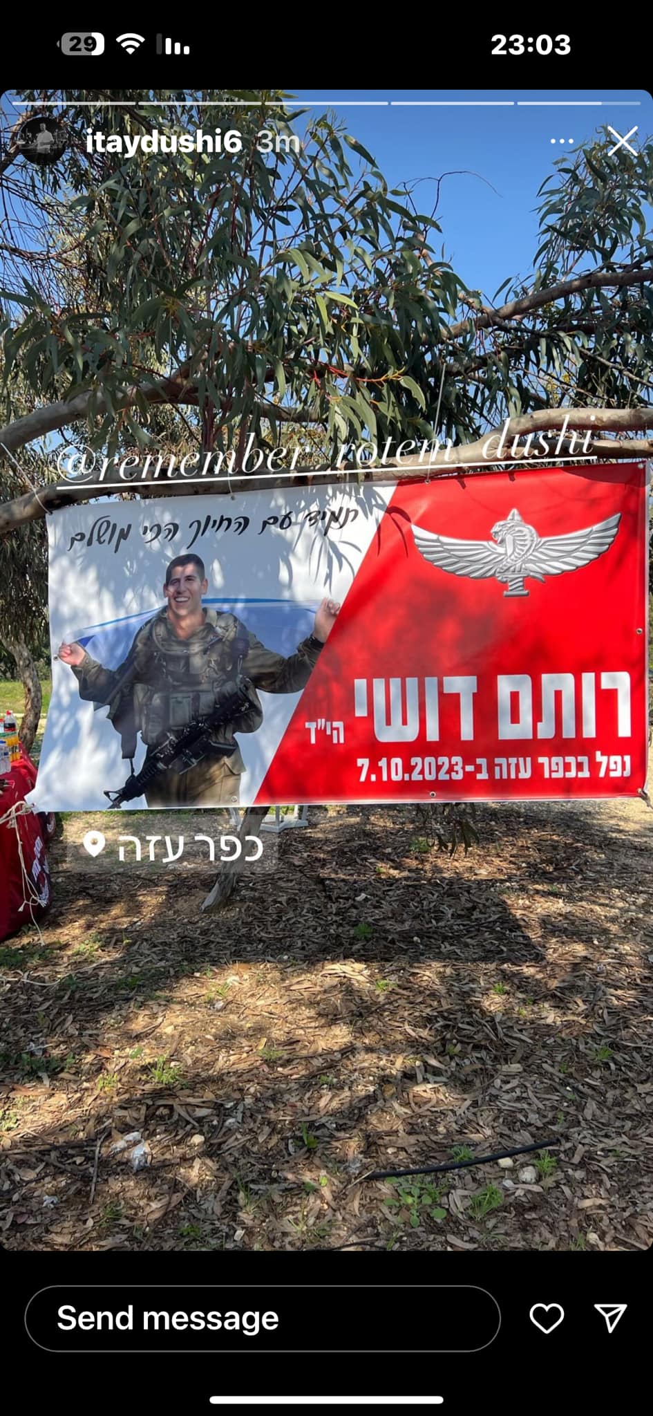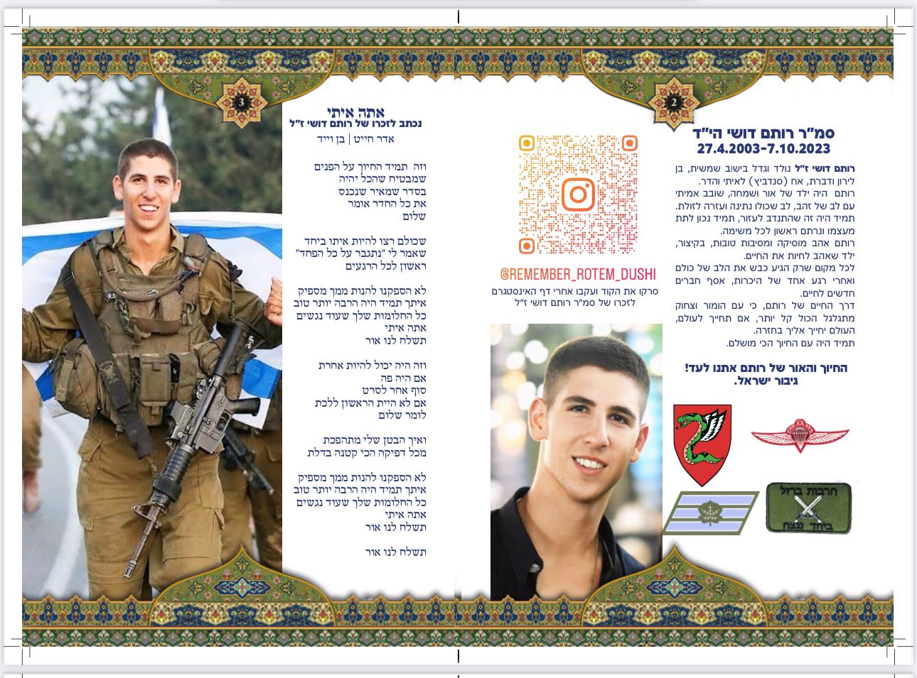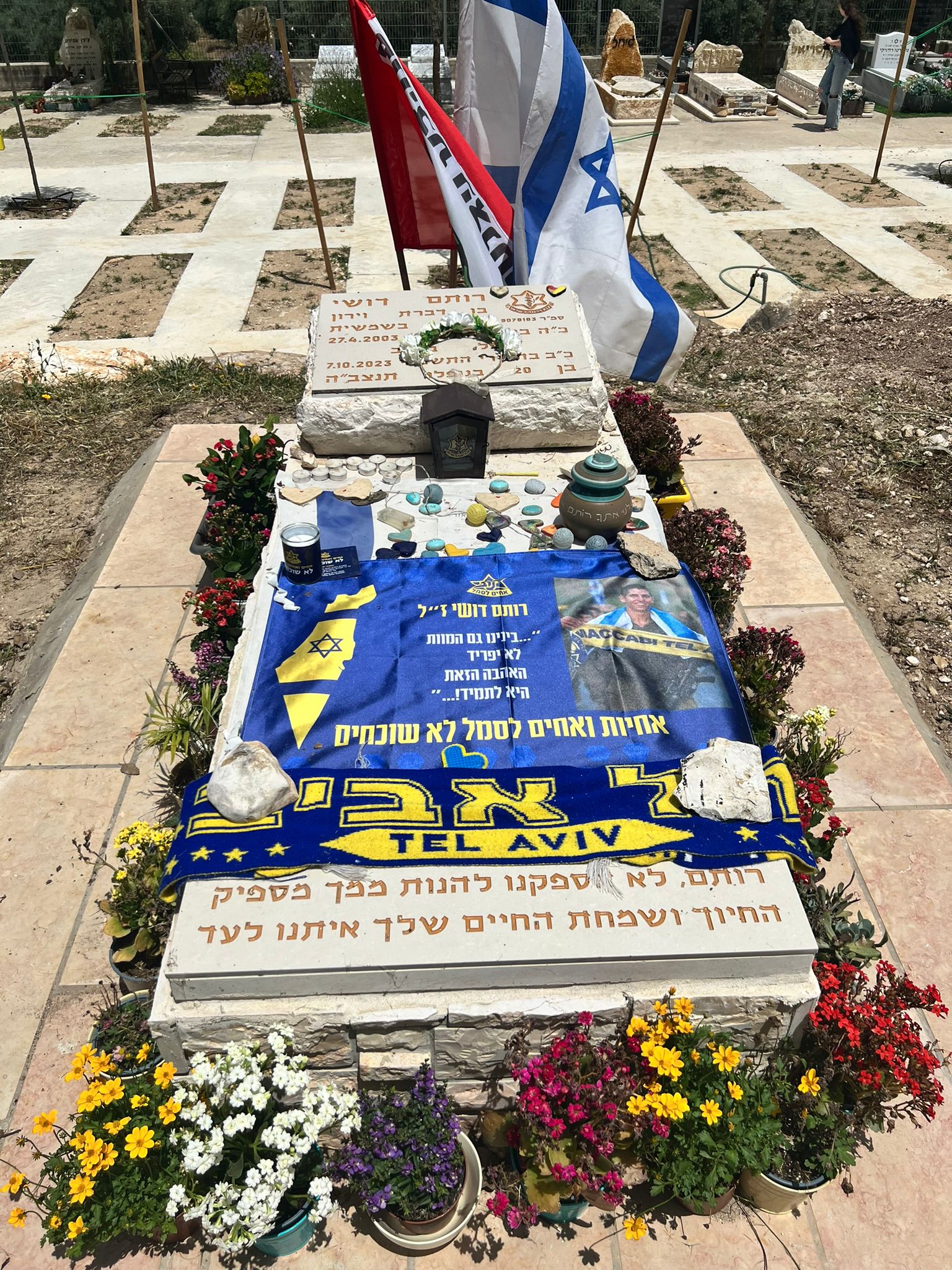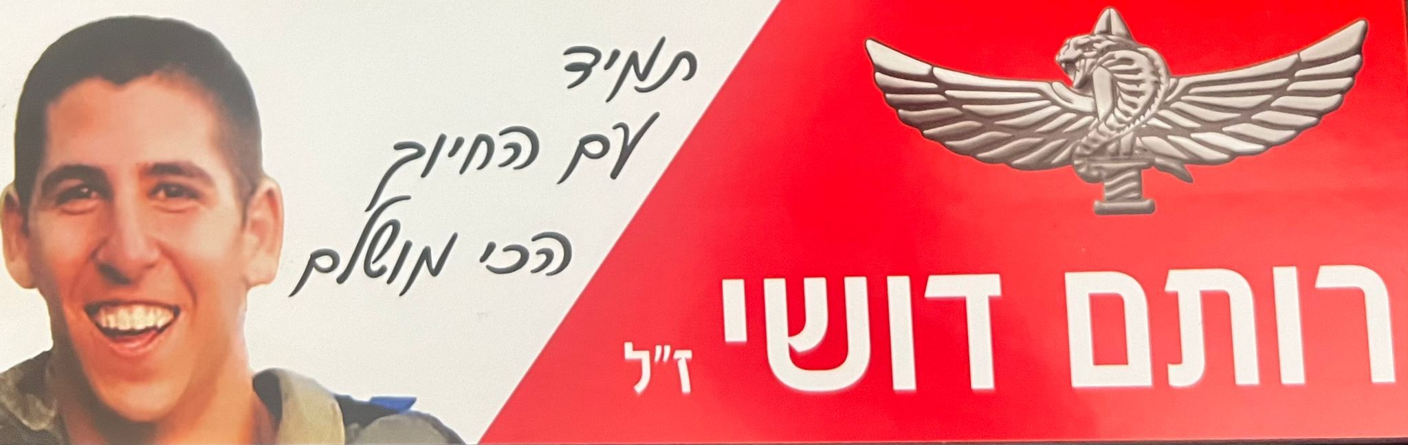 סמ״ר רותם דושי לוחם בחטיבת הצנחנים, נפל בשבת הארורה ב 7 לאוקטובר כשנלחם להגן על תושבי כפר עזה. רותם היה הנשמה של המשפחה , הילד השובב עם הלב הכי ענק. הילד הכי מצחיק, קונדסון על מלא, שובב אמיתי עם לב של זהב. רותם אהב את החיים, אהב את מכבי תל אביב, אהב מוסיקה, מסיבות תמיד היה מוקף בחברים, לכל מקום שרק הגיע נכנס עם החיוך שלו ללב של כולם, רותם היה הלב הפועם בכל חבורה, הלב של כולנו ! כששאלו אותו מה ירצה להיות כשיהיה גדול, ענה: לא משנה מה העיקר להנות. עכשיו הלב נדם, נותרנו המומים ושבורי לב, נפער לנו בור ענק בנשמה! אנחנו מתגעגעים ומתחייבים, נדאג שכל העולם יכיר את החיוך שלך, יכיר את הלב שלך. כולם יכירו את רותם שלנו! תודה גיבור שלנו ! זכרך לא ימוש מליבנו לעולם ועד!