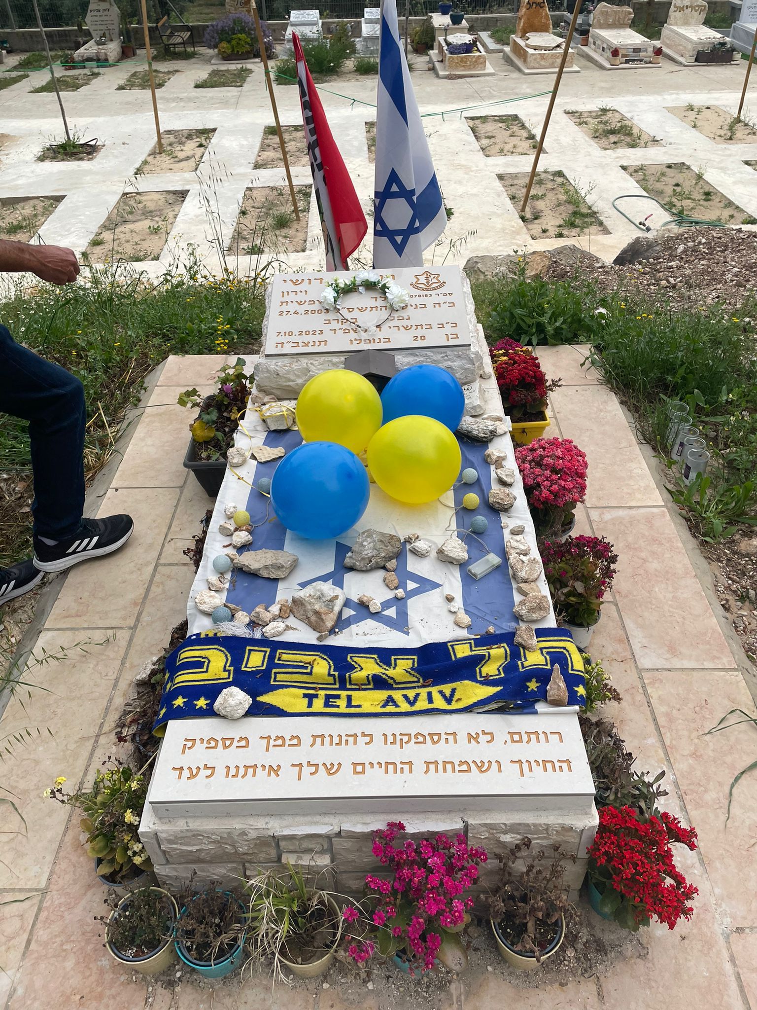 היום....אמא שלך נתנה לי שקית וביקשה שאניח את כל החפצים שבה, איך שבא לי...אני מניחה ובוכה,מניחה וכואבת את העובדה הלא נתפסת הזו,שזה הקבר שלך!!!! שמתי גם כמה עציצים ממשתלה מהעוטף...מהמקום שהצלת וחרפת את נפשך בו.