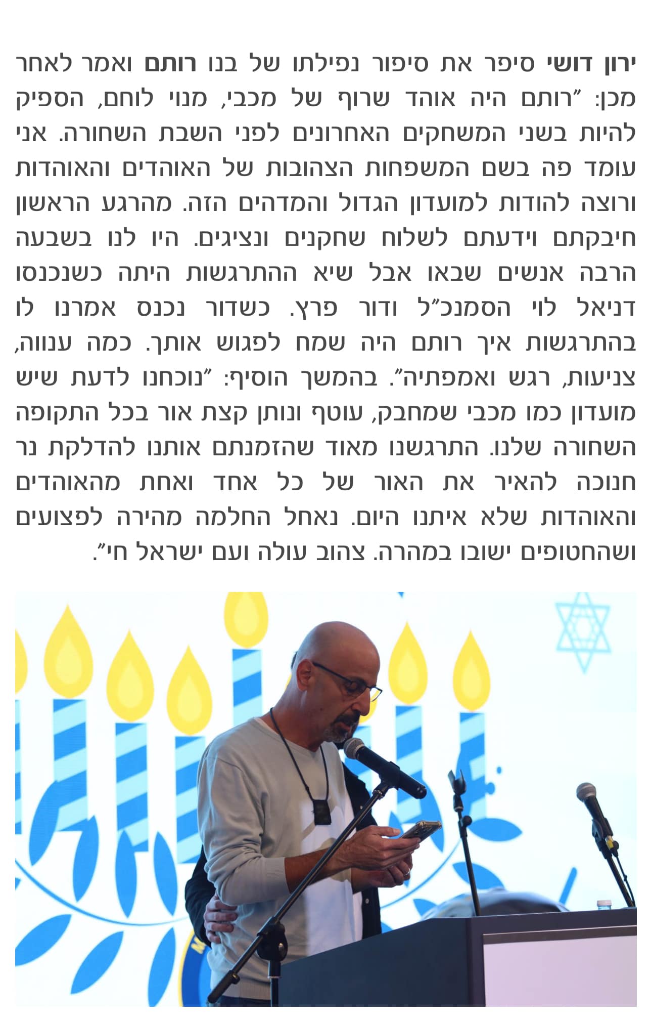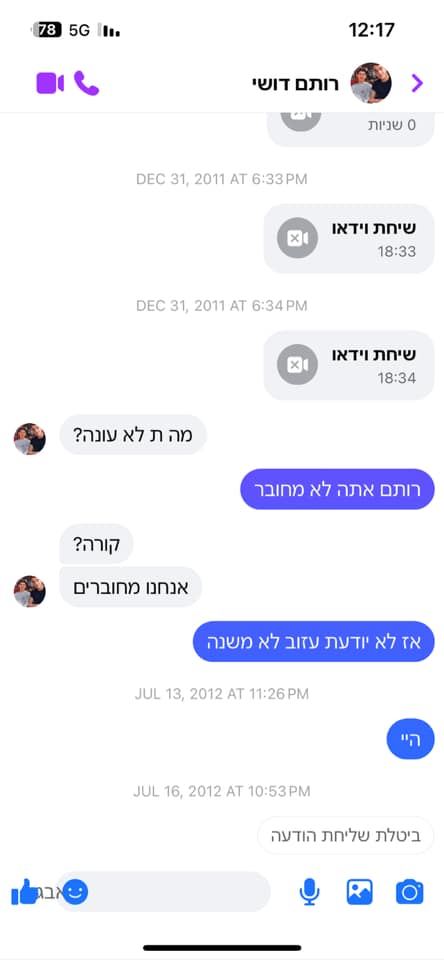 רותם שלי, אהוב ליבי, החבר הכי טוב שלי בעולם זכיתי לאהוב בן אדם שפוגשים פעם בחיים. זכיתי להיות האהבה הראשונה שלך. רותם דושי תודה שהיית אהבת חיי. תודה שלימדת אותי מהי אהבה אמיתית. א-ה-ב-ת א-מ-ת! תודה שסירקת אותי בכל פעם שלא היה לי כוח, שלמדת לעשות לי קוקו וצמה. תודה על כל התקופות והרגעים הבלתי נשכחים איתך. רותם אתה הבן אדם הכי חזק, אמיץ וטוב לב שאי פעם הכרתי. היית גבר שבגברים, נשמה טהורה שלי. המוח עוד לא מעכל שאתה כבר לא פה הלב שלי נשבר לשניים. הקסם האישי, החן, היופי והשמחת חיים שלך תלווה אותי לעד! העיניים הטובות שלך והחיוך הכי כובש בעולם חרוטים לי בזיכרון. הייתי מנשקת לך את הפנים מלא.. אהבתי.. הייתה לי חולשה לפנים שלך.. היית בן זוג כל כך טוב, היית הגבר שלי תמיד אהבת להצחיק אותי, דאגת להצחיק אותי! איזו אישיות עוצרת נשימה, אנרגיות טובות, אור ושלווה. החיים הזויים ולא צפויים, ומעבירים אותנו רכבות הרים- זה תלוי בנו איך לעבור אותן, ועם מי אנחנו בוחרים לעבור את מסע החיים, המלא בעליות וירידות, ואני בחרתי מדוייק. אתה היית הגיבור שלי! אלוף העולם שלי ואני המעריצה מס׳ 1 שלך אני אוהבת אותך עד שכואבות העצמות בגוף אני אוהבת כל חלק בגוף שלך רותם אתה באמת מושלם.. כמה צחקנו בשישי.. חיכיתי לך שתחזור מהמסיבה.. כתבת לי לנסות לישון ושתבוא בלילה ותחבק אותי חזק. תמיד חיכיתי לך, ועכשיו? הייתי מחכה גם עוד מיליון שעות כדי שתחזור. ולמחרת כשהלכת בפעם האחרונה ממש נפרדת ממני, ידעת, ידעת.. כתבת לי להשאר עם ההורים שלך, שאני אשמור על עצמי ואהיה חזקה בשביל כולם.. כתבת לי לשתות מים ולאכול והייתה לי בחילה, אבל אתה ביקשת שאכניס משהו לגוף. אני אמשיך לעבור את החיים כשאני רואה את היופי וההומור בכל סיטואציה כמו שלימדת אותי. אז הנה אני, עושה צעד צעד כדי לעלות למעלה ולהיות מיום ליום טיפה יותר חזקה, אני מבטיחה לך שאהיה חזקה. תשמור עליי מלמעלה. המלאך השומר שלי אני מתגעגעת אלייך מעומקי נשמתי עד השמיים ובחזרה, עד השמש הירח והכוכבים. עד סוף העולם וכמו ששלמה ארצי אומר בשירים שכל כך אהבנו לשמוע אני אקדח טעון געגועים תמיד שלך עדי