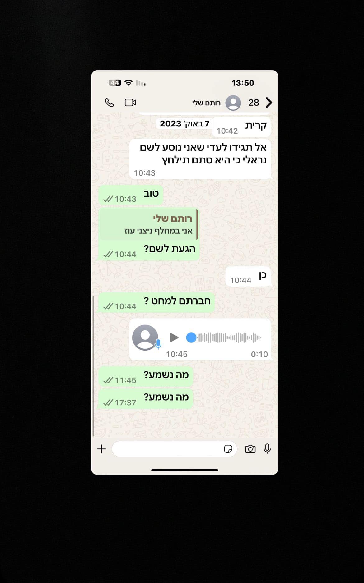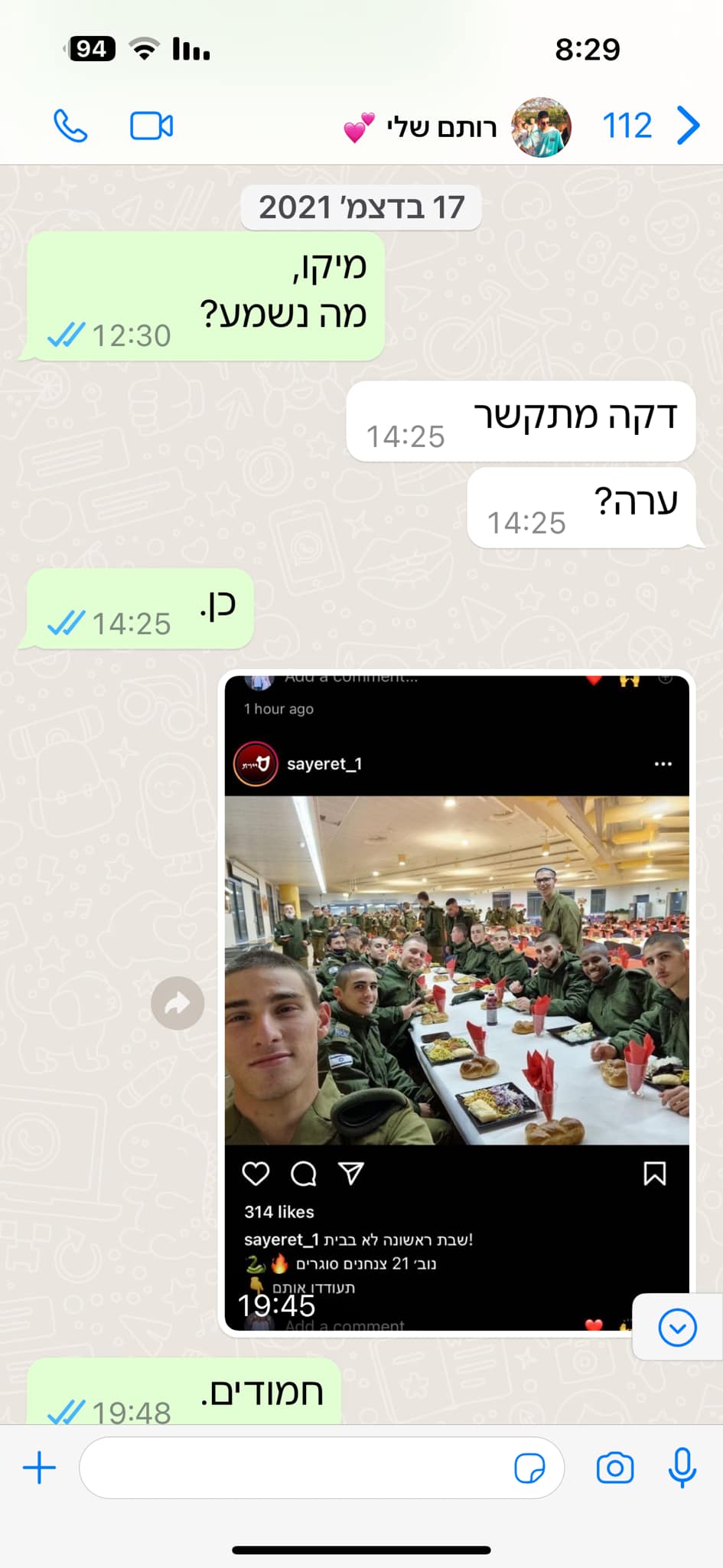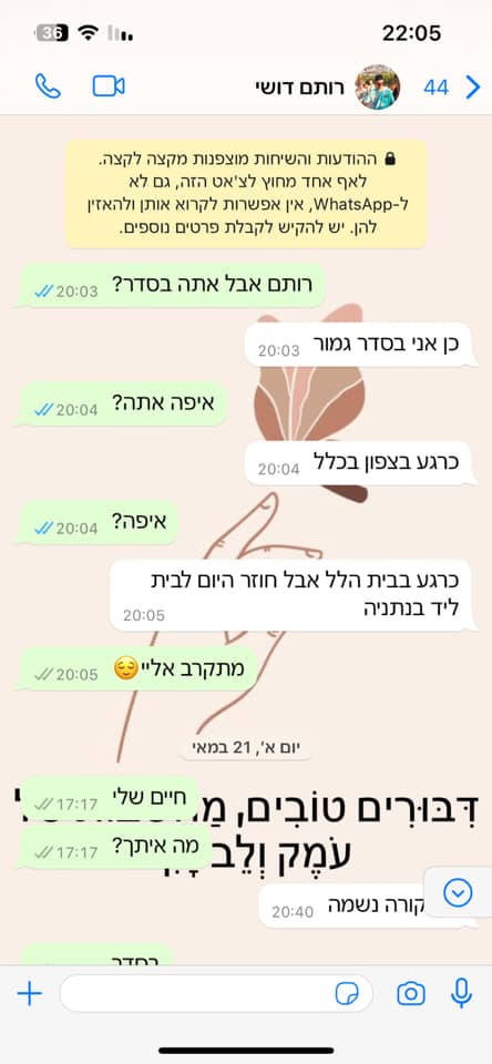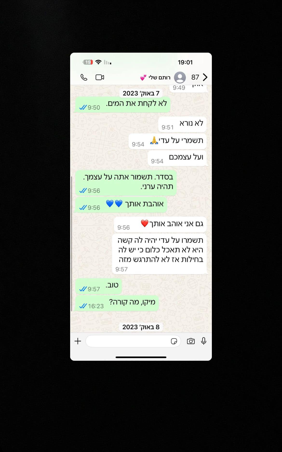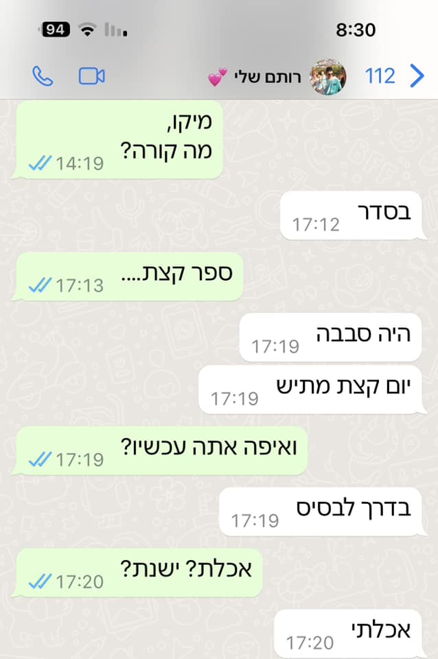 ההודעה האחרונה שכתבת לי היתה אני אוהב אותך תשמרו על עצמכם ועל עדי.