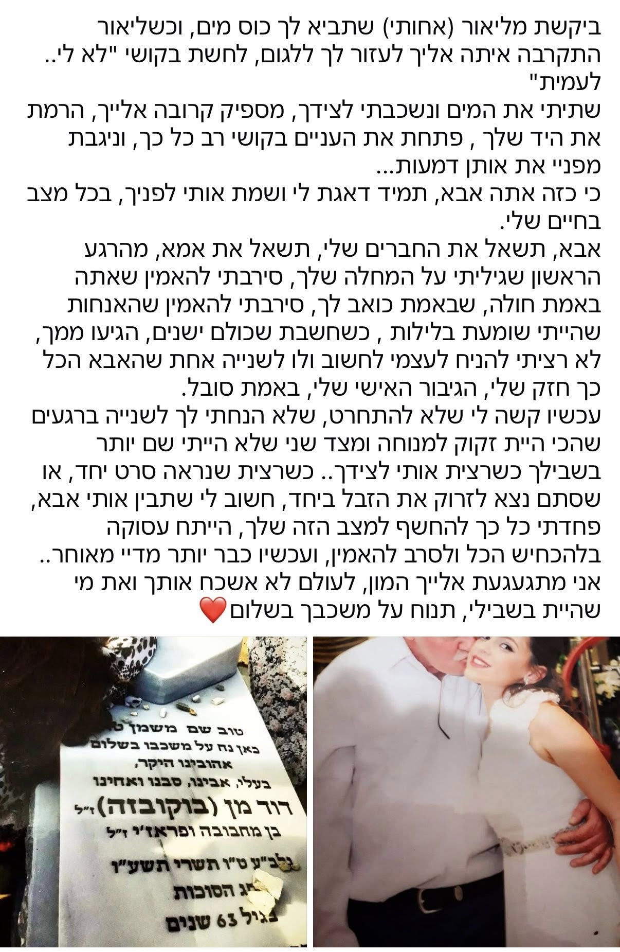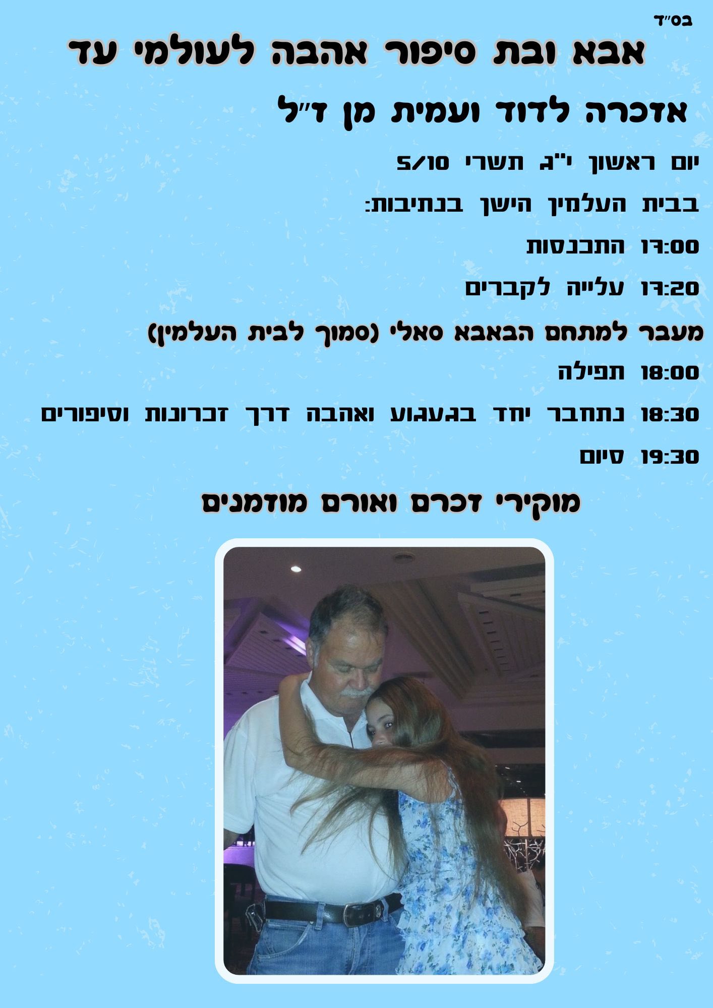 לפני מספר שנים, גם כן בחג סוכות, הלך לעולמו אביה האהוב דוד.