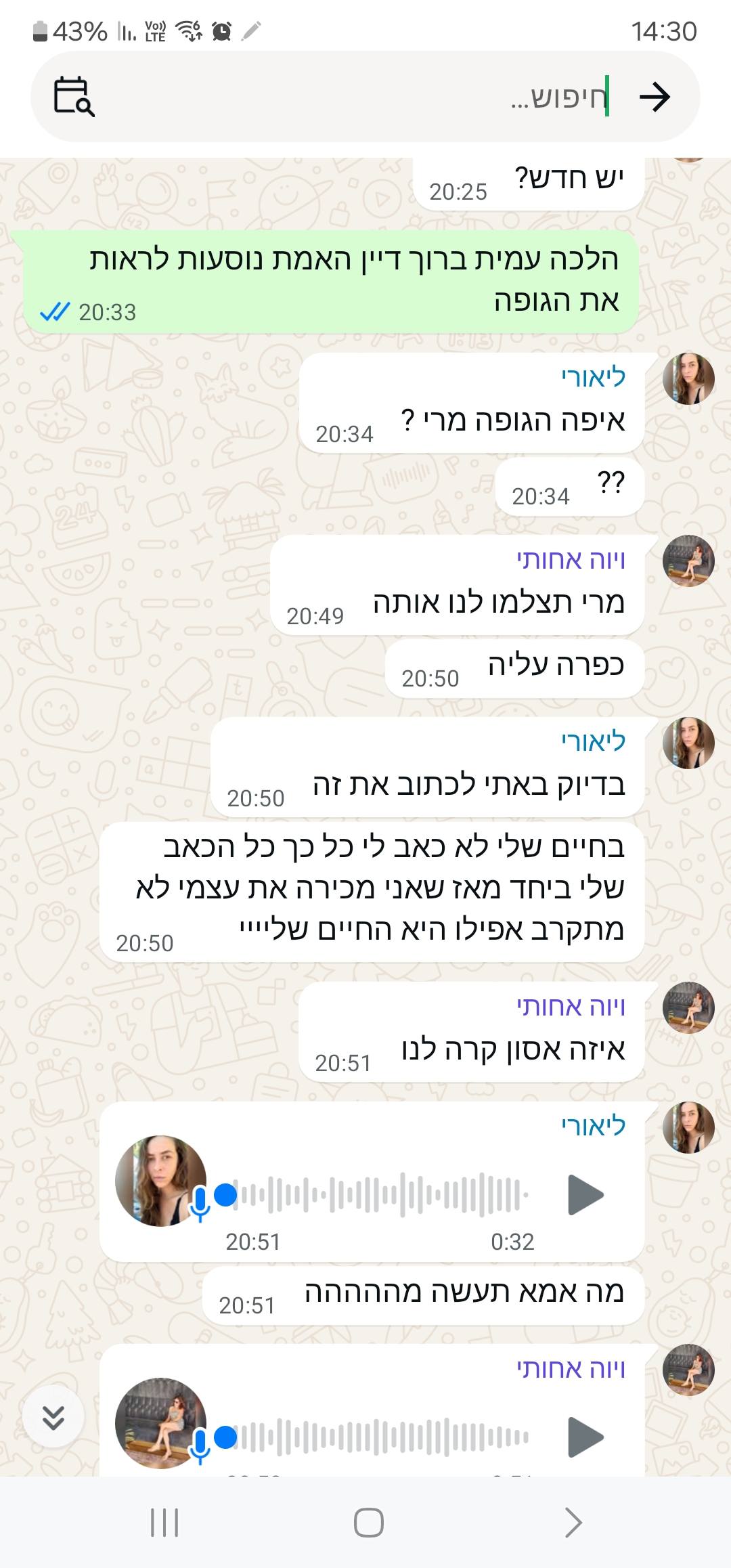 ואז הודעה ממנה ״הם פה, הם במרפאה, אני לא חושבת שאצא מזה, אני אוהבת אתכם״