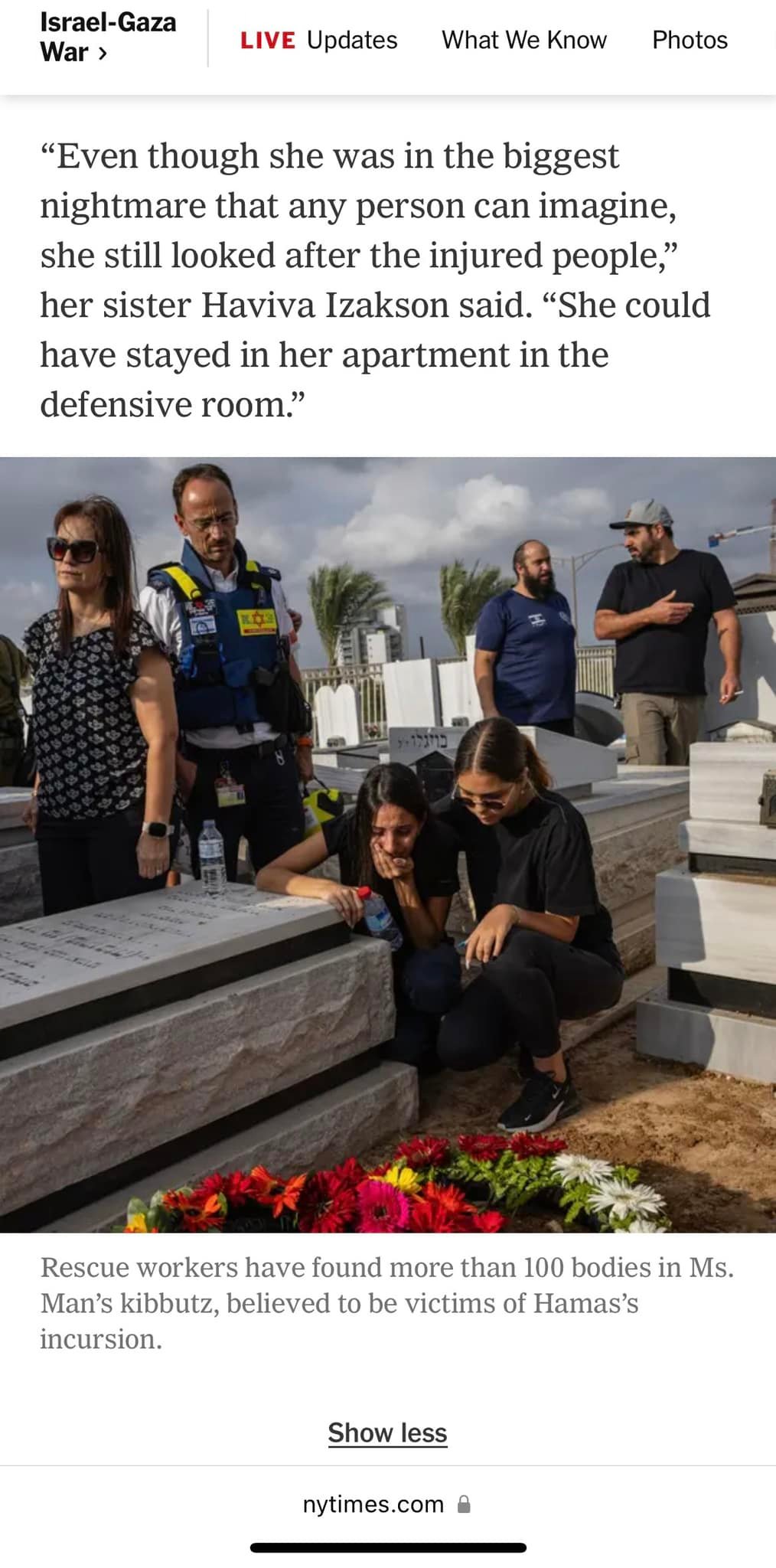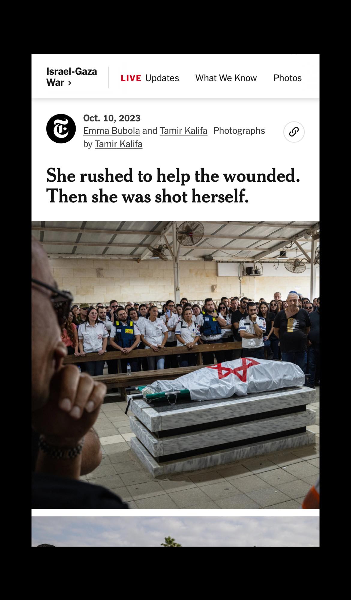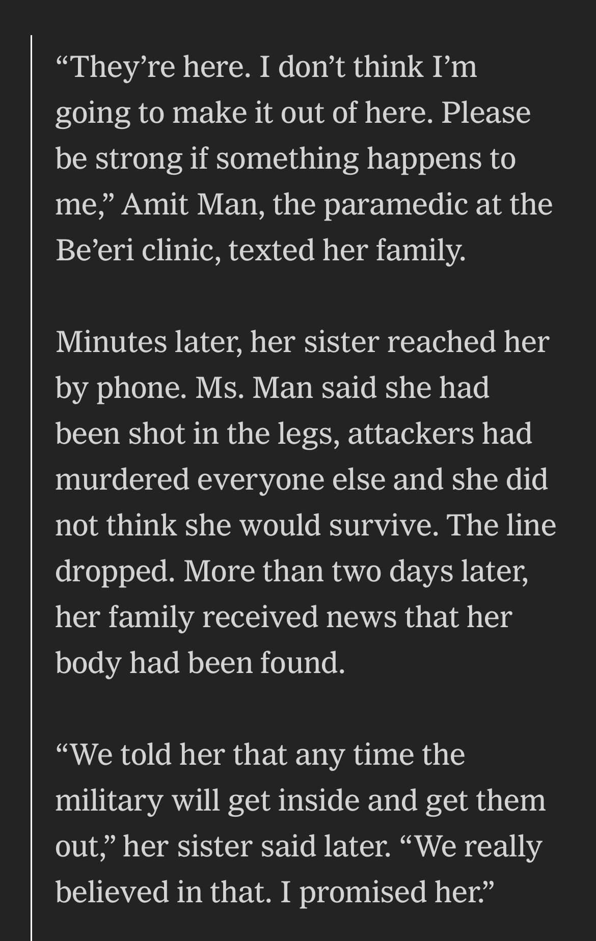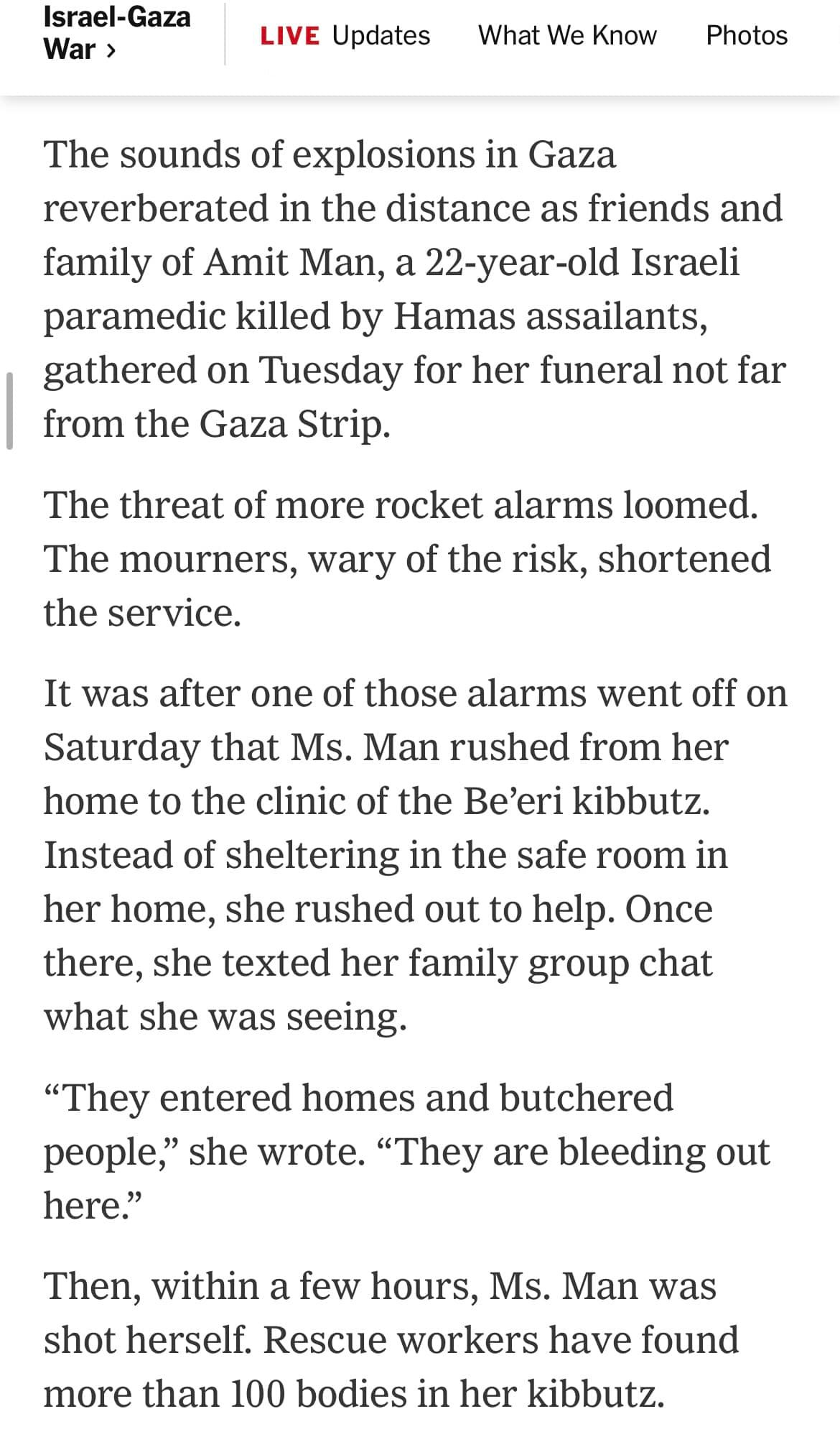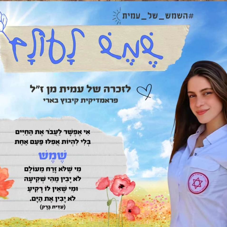 עמית,אחיינית יקרה שלי שבחרה להציל חיים,שכלת את אבא דוד כשאת בת 14 שנים,ראית את המלאכים/יות בלבן עושים הכל להציל אותו והנפש שלך התחברה להצלת חיים,בגיל 20 הוסמכת לפארמדקית מצטיינת במד״א בשבת במרפאת קבוץ בארי טיפלת בפצועים רבים והצלת חיים,ב14:00 בצהריים שוחחת עם אחותך חביבה ברקע זעקותייך לעזרה,מילות פרידה,אהבה ,תשמרו על אמא וברקע צרורות ירי מטווח אפס מחיות חלאות נבלות בני עוולה כל כך כואב ודואב הלב רק שבוע שעבר חבקתי אותך לליבי באזכרה של אבא ,אחי דוד שעכשיו את מצטרפת איליו נתגעגע אילייך יהי זכרך ברוך לעד💔