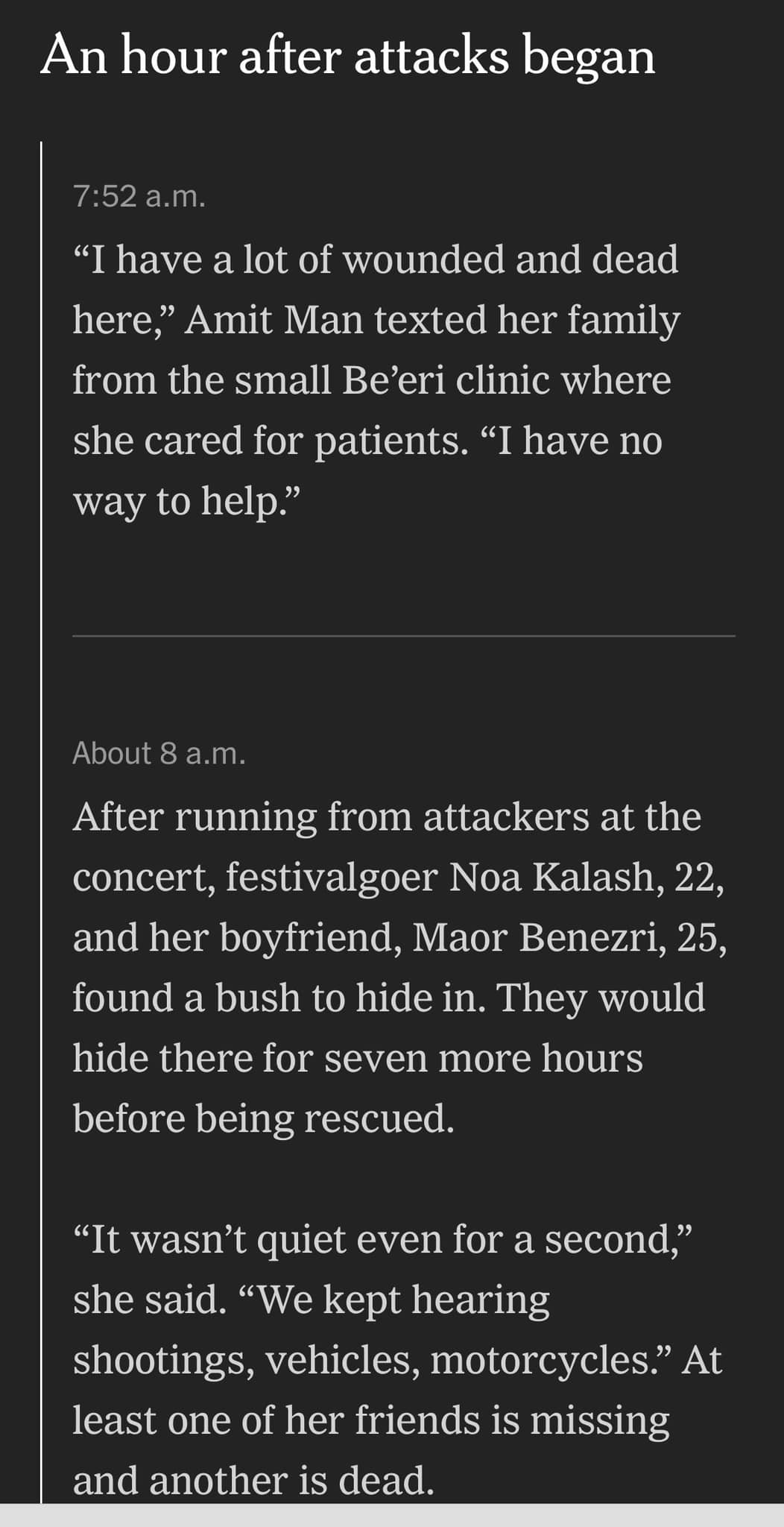 ואז אחרי דקות שמרגישות כמו נצח שהיא לא מגיבה, אני מנסה ניסיון נואש, מחייגת אליה, היא עונה לי בצרחות שירו בה ברגליים, שרצחו שם את כולם והיא אחרונה, שהם עליה!! אני שומעת יריות והשיחה מתנתקת