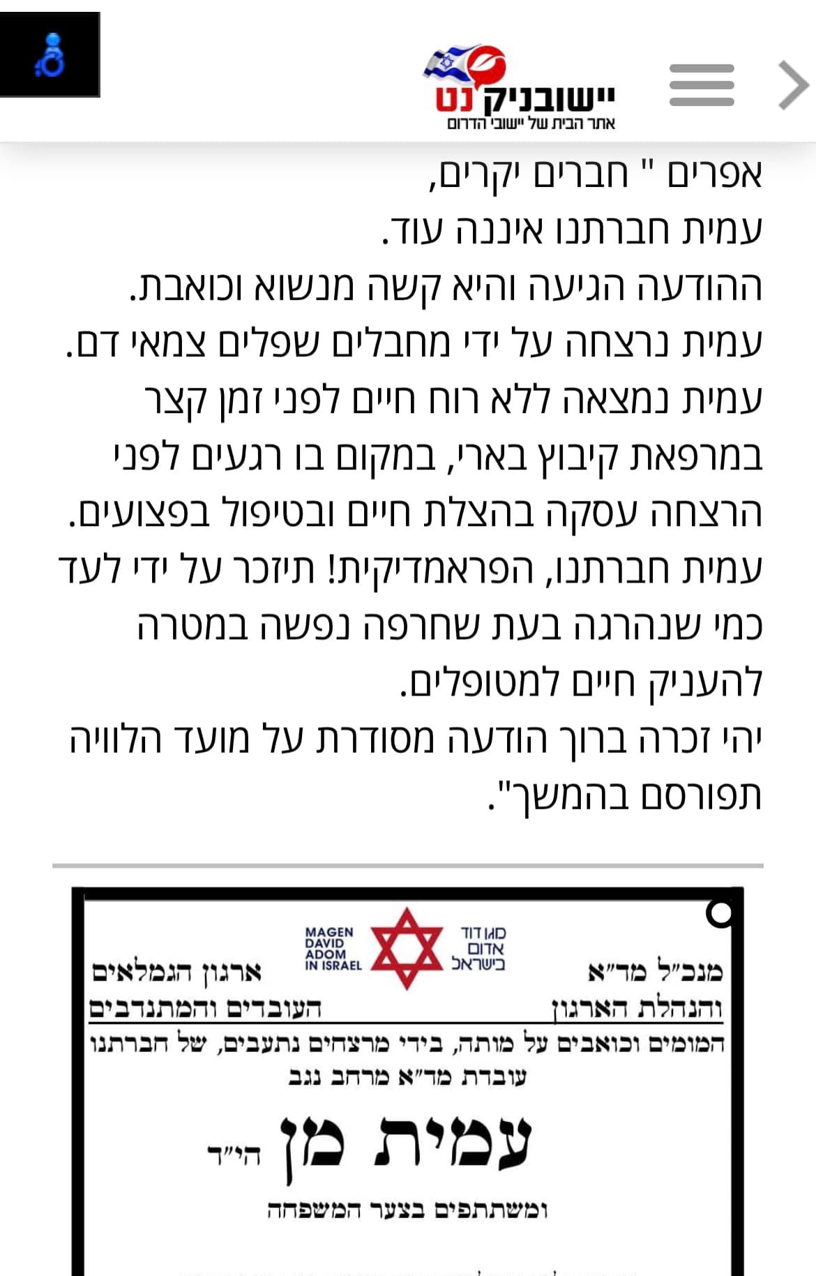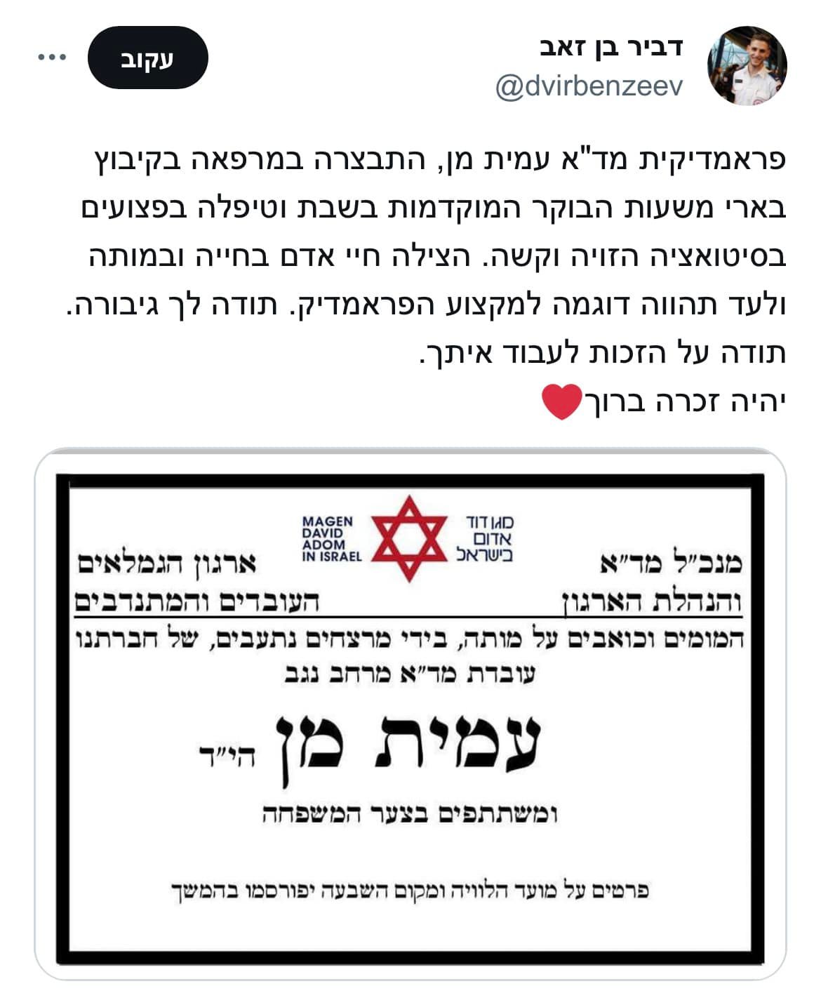 *פראמדיקית מד"א ומדריכת קורס פראמדיקים של מד"א בנגב, עמית מן ז"ל, נרצחה כשנורתה על ידי מחבלים כשנכנסו למרפאה בקיבוץ בארי כאשר טיפלה בפצועים ביום שבת | מנכ"ל מד"א: "עמית הייתה גיבורה שפעלה להציל חיים של אזרחים גם תחת אש"*