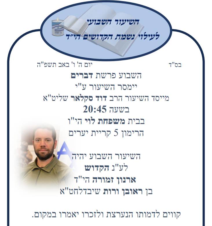 רק בסיום הקריאה כשסרקתי את הקוד והגעתי לאתר זה, גיליתי לתדהמתי שהקדשתי את יום יד' באלול תשפ"ה , במלואו לזכרו של ארנון זמורה זצ"ל. יום ההולדת העברי . התרגשתי ובכיתי עם התקדמות הפרקים בספר.