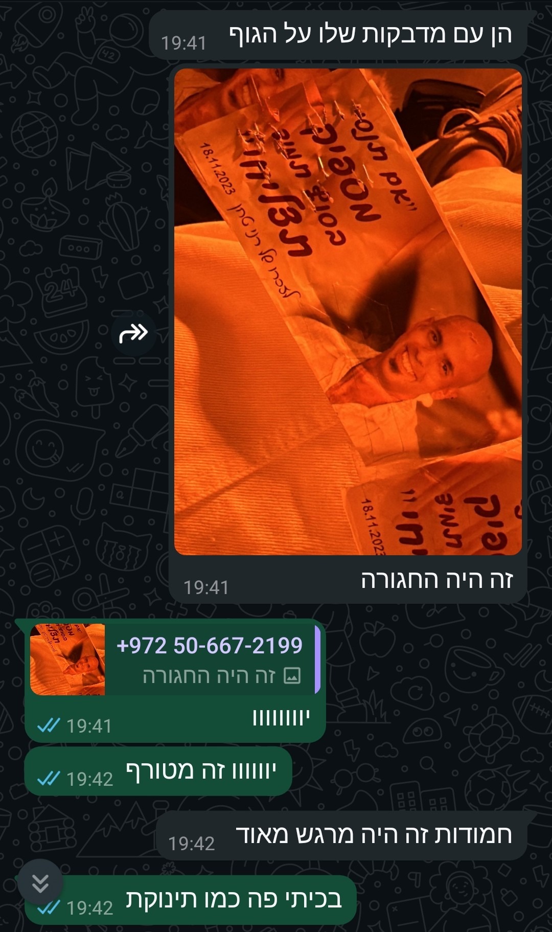 התגייסנו, השתחררנו, וכל אחד פרש כנפיים לכיוון אחר. ואז, שנתיים לפני ה-7.10, חידשנו את הקשר כאילו לא עברו שנים. הכי טבעי שיש. המשכנו מאיפה שהפסקנו. שוב תחומי עניין זהים של גיל ה-40, שיחות על החיים, המשפחה, המילואים, הפחדים והגעגוע. באותו לילה כתבת לי כמה אתה שמח שהקשר חזר, ואני הייתי מאושרת.
