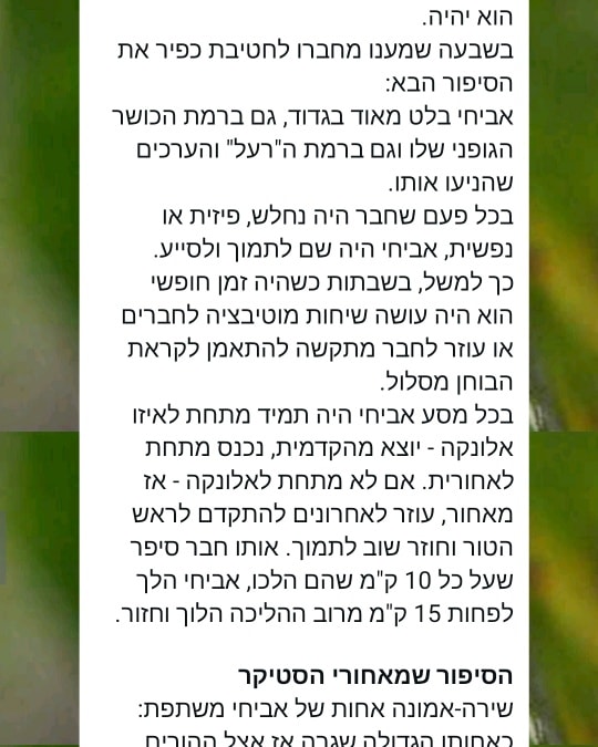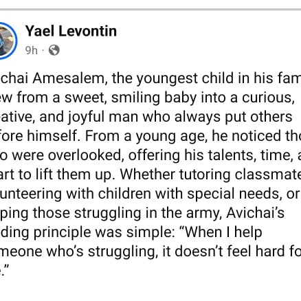 רוב האנשים כאן מכירים אותך כאביחי, התלמיד השובב אך האחראי במדרשיה, זה שהיה עושה שטויות אבל גם נלחם על המוסר והאמת והצדק גם במחיר של עונשים מהר"מים, או כאביחי, התלמיד המסור בישיבת שבי חברון שכל כך אהבת ושגררת אליה את כולנו לשבת רגע לפני שהתחתנת, או כאביחי ההייטקיסט שהצליח לצמוח בתוך החברה שלו בלי יותר מדי תארים מפוצצים פשוט רק כי הוא מוכשר, נעים ואמביציוני או כאביחי הסטודנט להנדסת חשמל שהיה מצליח לג'נגל בין משפחה, שתי משרות ולימודים ועדיין לסיים כמצטיין. יש גם כאלה שמכירים אותך כאביחי הבן של, הנכד של, האחיין של, אח של, אבל אני אחותך הבכורה ואני זו שהייתה שם כשאימא הביאה אותך הביתה ואני זו שהייתה לוקחת אותך איתי לסניף בפרדס חנה יד ביד את כל הדרך ואני זו שהגעת בטרמפים מחברון עד תל השומר לנגן לה בגיטרה כדי שתתעודד אחרי ועל הדרך שמחת כל כך לעודד את החולים האחרים. אני זו שראתה כמה אור וטוב יש בך, כמה רגישות לאחר ואני זו שהייתה שם לראות אותך גדל ממש מההתחלה, בזמן שאני גדלה בעצמי, להתפעל מהתינוק המתוק, הנוח, החייכן.