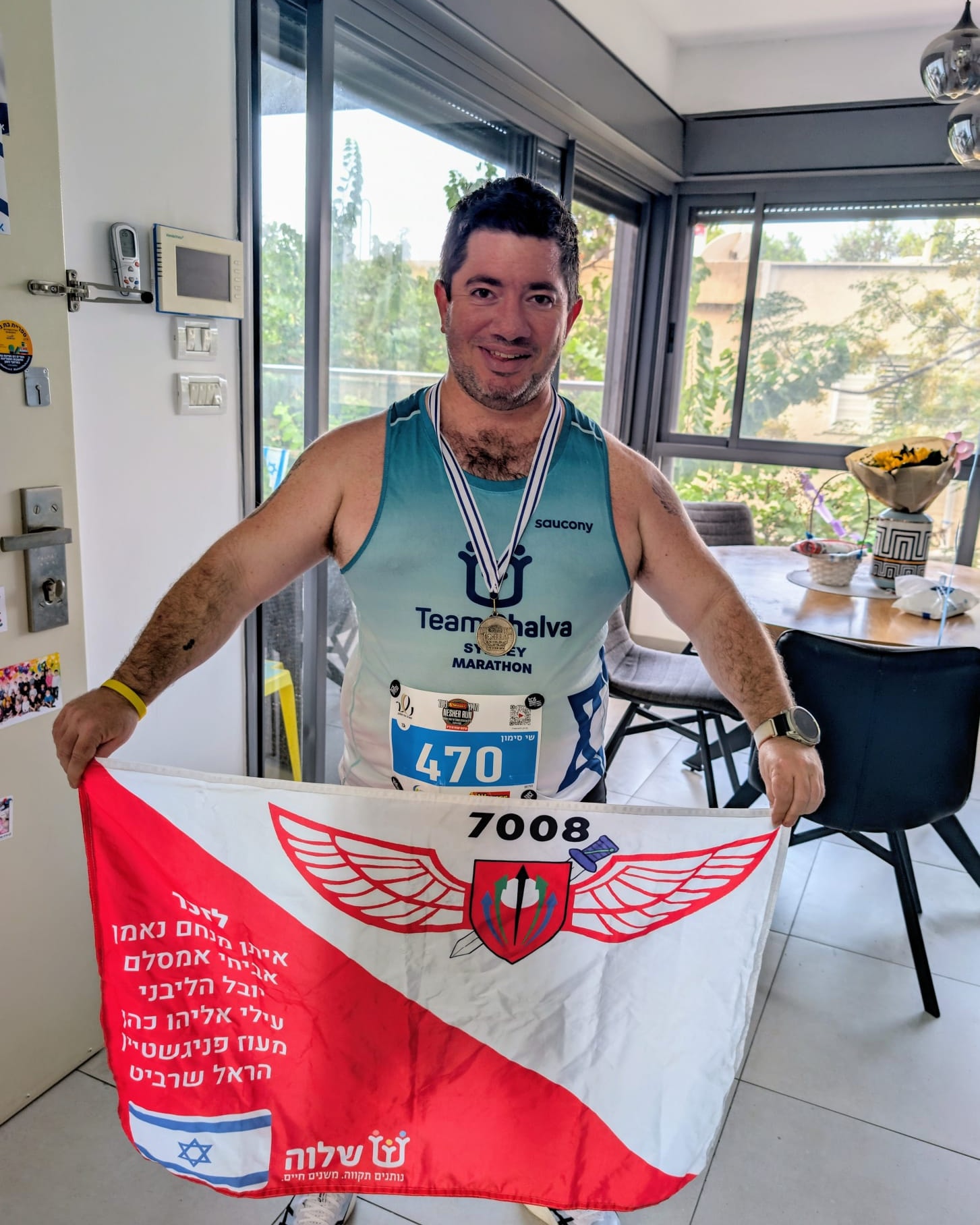 שי סימון האלוף!!! חבר של אביחי מהגדוד (7008), רץ ביום ששי האחרון את חצי מרתון עיר ועמק וכמו תמיד- לא שכח את הדגל המיוחד שלו.
