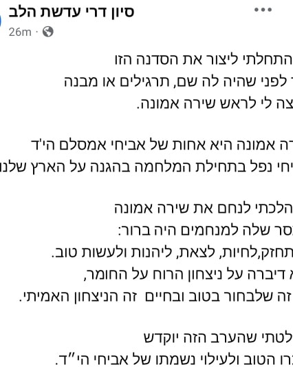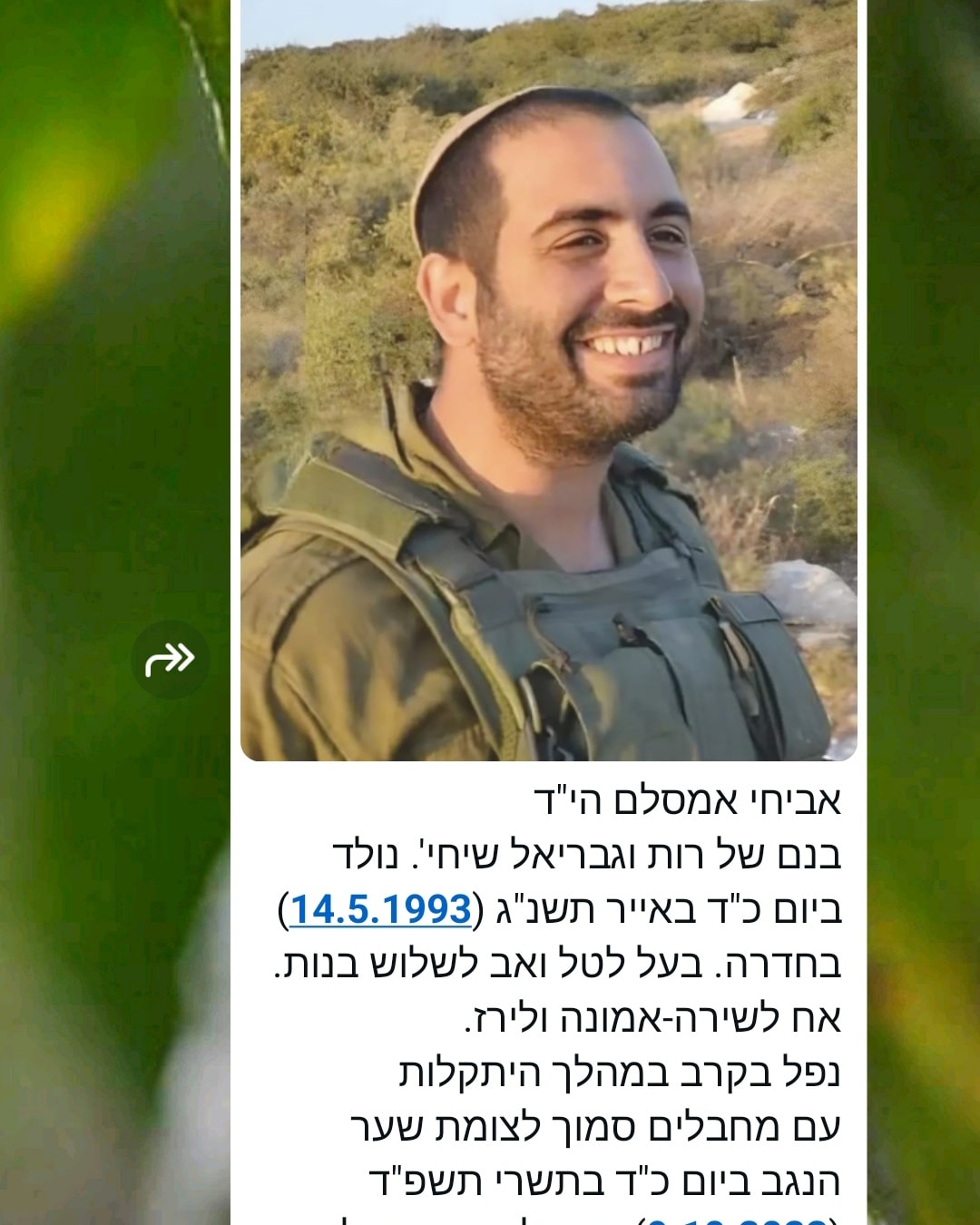 אני אחות של רס"ר במיל' אביחי אמסלם, אחי הקטן מורי הגדול, מחמד לבי, מחמל נפשי והמלחמה הזו מבחינתי היא לגמרי "מלחמת התקומה" והשביעי באוקטובר זה לגמרי "מאורעות" ולא רק טבח.