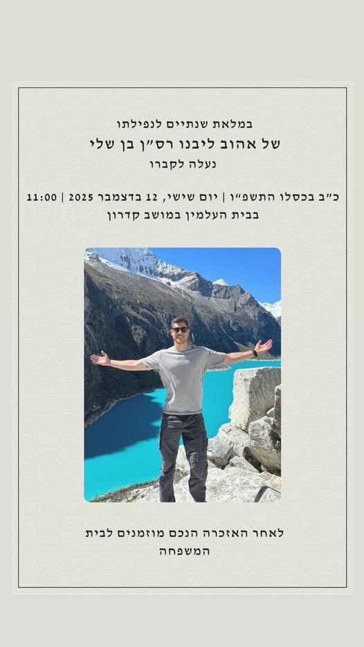 בן בן שלי, ב 6 לאוקטובר השנה החיים קיבלו תפנית. בארוחת שישי אחת לפני האחרונה שעשינו במשותף, אמרת לנו שיש לך כרטיס למסיבת נובה אבל בגלל פעילות מבצעית ביחידה אתה לא תהיה שם. ב 7 לאוקטובר, אחרי שהבנו מה קרה במסיבה, הרגשנו אמא ואני ברי מזל על כך שלא היית שם.