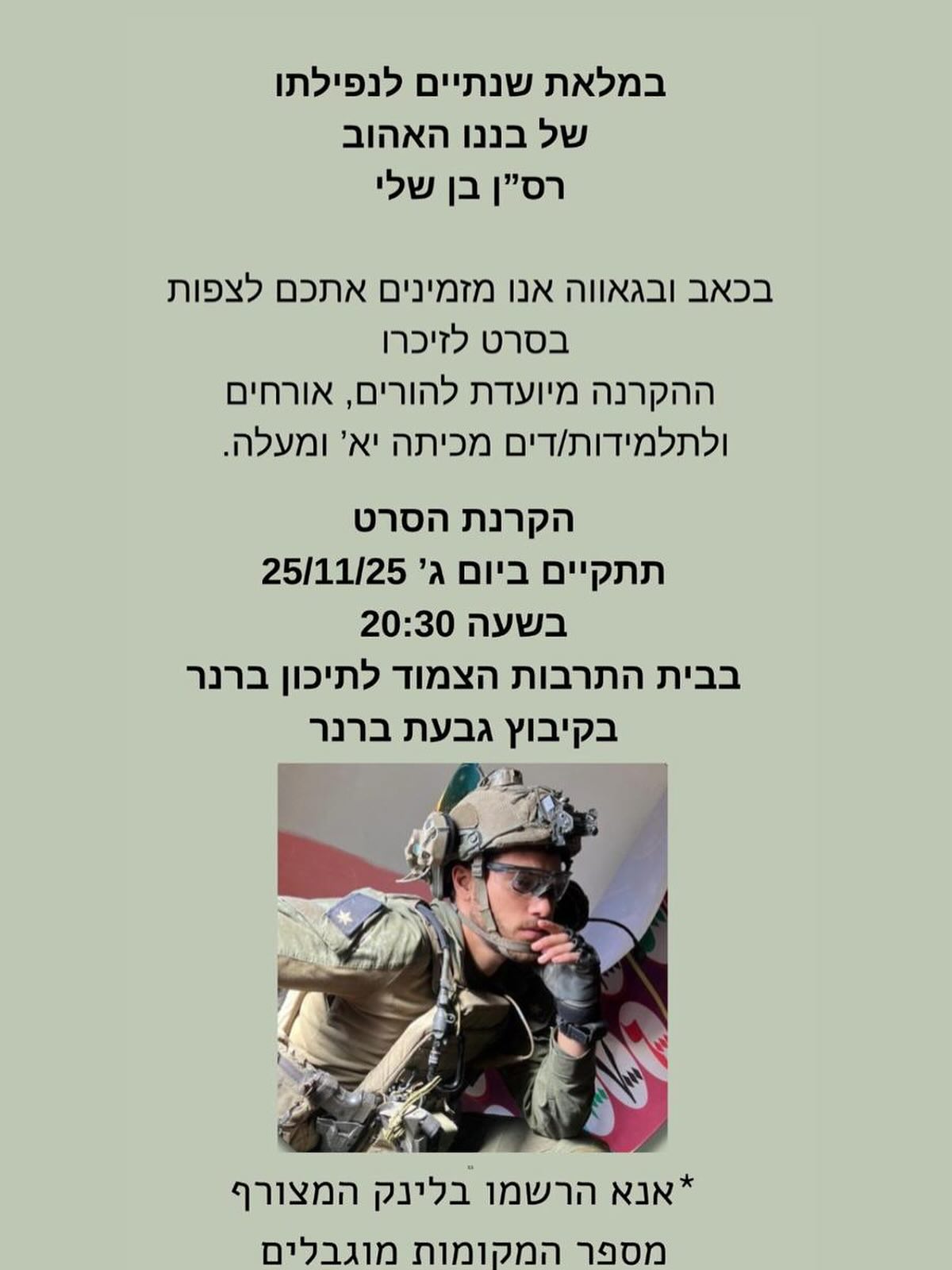 בן שירת בתפקידים משמעותיים ביחידות שונות – אגוז, גולני ו-669 – היה לוחם ואדם מיוחד במינו. אחיו שיתף אותנו בסיפורים מרגשים, בסרטונים ובעיקר בתחושת שליחות ואהבת הארץ שבן גילם בכל צעד בחייו.