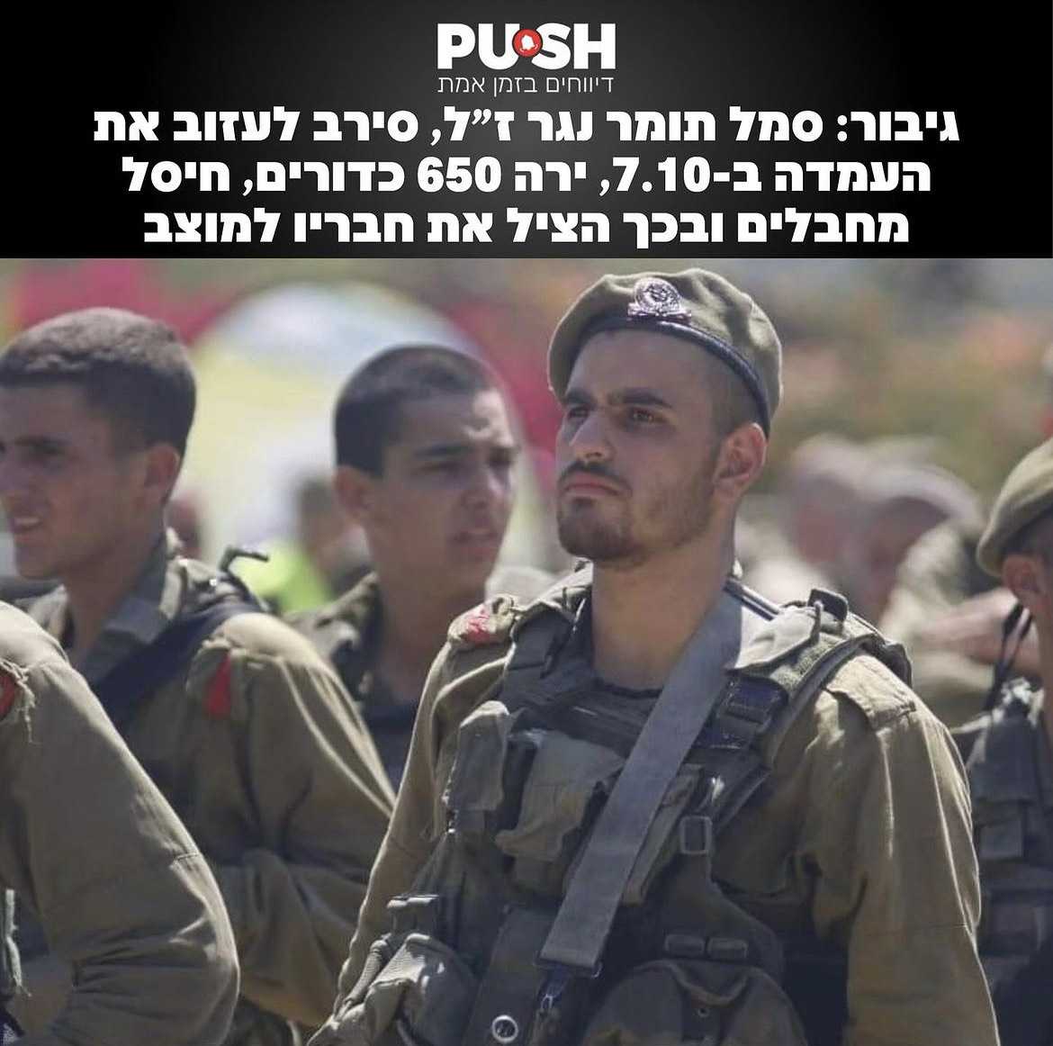 נר חמישי לזכרו ולאורו של תומר נגר ז״ל תומר נגר (20) נפל בשבת השחורה במוצב בו שירת בכיסופים. תומר חייל בגדוד 51 של גולני, נגביסט, גיבור ישראל שסרב לעזוב את העמדה שלו- ירה 650 כדורים וחיסל עשרות מחבלים לבד לגמרי (!) ומנע חדירה למוצב כיסופים. הובא למנוחות עולמים ביום שלישי, כ"ה בתשרי התשפ"ד, 10 באוקטובר 2023, בבית העלמין הצבאי בחולון. תומר מלח הארץ, איש של אנשים, של עשייה חינוכית. לאורך שנותיו בתיכון לקח חלק כמדריך נערץ בתנועת הצופים בשבט שקמה באזור. לאחר סיום י״ב בחר להתנדב לשנת שירות בבת ים. תומר הוא סמל ושל שאיפה למצויינות ולהצלחה. תומר נגר ז״ל הוא דוגמה למופת, דוגמה לאדם שאוהב את ארצו אהבת נפש ומאמין בה, דוגמה לאדם שמאמין ביכולות שלו - אדם שמקור כוחו בעצמו. אני שואל את עצמי איך אני יכול לכבד את זכרו ואת זכר הנופלים? מה מקומי בסיפור? ותשובתי היא שעליי ועלינו, ללמוד מהסיפורים, מההספדים ומחייהם איך לעשות כאן קצת יותר טוב, איך להיות שותף בעשייה ובשאיפה לקיים חברה ישראלית שראויה לארצנו. יצחק שמיר שהיה נערץ על ידי תומר, אמר ״אם ההיסטוריה תזכור אותי בכלל, אני מקווה שאזכר כאיש שאוהב את ארץ ישראל ועמד על משמרתה כל חייו, בכל דרך שהייתה לאל ידו." אין לי ספק כי תומר עשה הכל על מנת לשמור על המוצב ועל המדינה שכה אהב. חבריו העידו כי הוא זה שהציל את המוצב. עלינו להמשיך את צוואתו של תומר - למען הנופלים, למען האבות, למען האמהות ולמען החברה כולה. לעשות הכל כדי להבטיח לשאוף ולקיים את חברת המופת שארץ ישראל ראויה לה, עלינו לעשות הכל כדי שתומר ושאר הנופלים, יהיו ראויים לכך.