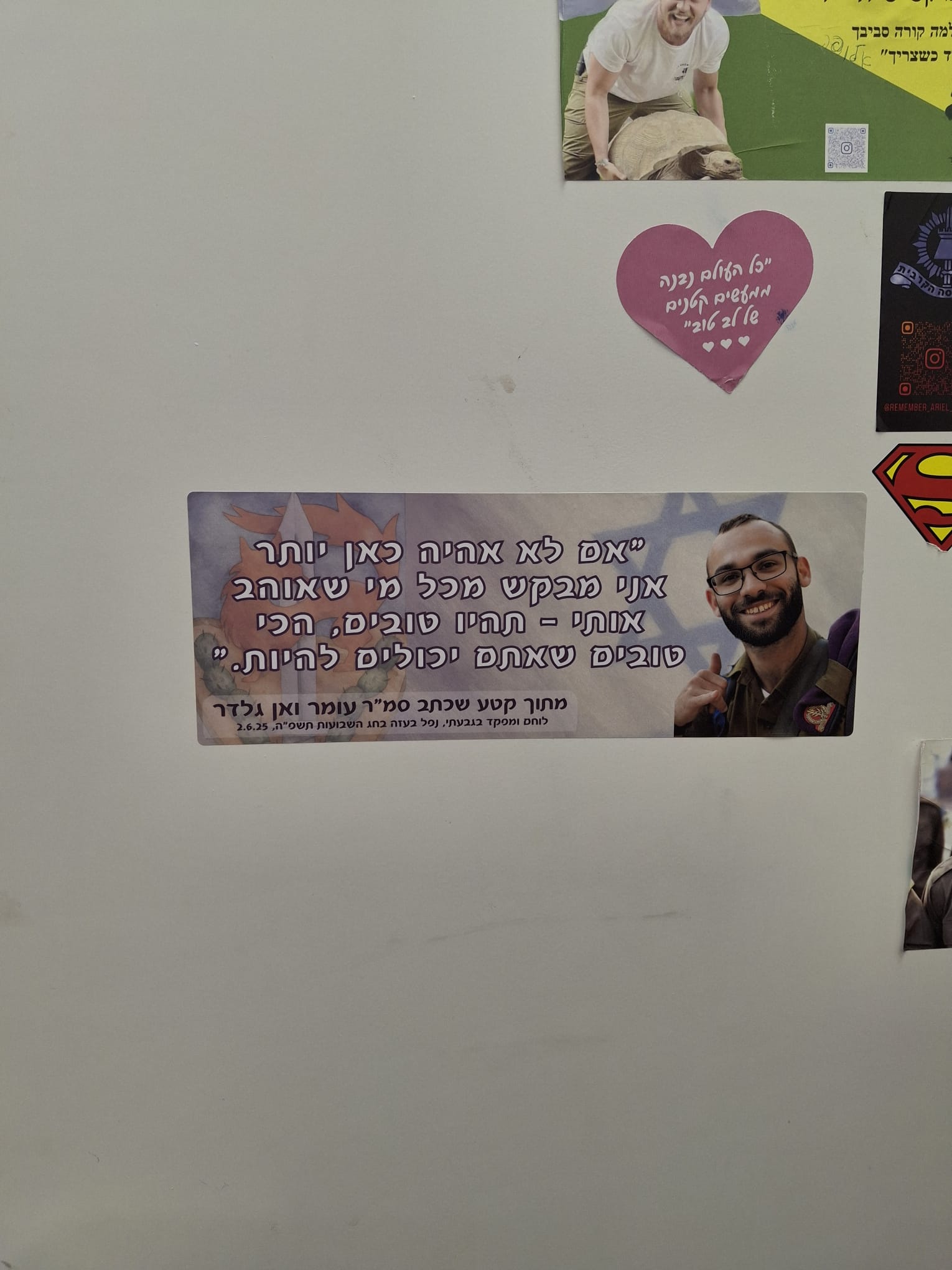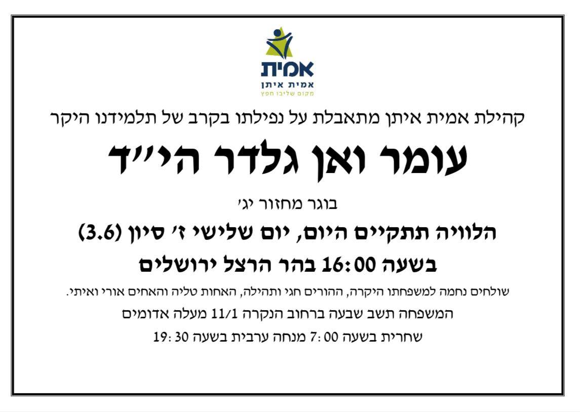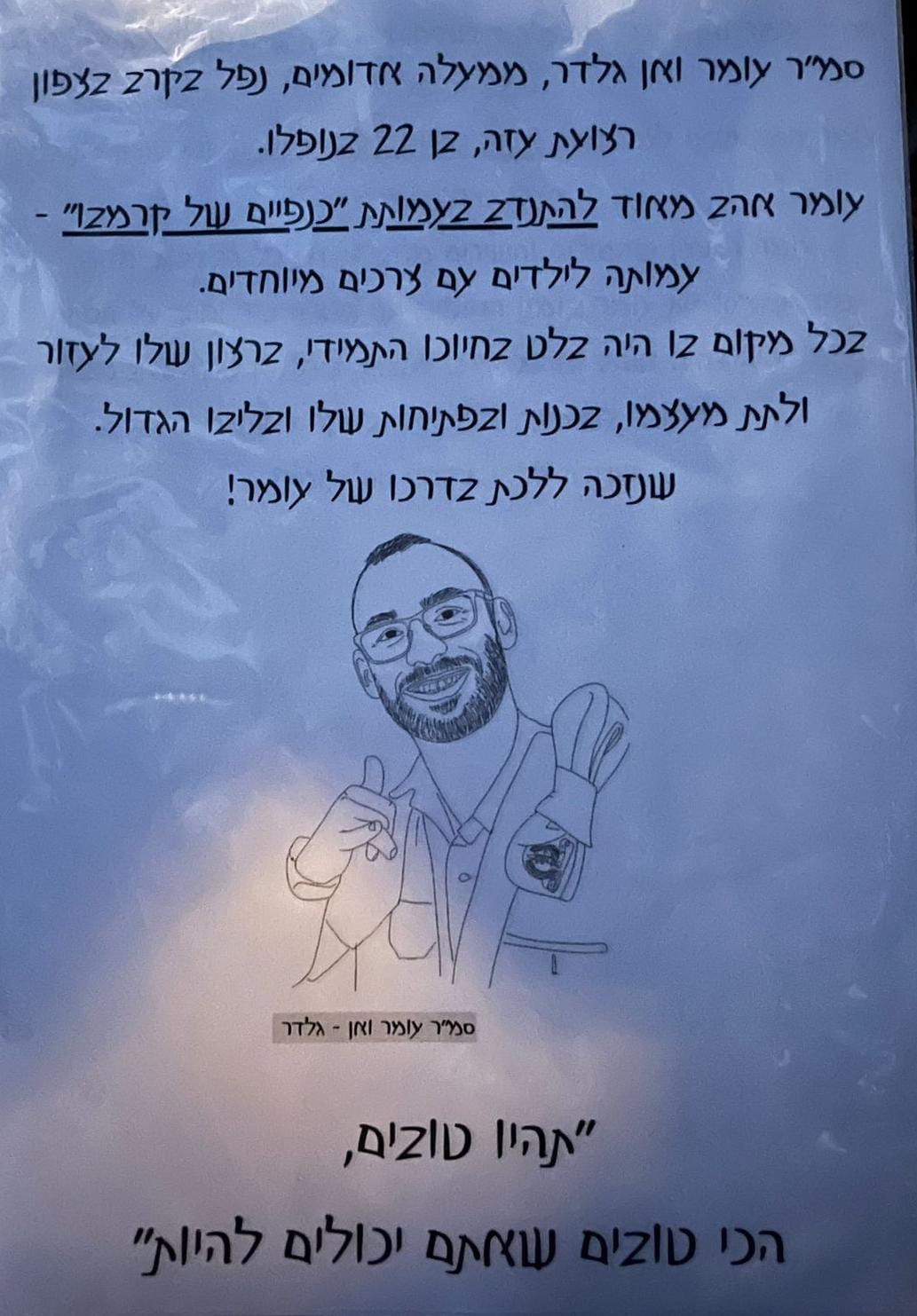 אתמול פגשתי במקרה בחור צעיר שהתנדב במד״א מעלה אדומים וירושלים, השיחה התגלגלה כמובן לעומר. ישר השתתף בצערנו וסיפר איך זוכר את המשמרות עם עומר, צוחק, מחייך, אהוב על כולם.