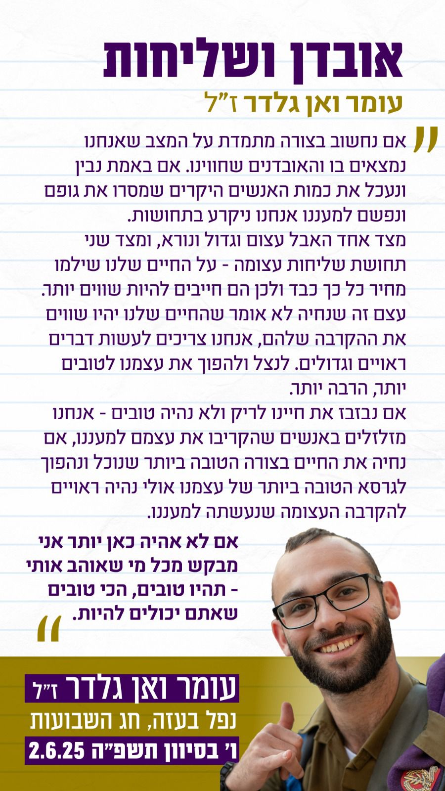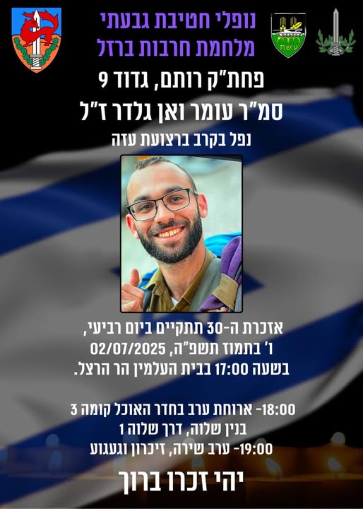 סמ”ר עומר ואן גלדר נפל בקרב בחג שבועות, ו' בסיוון תשפ"ה (2.6.2025). בן עשרים ושתיים בנופלו. הוא הובא למנוחות בבית העלמין הצבאי בהר הרצל. הותיר אחריו הורים: חגי ותהילה ואחים: טליה, אורי ואיתי, את אהובת ליבו נעמה, איתה חלם להתחתן ועוד בני משפחה, חברים וחברות רבים, שחסרים אותו מאוד.