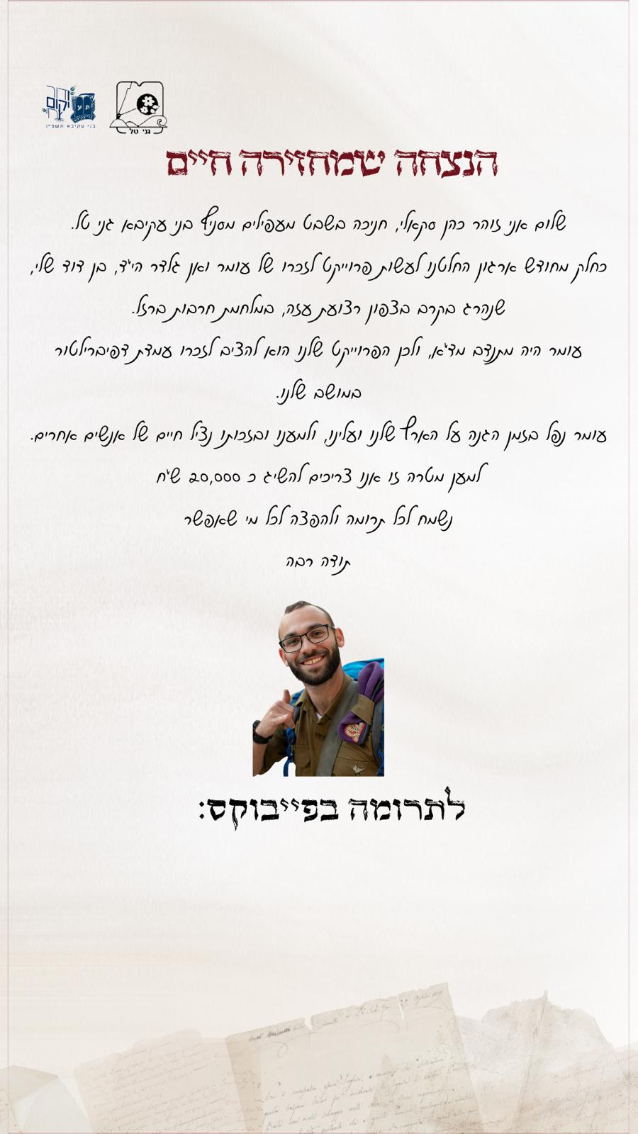תהילה וחגי, חינכתם אותו לערכים נתינה, ערכים של ראיית האחר ואהבת הזולת, של תרומה לכלל ישראל ואתם יכולים להיות גאים שהוא יישם את הערכים הללו בחייו הקצרים.